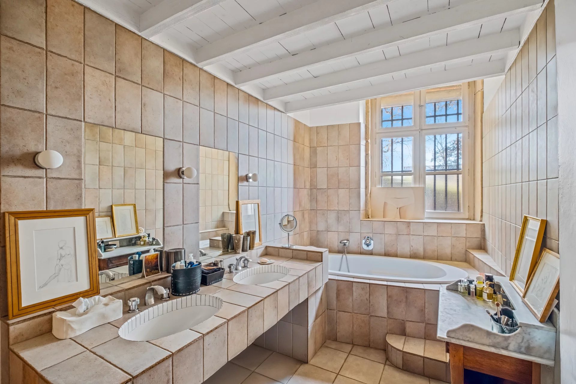 Un somptueux escalier en pierre mène au premier étage de la maison, où se dévoile un espace de vie chaleureux et convivial. Ce niveau abrite une vaste pièce de vie de 35 m² baignée de lumière, une élégante salle à manger, ainsi qu’une cuisine moderne entièrement équipée, conçue sur mesure par un artisan menuisier. Offrant des finitions de qualité, la cuisine dispose également d’un accès direct aux espaces extérieurs.