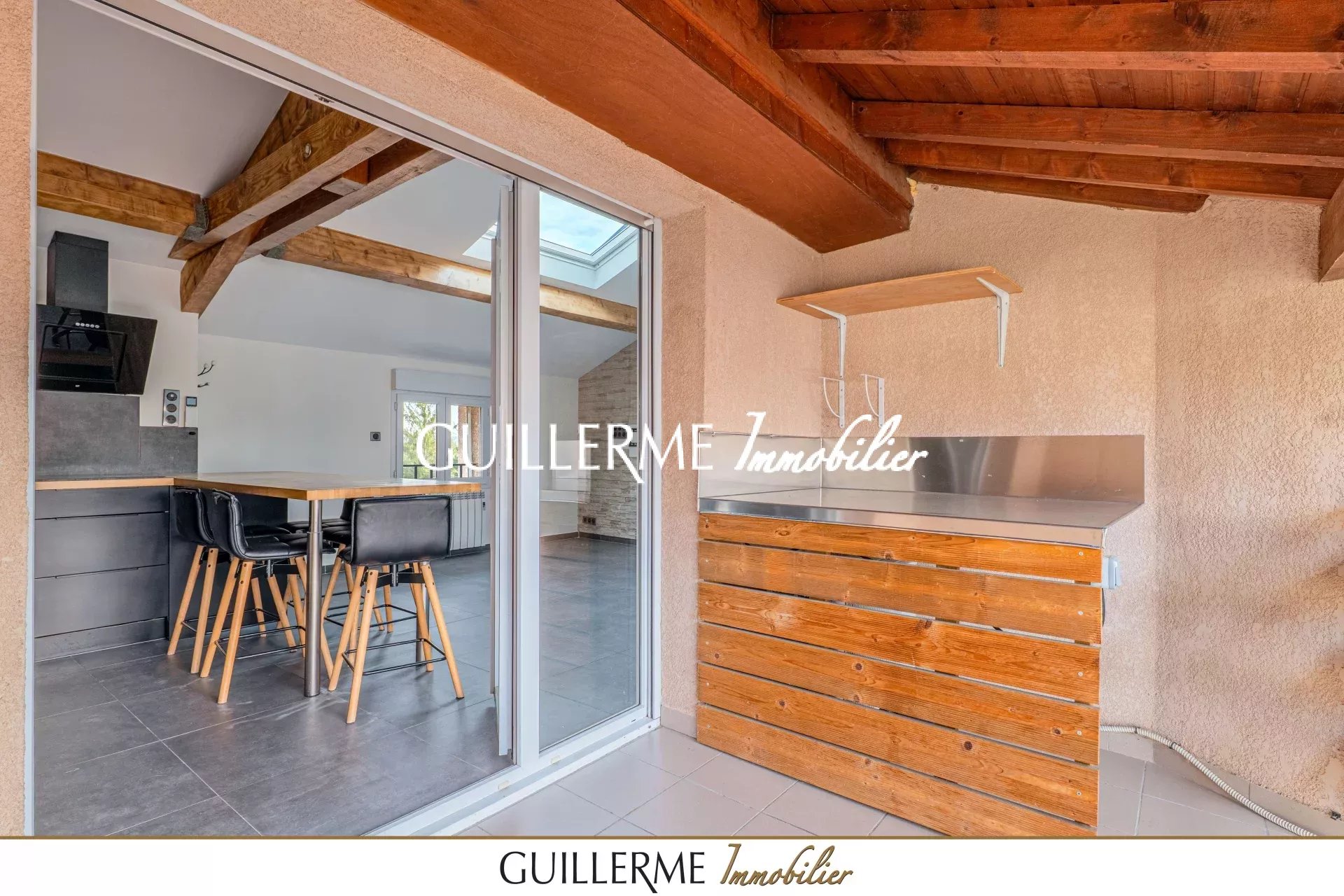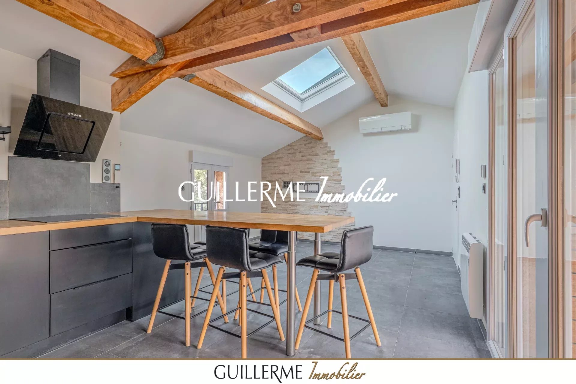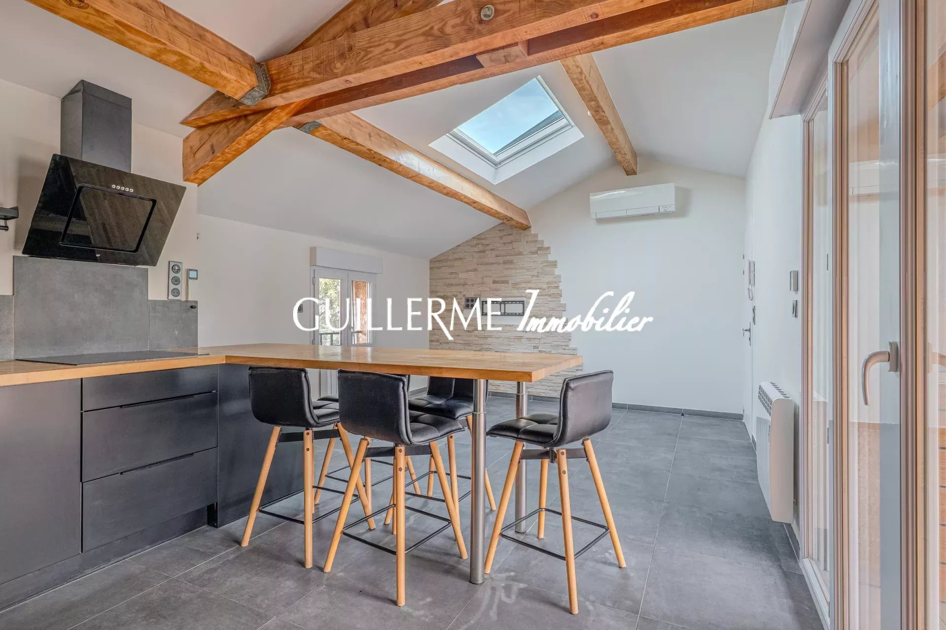 - Grande pièce de vie avec poutres apparentes et belle hauteur sous plafond, équipée d’un vaste Velux avec volet intégré. Une porte-fenêtre ouvre sur une terrasse exposée Sud, avec plan de travail sur-mesure idéal pour une plancha.