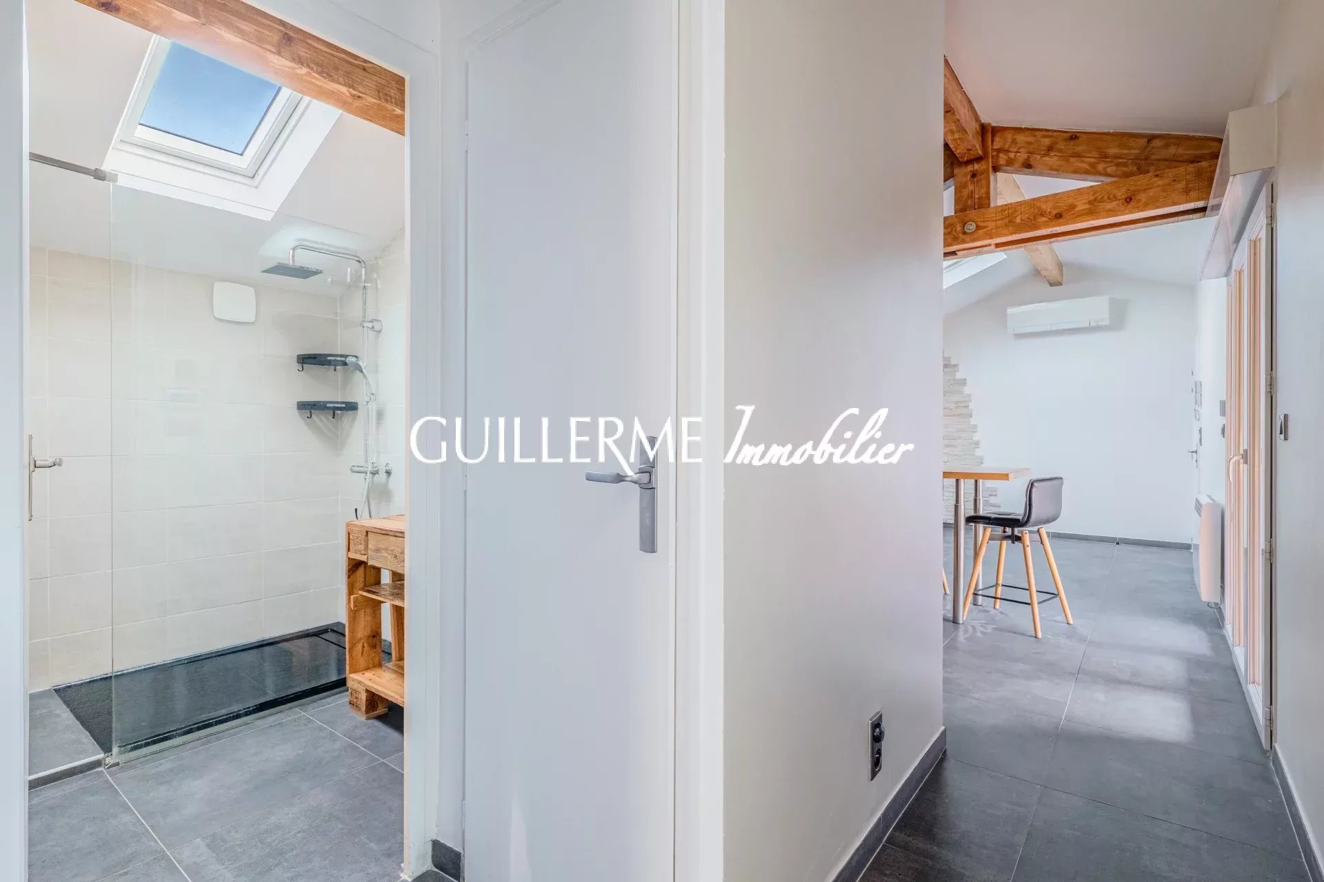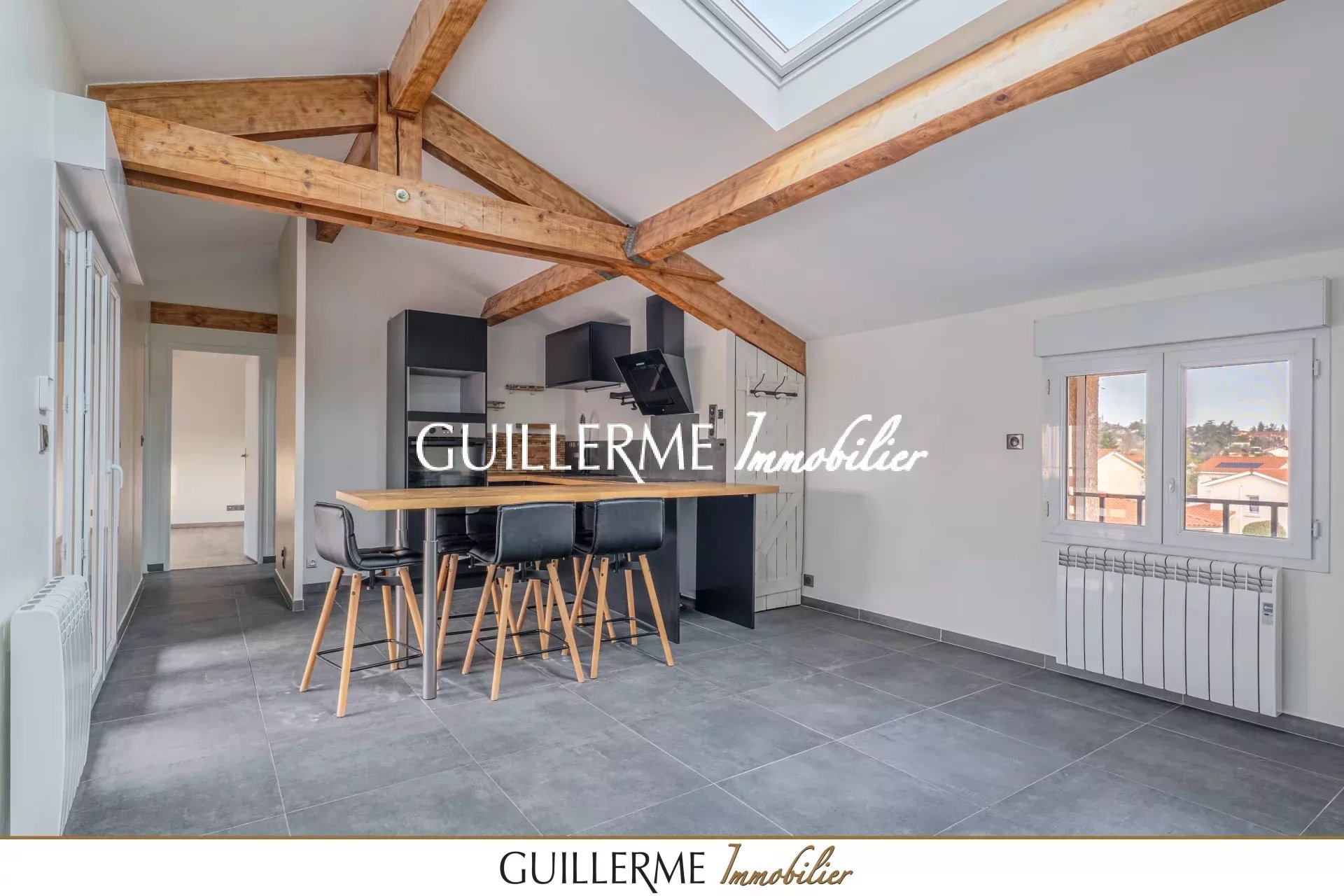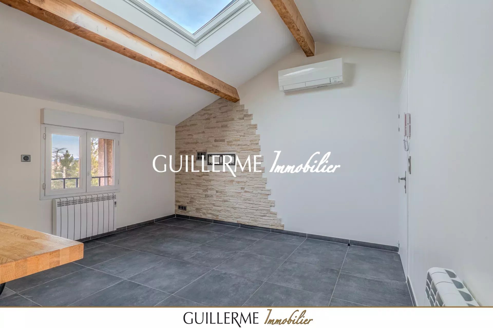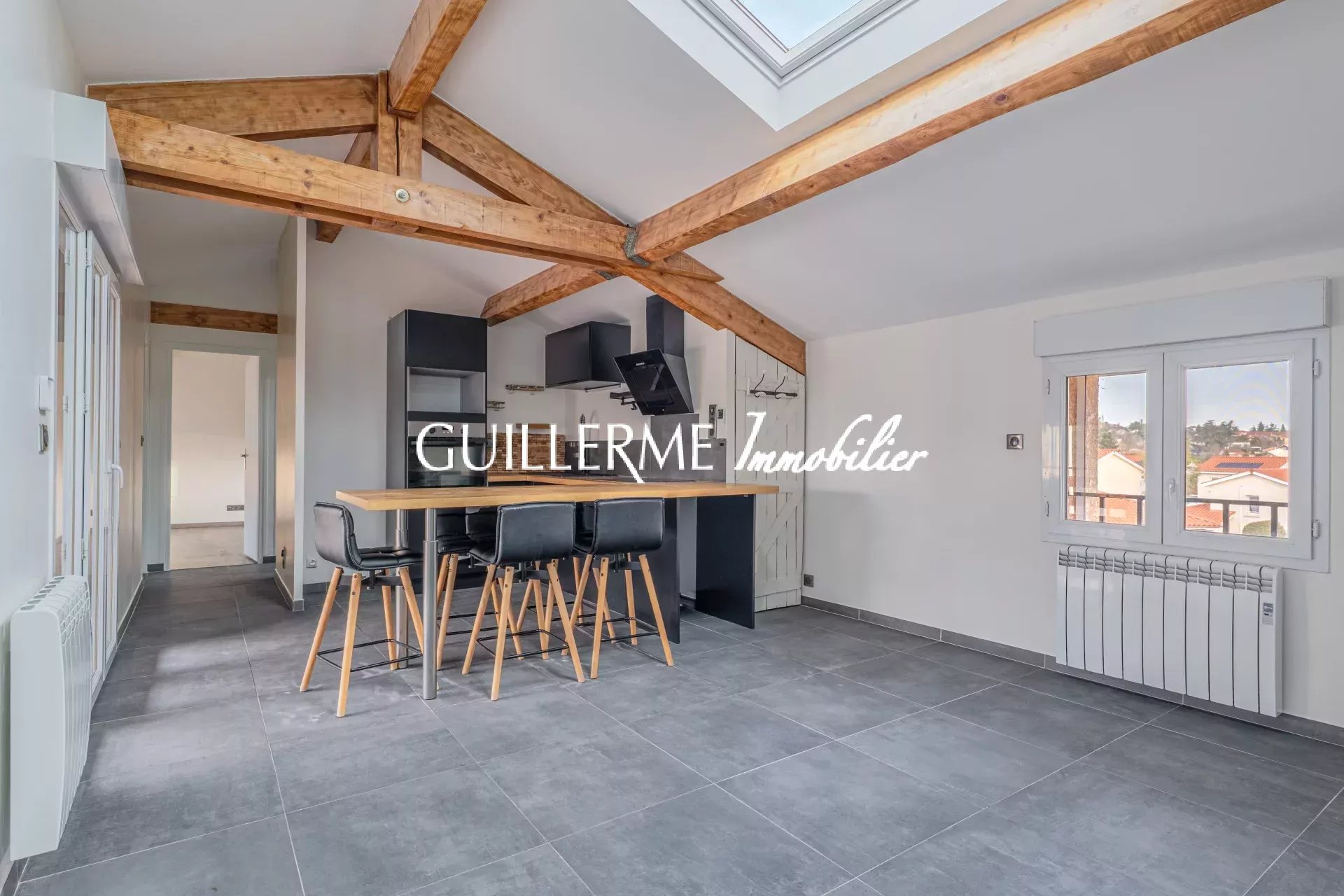 - Grande pièce de vie avec poutres apparentes et belle hauteur sous plafond, équipée d’un vaste Velux avec volet intégré. Une porte-fenêtre ouvre sur une terrasse exposée Sud, avec plan de travail sur-mesure idéal pour une plancha.