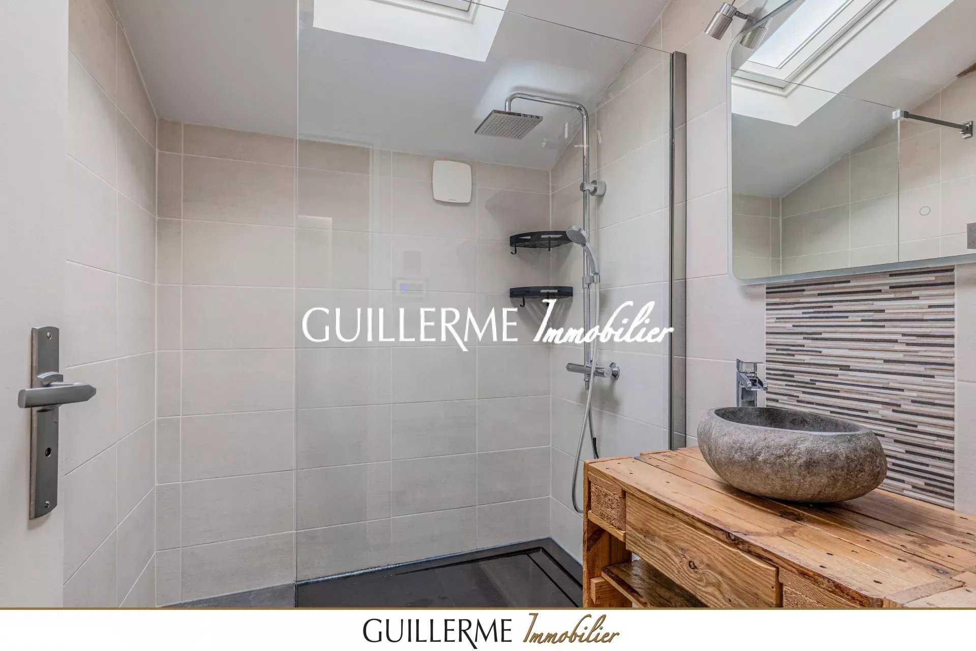 - Salle d’eau avec Velux : douche, meuble vasque en pierre, miroir lumineux, sèche-serviette et système audio intégré (radio/USB + enceintes plafond).