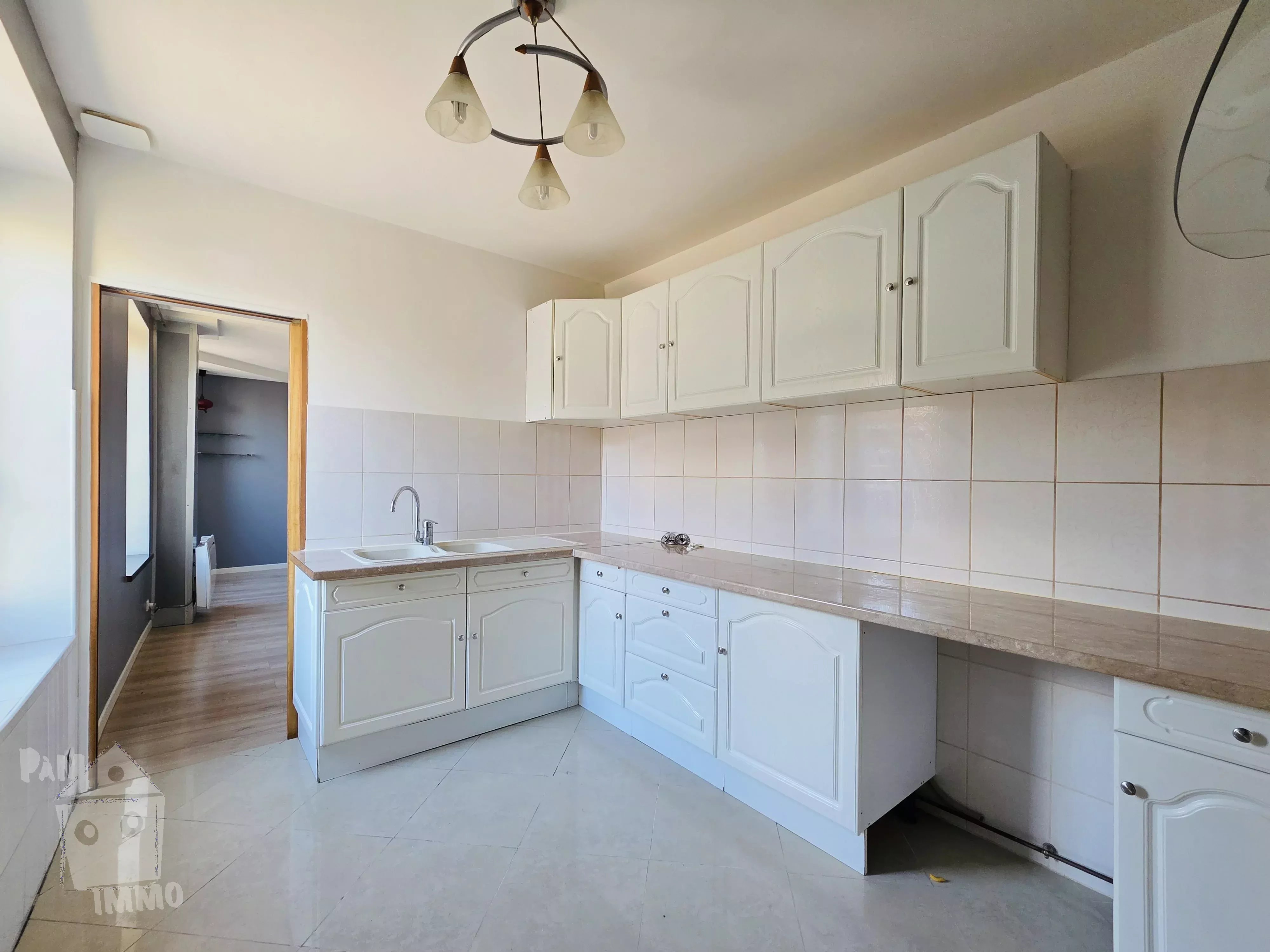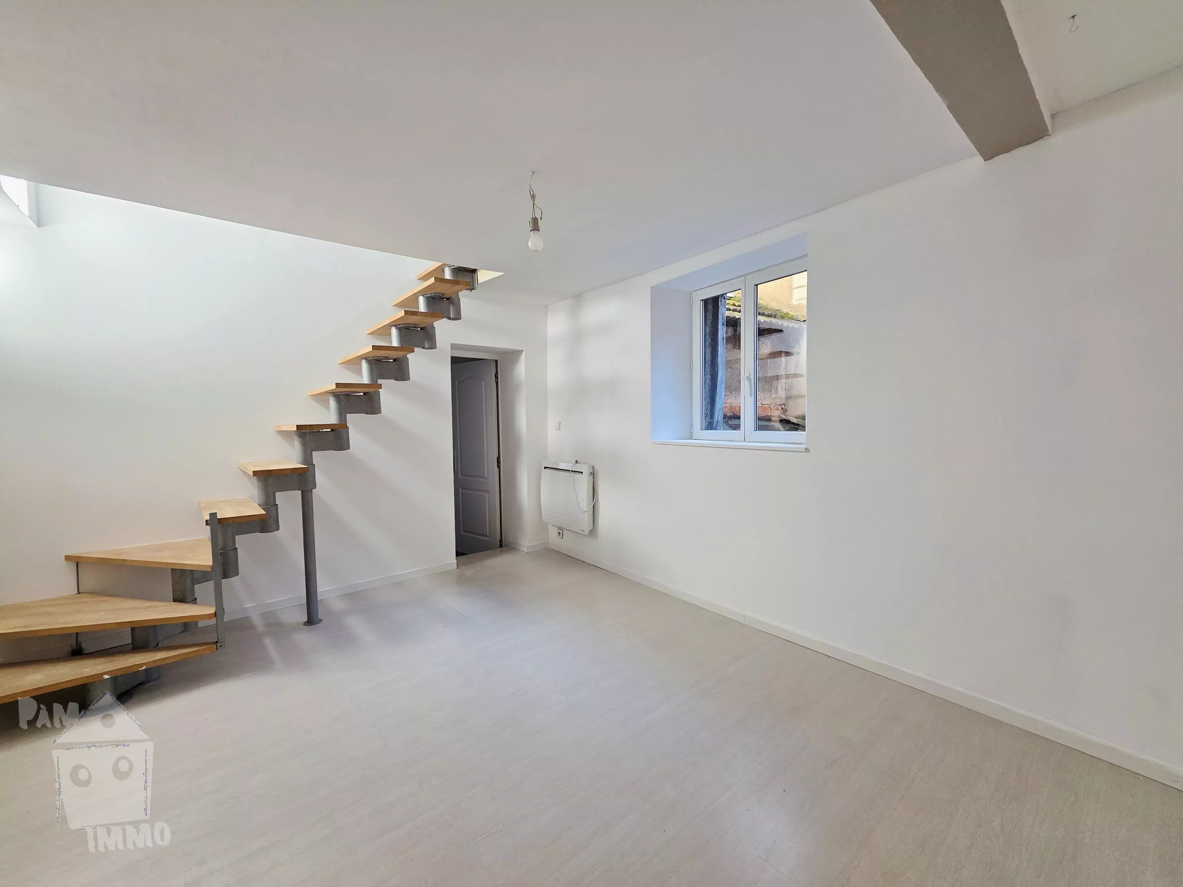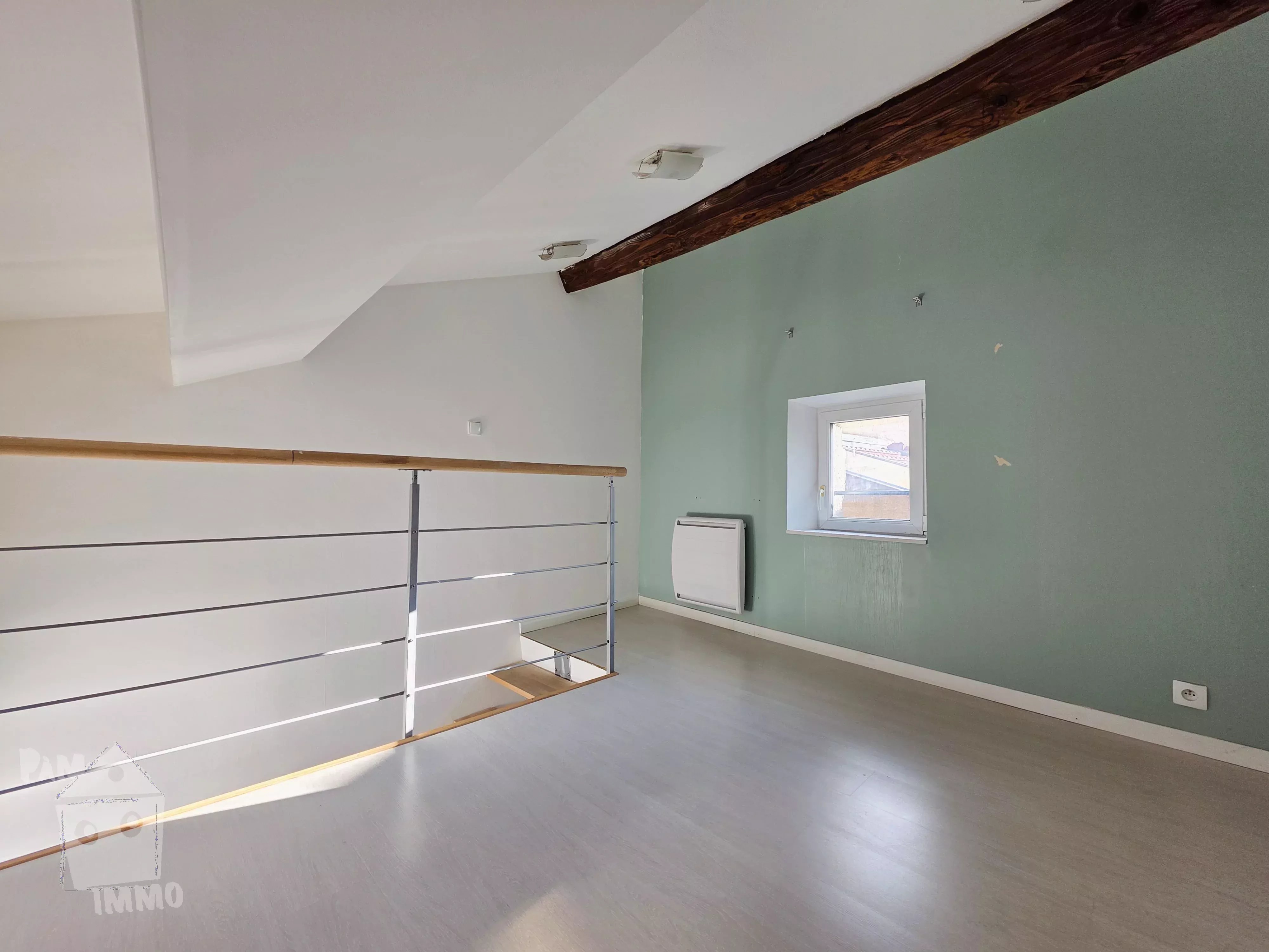 Au 1er étage F3 de 69.27 m², comprenant : beau séjour, cuisine aménagée, une chambre, un bureau en mezzanine, sde/wc, au-dessus grenier aménageable ; loué à 550 €