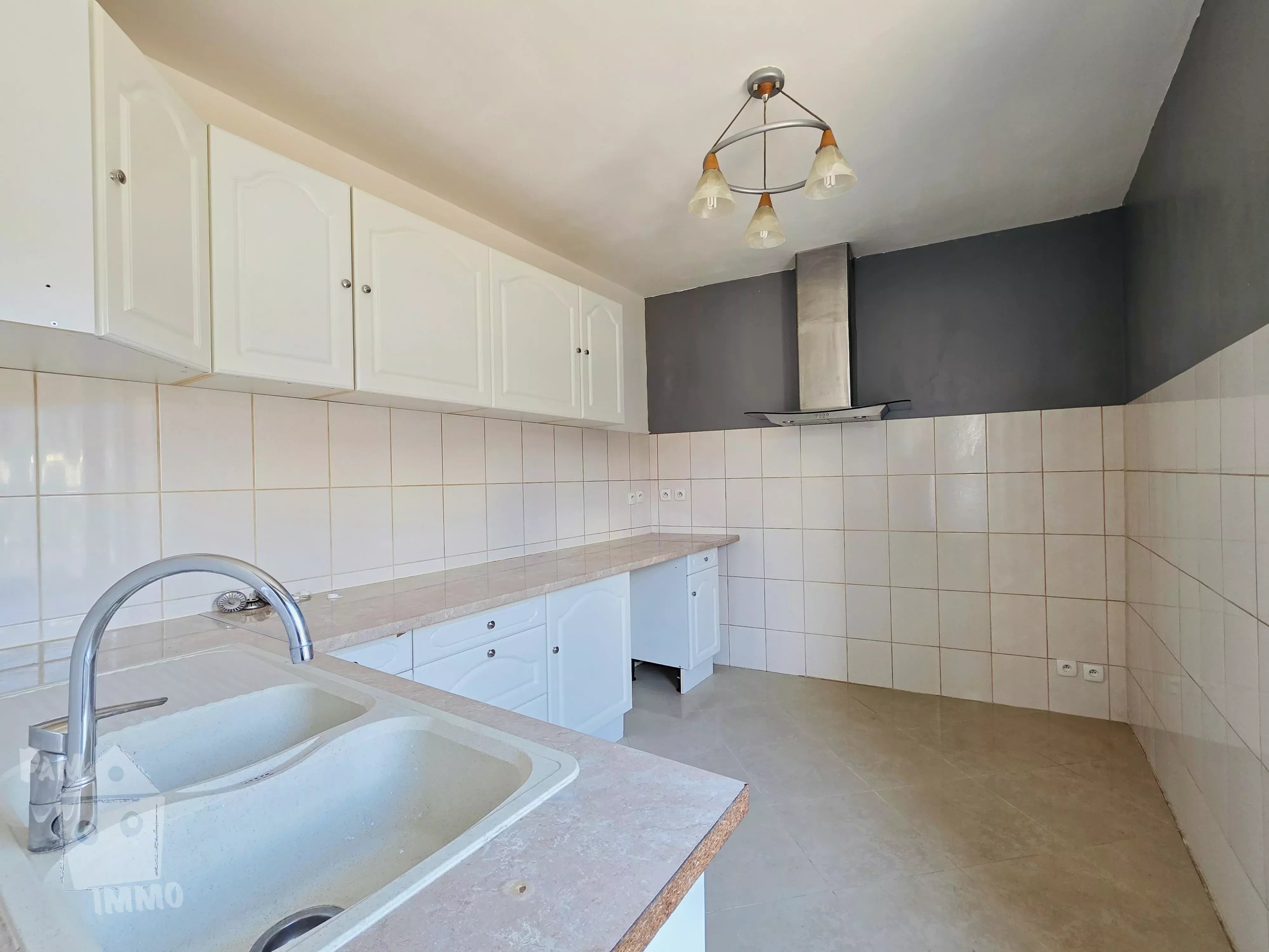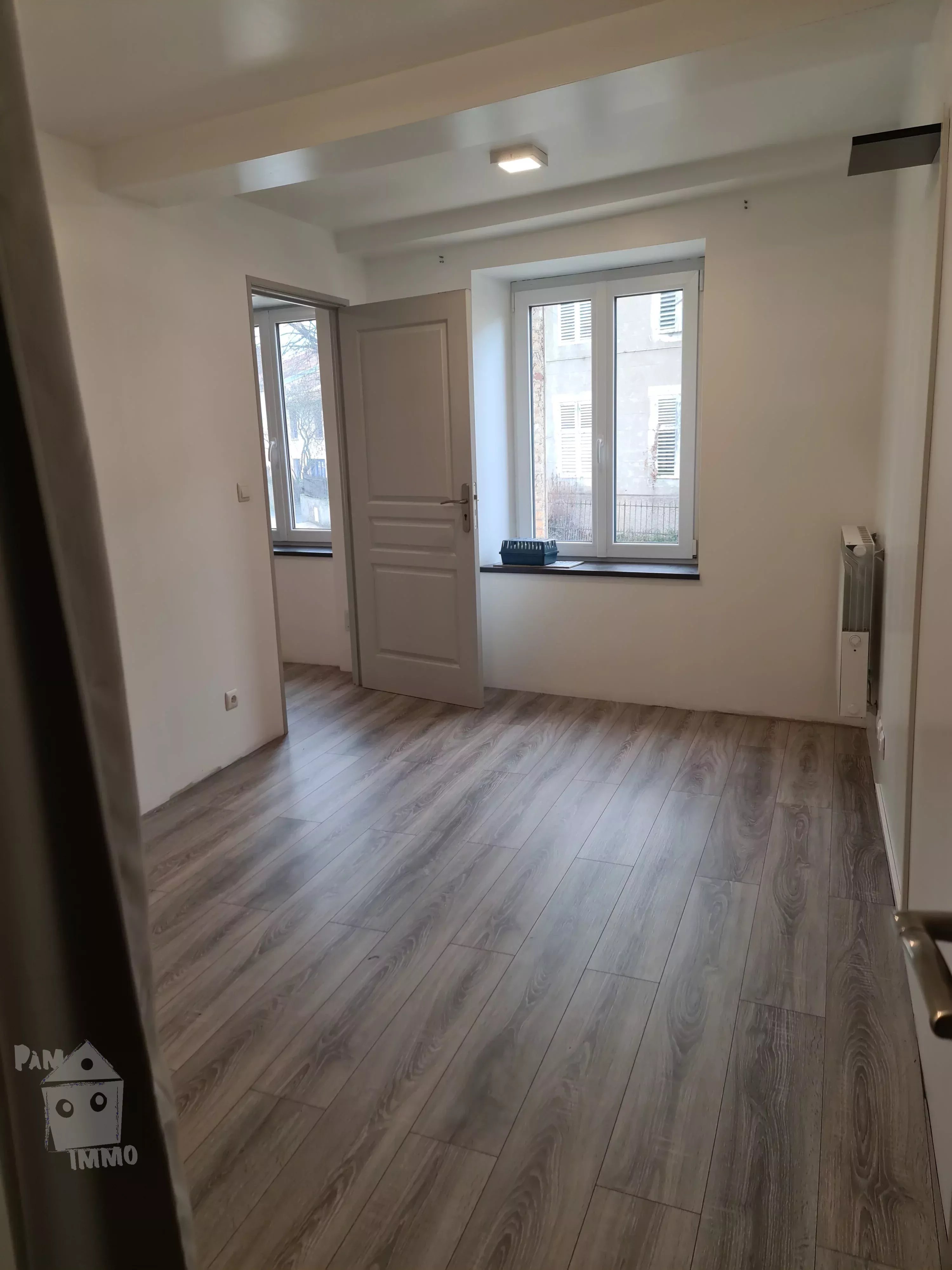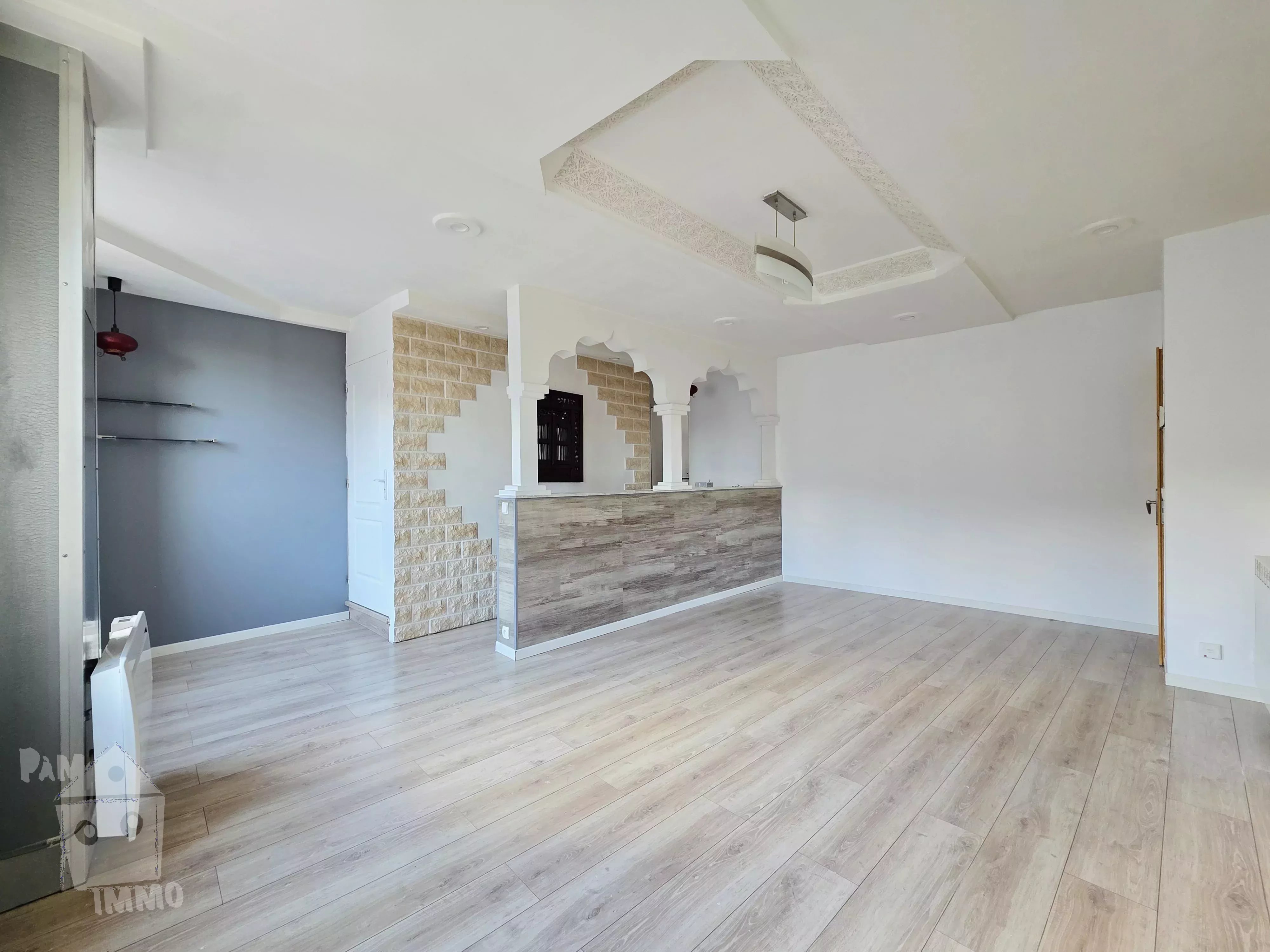 Au 1er étage F3 de 69.27 m², comprenant : beau séjour, cuisine aménagée, une chambre, un bureau en mezzanine, sde/wc, au-dessus grenier aménageable ; loué à 550 €