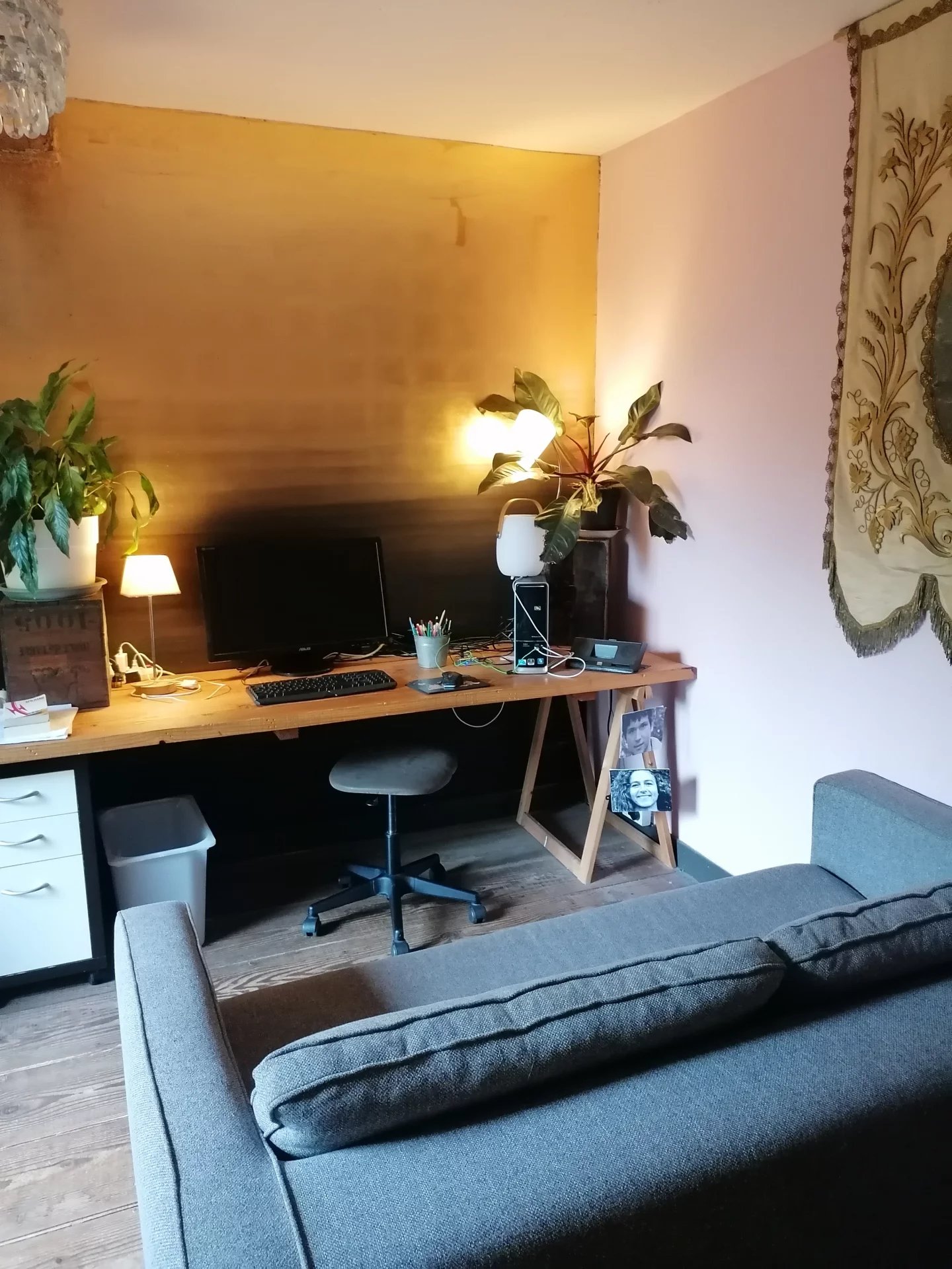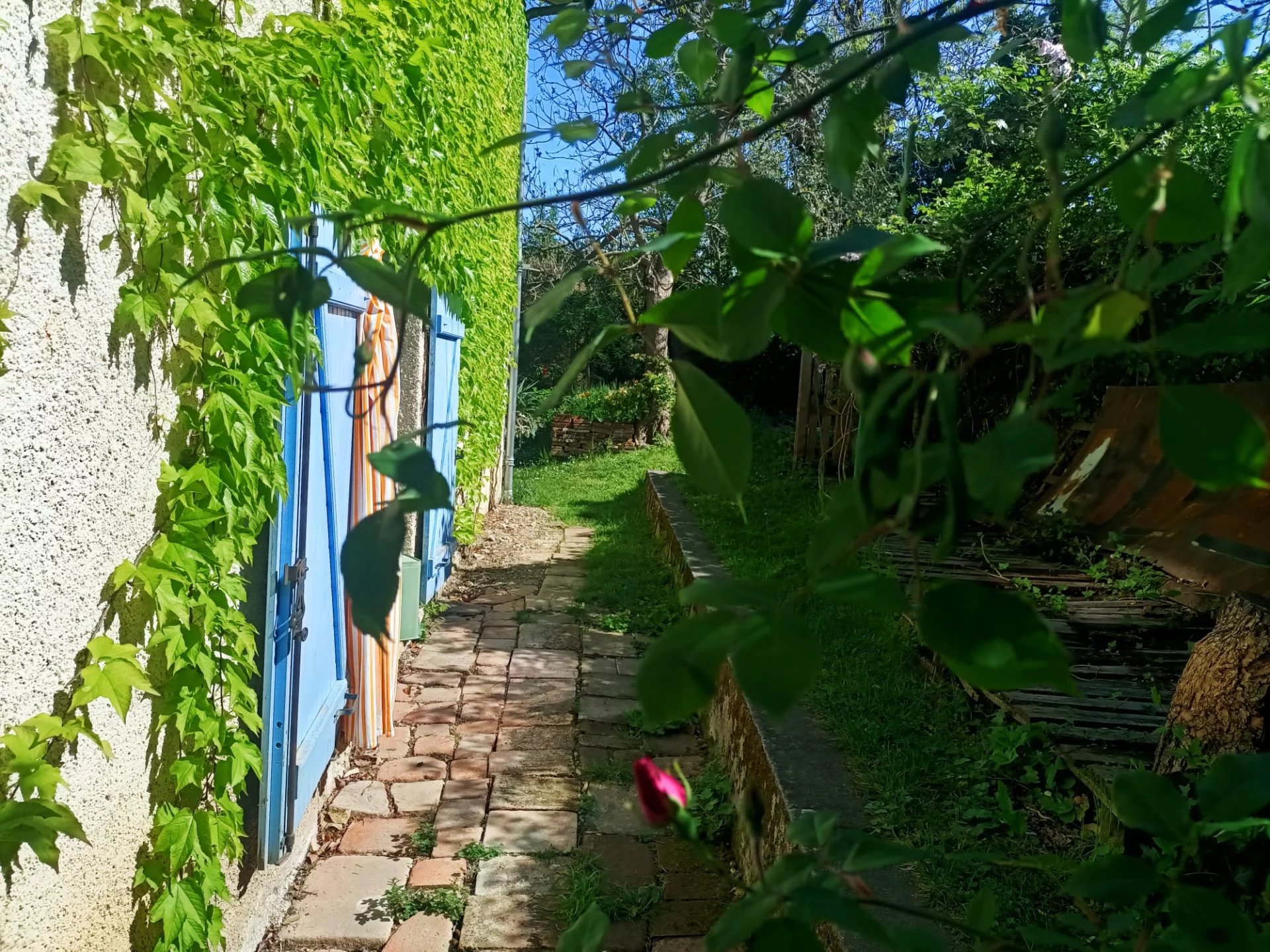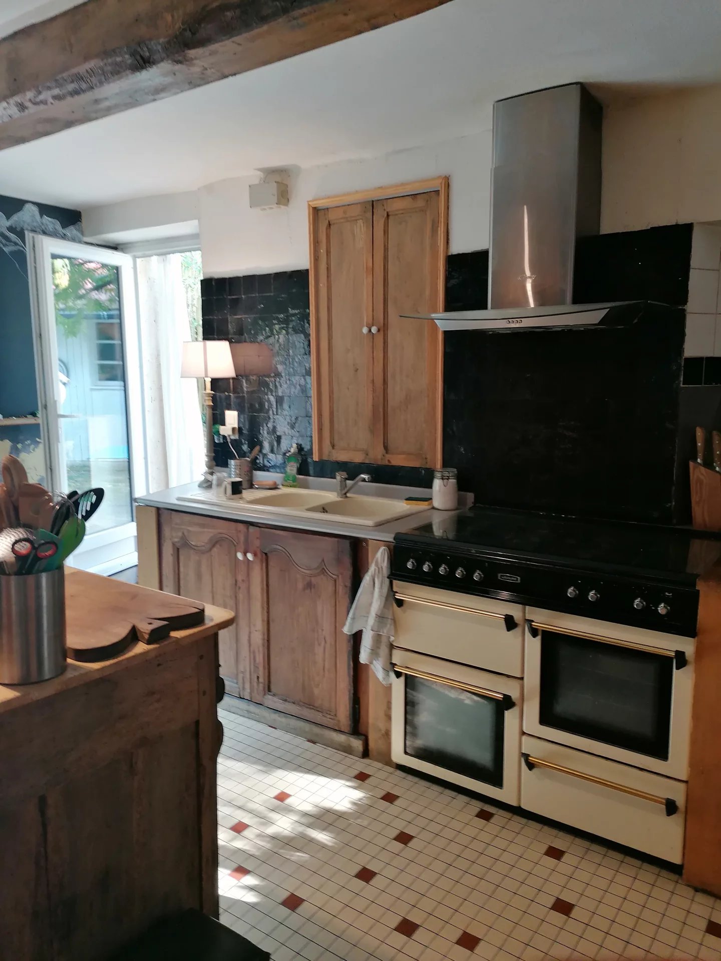 Elle se compose au rez-de-chaussée d'une cuisine bien aménagée et équipée, ouverte sur une pièce à vivre avec poêle à bois, d'une chambre actuellement bureau, d'une grande salle de bain et d'un WC séparé.