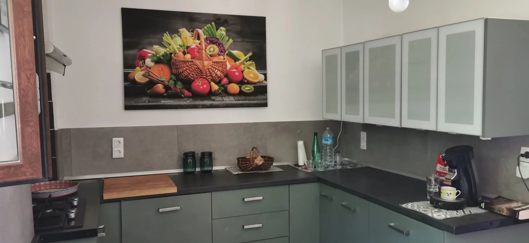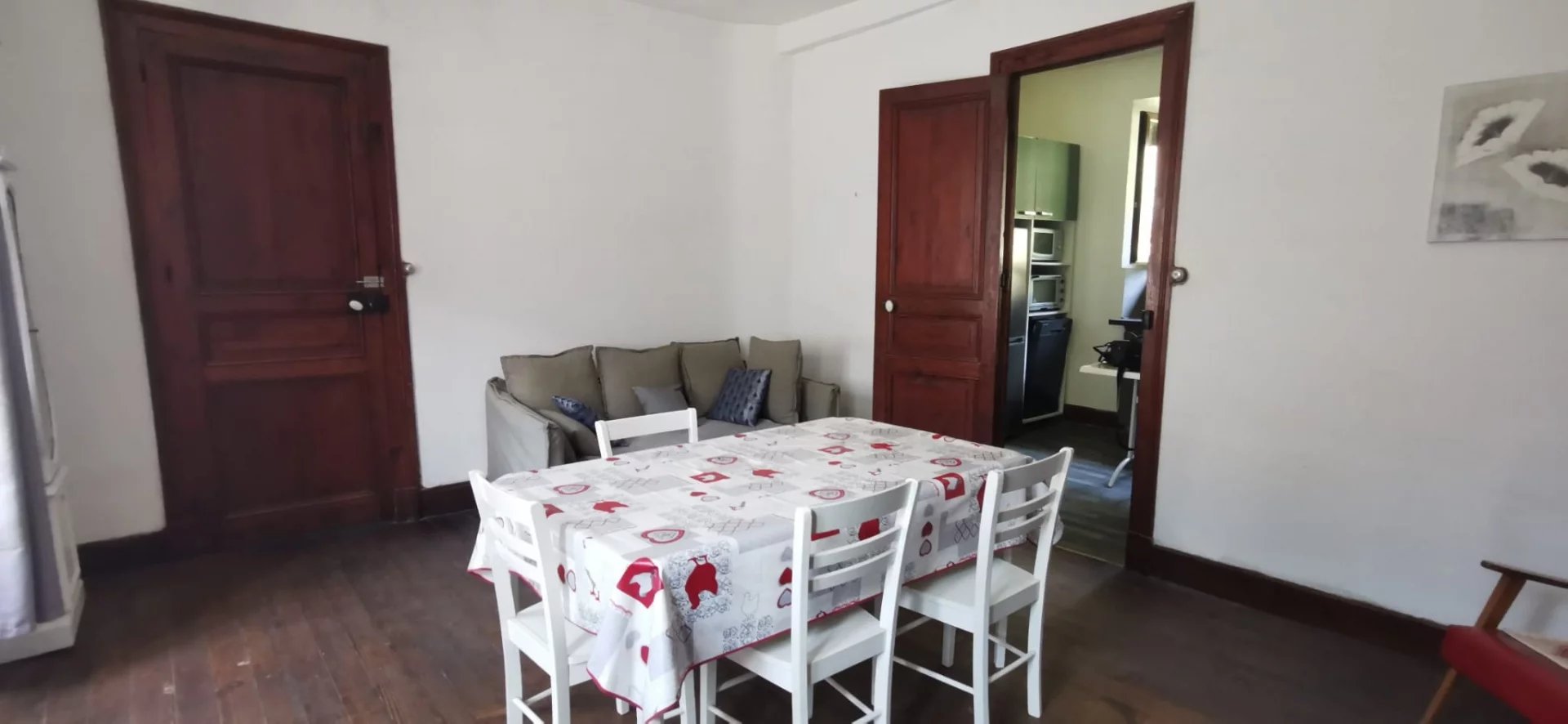 Entrée, cuisine entièrement équipée, séjour lumineux avec cheminée et poêle à bois, salle d???eau, WC séparé.