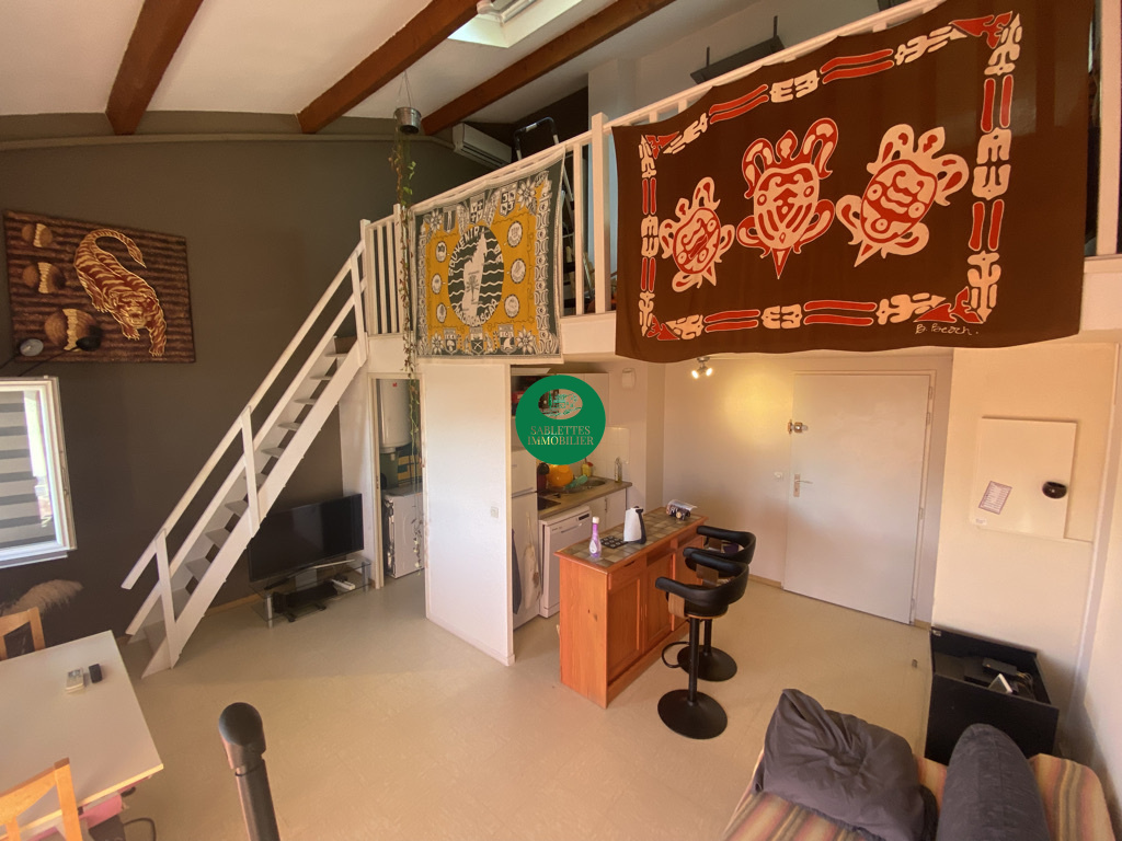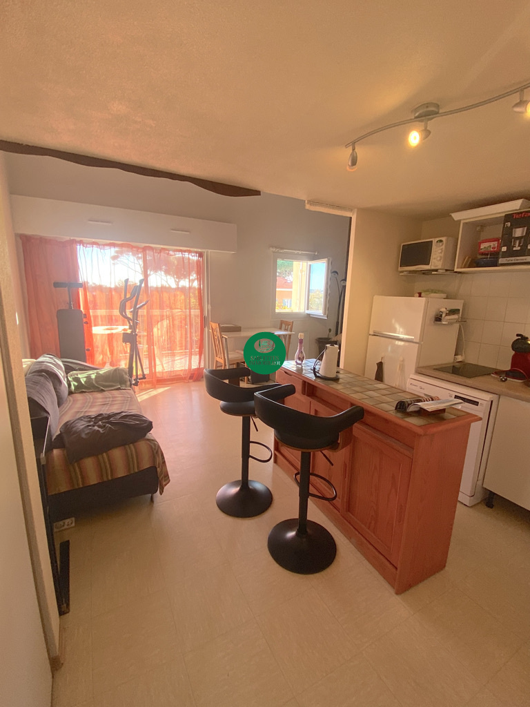 Dans une résidence fermée et sécurisée, charmant duplex meublé de 37.91 qui se compose d'une cuisine ouverte sur le séjour donnant sur une terrasse vue mer, une salle d'eau avec WC, et à l'étage une chambre avec rangement. À 2 minutes de l'embarcadère de Tamaris.