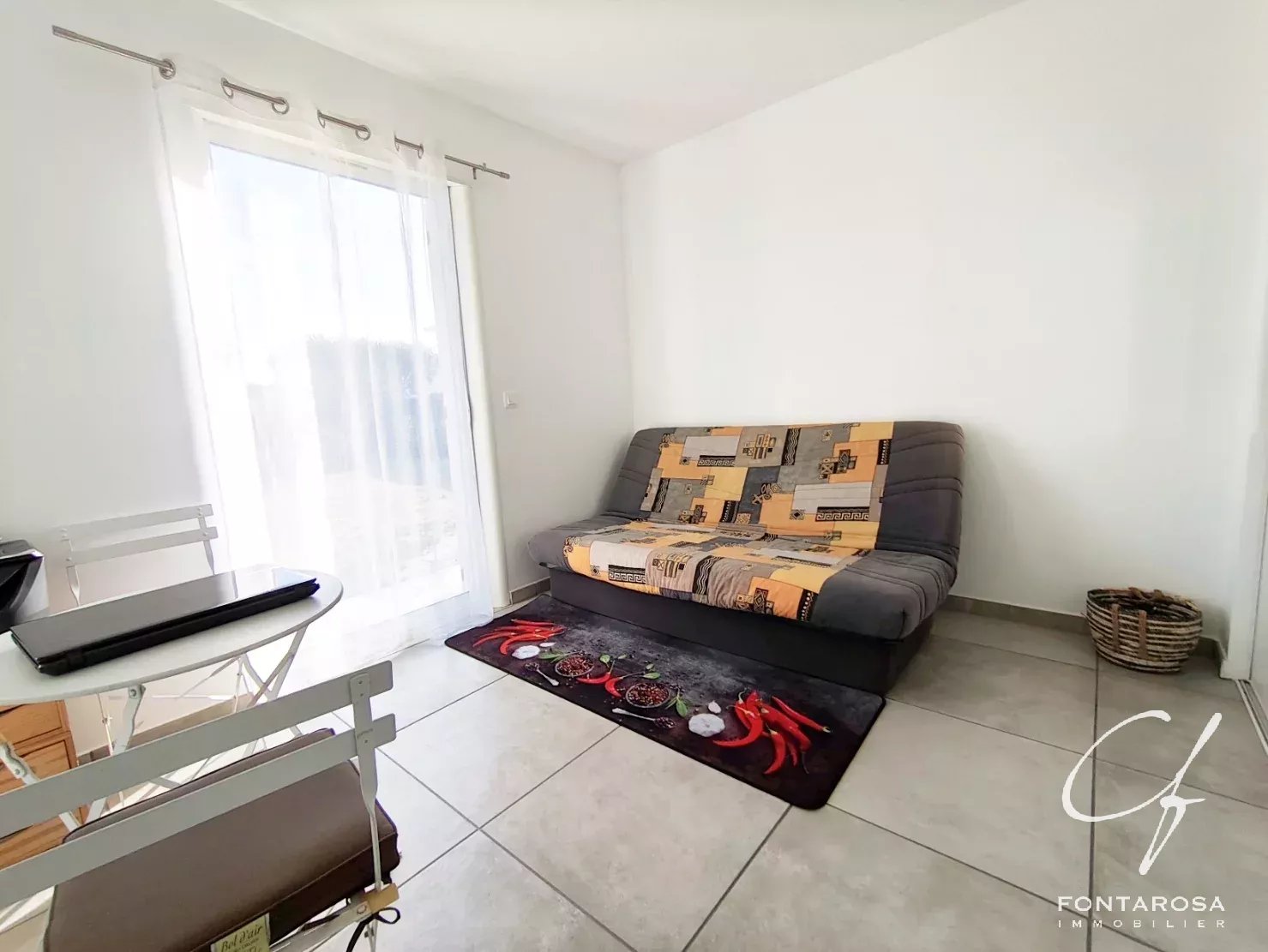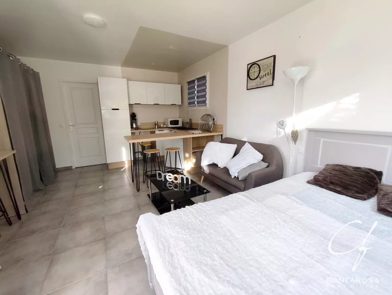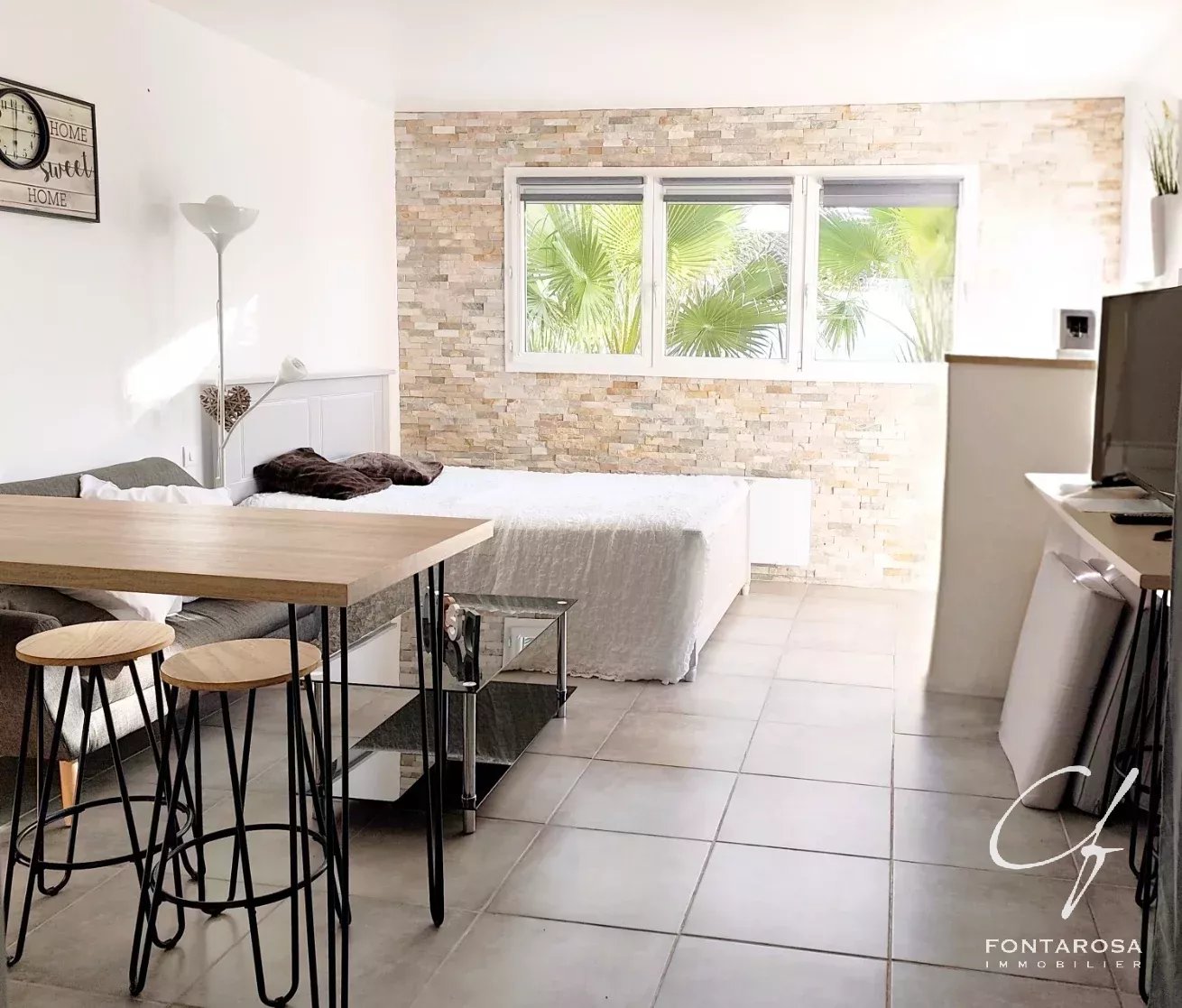 Il monolocale indipendente offre oltre 25 m² di luce e funzionalità, composto da un soggiorno con cucina e zona notte, un bagno con servizi igienici, un giardino privato e un ampio solarium.
