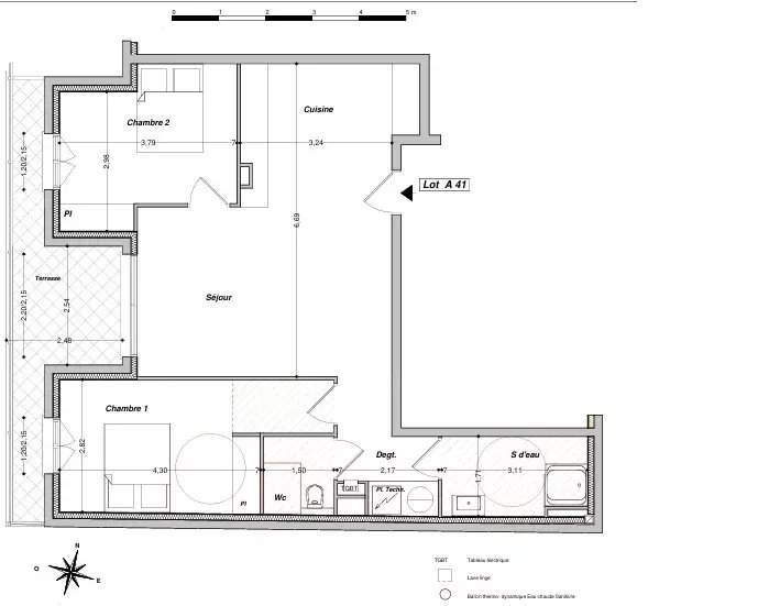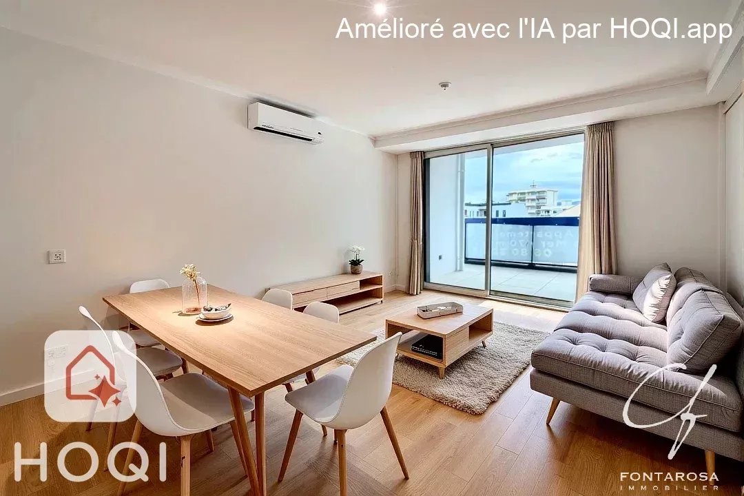È composto da un luminoso soggiorno con cucina a vista, che si apre su una piacevole terrazza di 10 m². La zona notte comprende due camere da letto con armadi a muro, un bagno con doccia e una toilette separata.