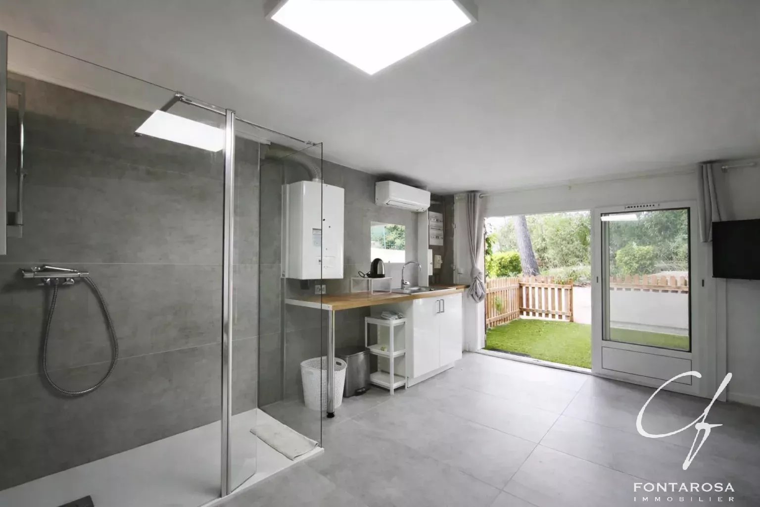 Une pièce complémentaire de 18 m² avec kitchenette et salle d’eau/WC, idéale pour un studio ou un espace indépendant supplémentaire.