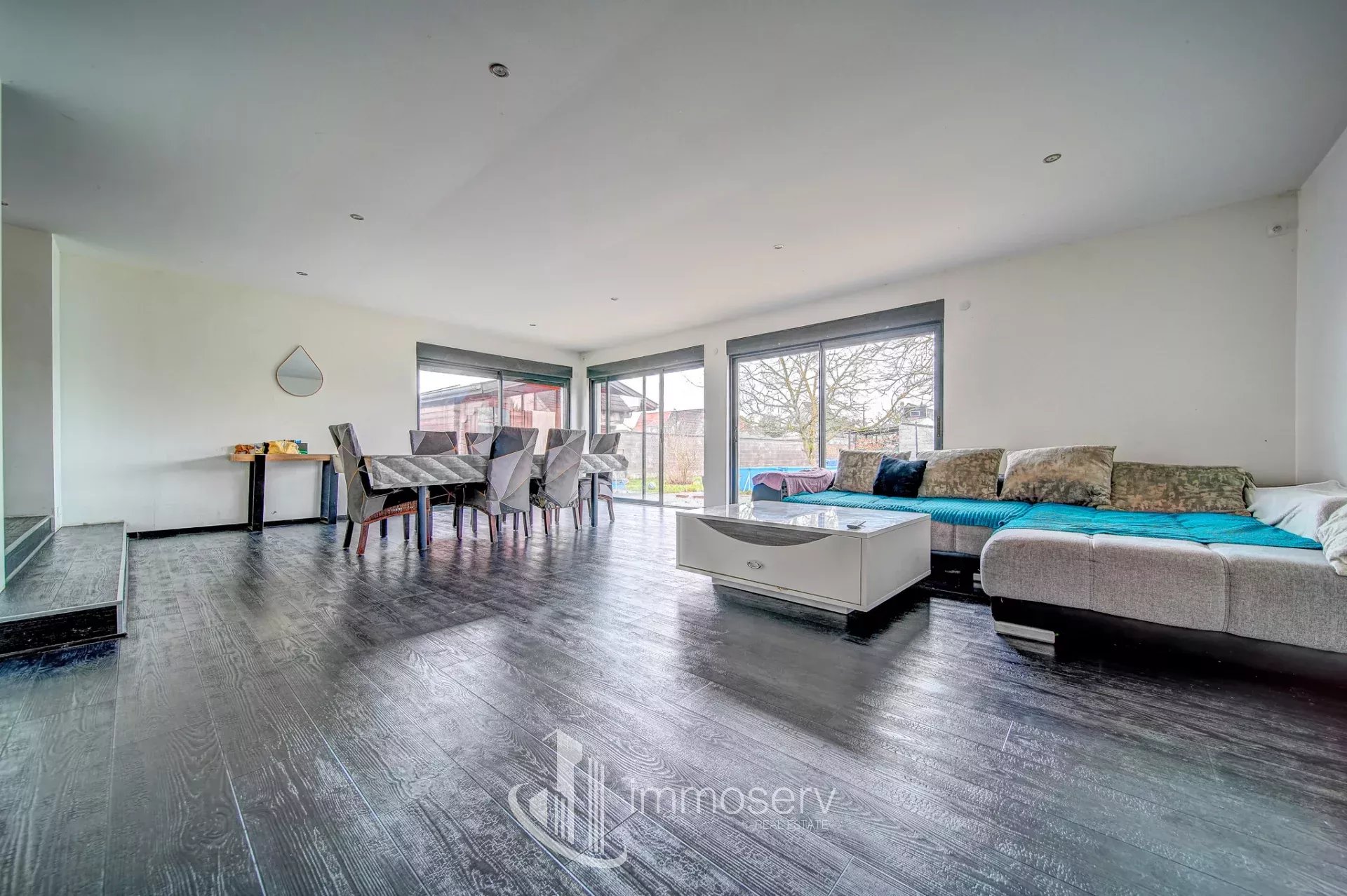 Belle pièce de vie avec baie vitrée sur jardin