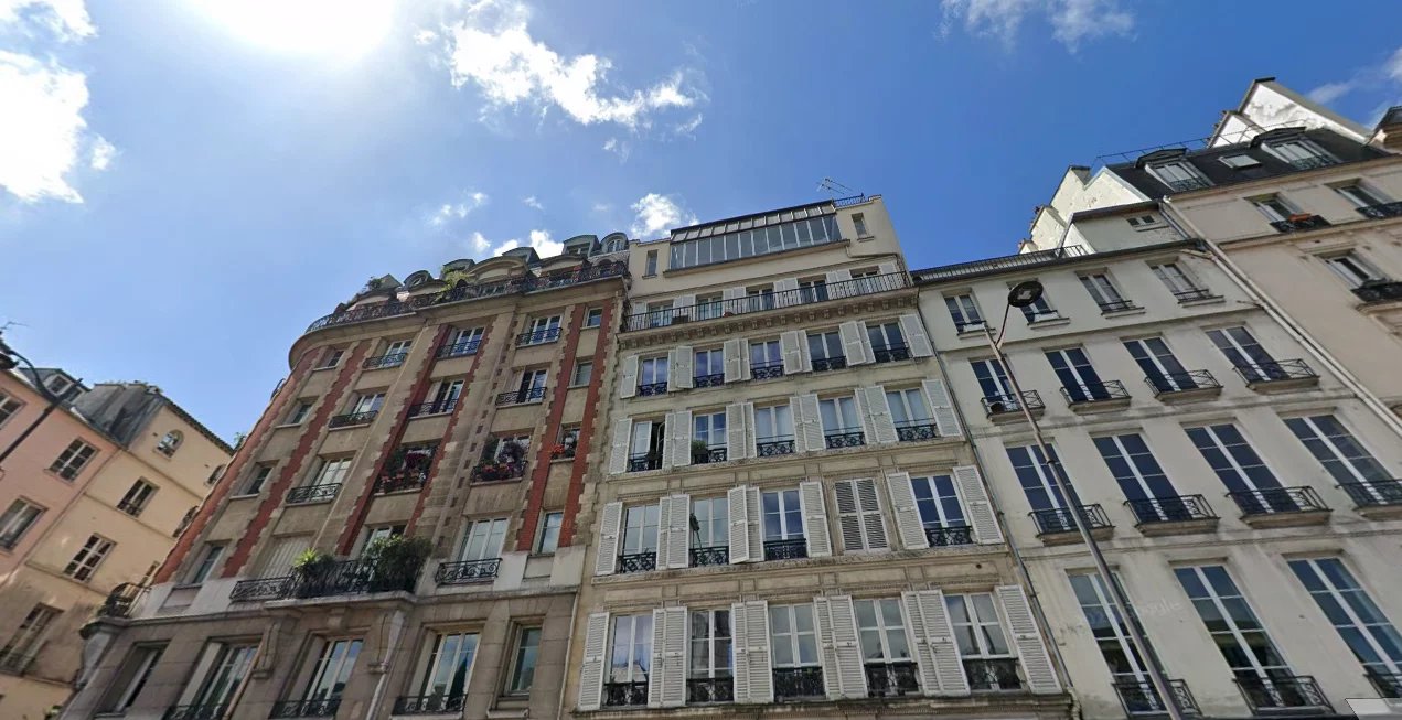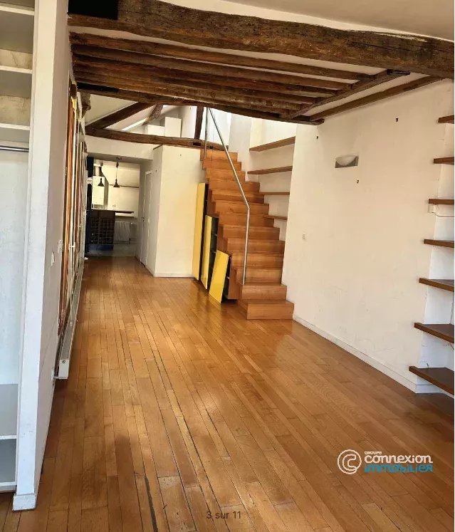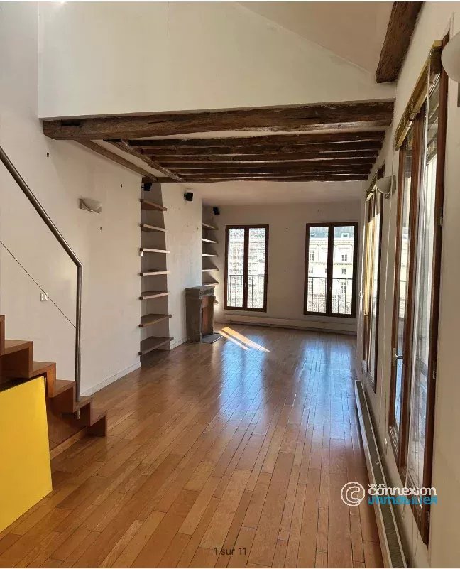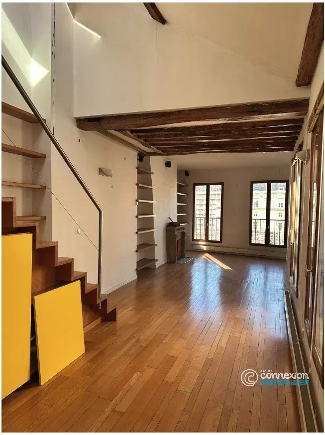 Vaste pièce de vie baignée de lumière, au 5 eme par ascenseur d’un immeuble ancien, cet atelier d’artiste bénéficie d’un panorama spectaculaire sur Paris, du Louvre à Notre-Dame et d'un balcon qui permet de profiter de cette vue époustouflante.