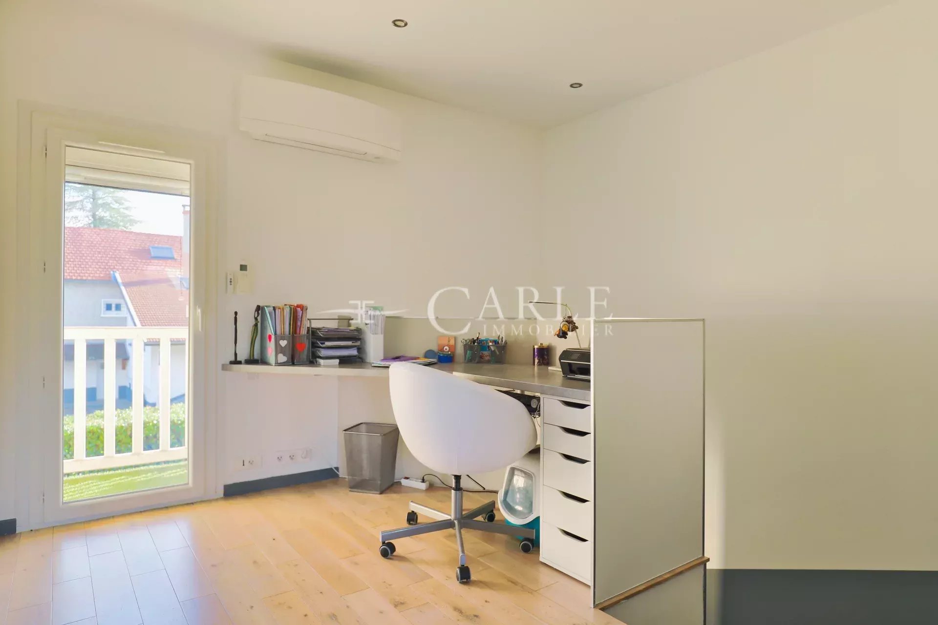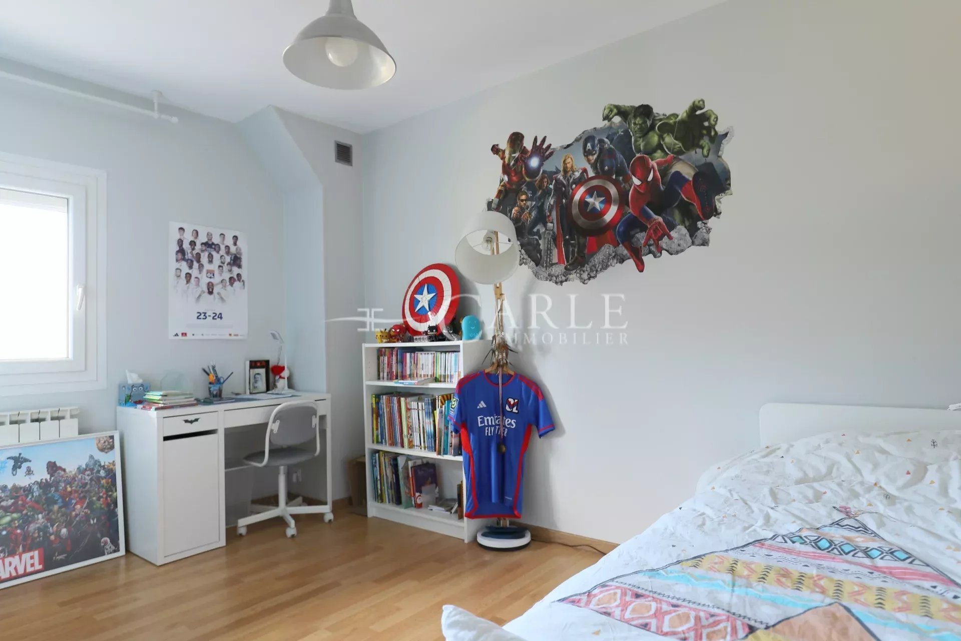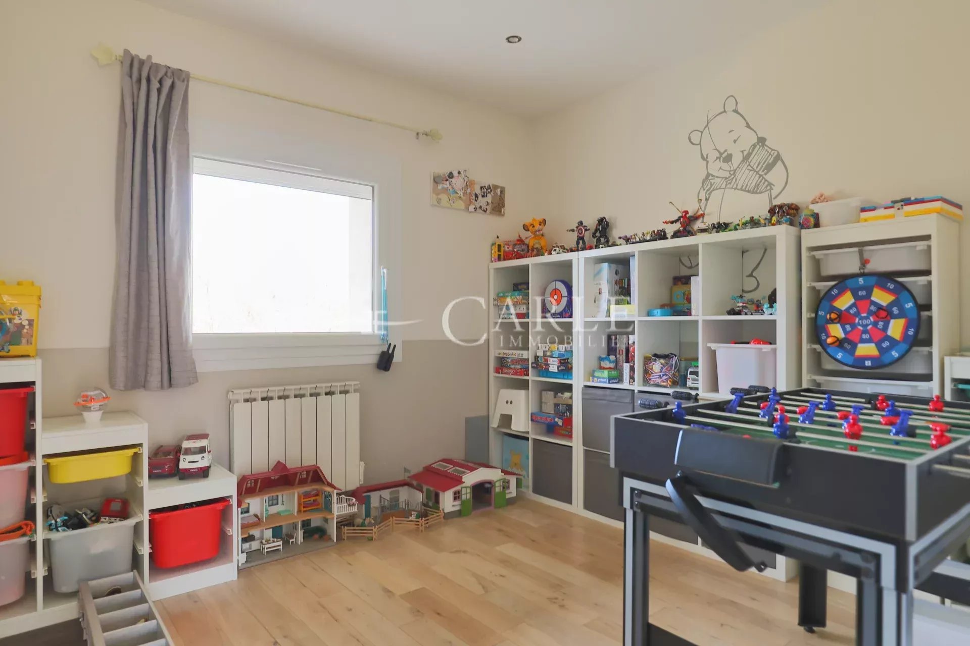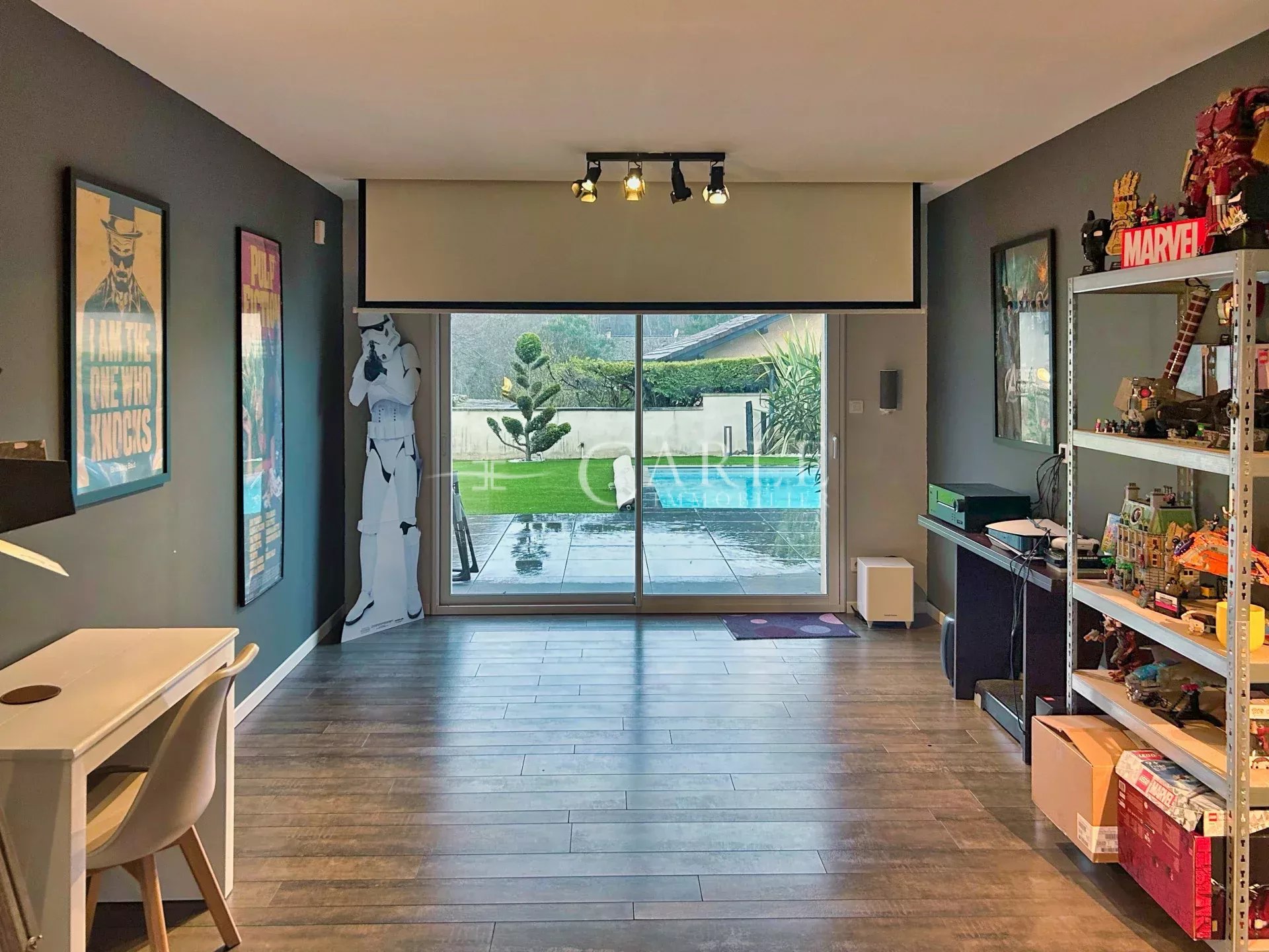 Au rez-de-chaussée se trouvent également une buanderie, un espace de rangement et une salle cinéma, aisément réversible selon les besoins : salle de jeux, bureau, chambre d’appoint ou studio.