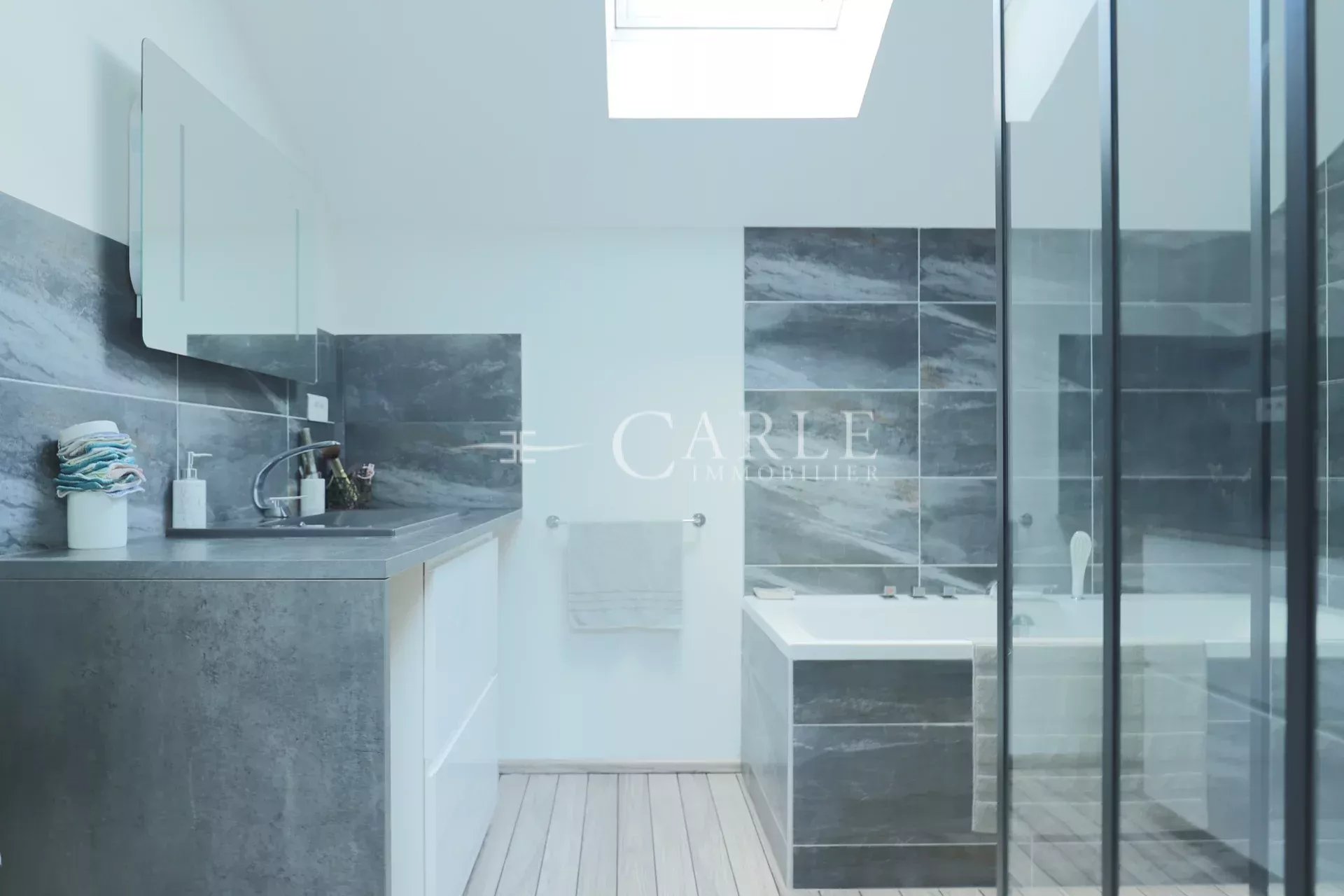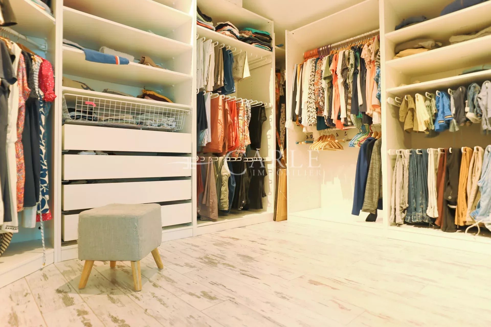À l’étage, une magnifique suite parentale de plus de 34 m² occupe une partie du niveau, avec son plafond à la française qui lui confère un charme authentique. Elle dispose de sa salle de bain privée, équipée d’une douche et d’une baignoire, ainsi que d’un dressing spacieux. Trois autres chambres complètent cet étage, accompagnées d’une seconde salle de bain dédiée et d’un espace ouvert idéal pour un bureau ou un coin détente. L’ensemble de l’étage bénéficie d’un système de climatisation pour un confort optimal, et un espace de rangement indépendant d’environ 13 m² vient s’ajouter à la fonctionnalité du niveau.
