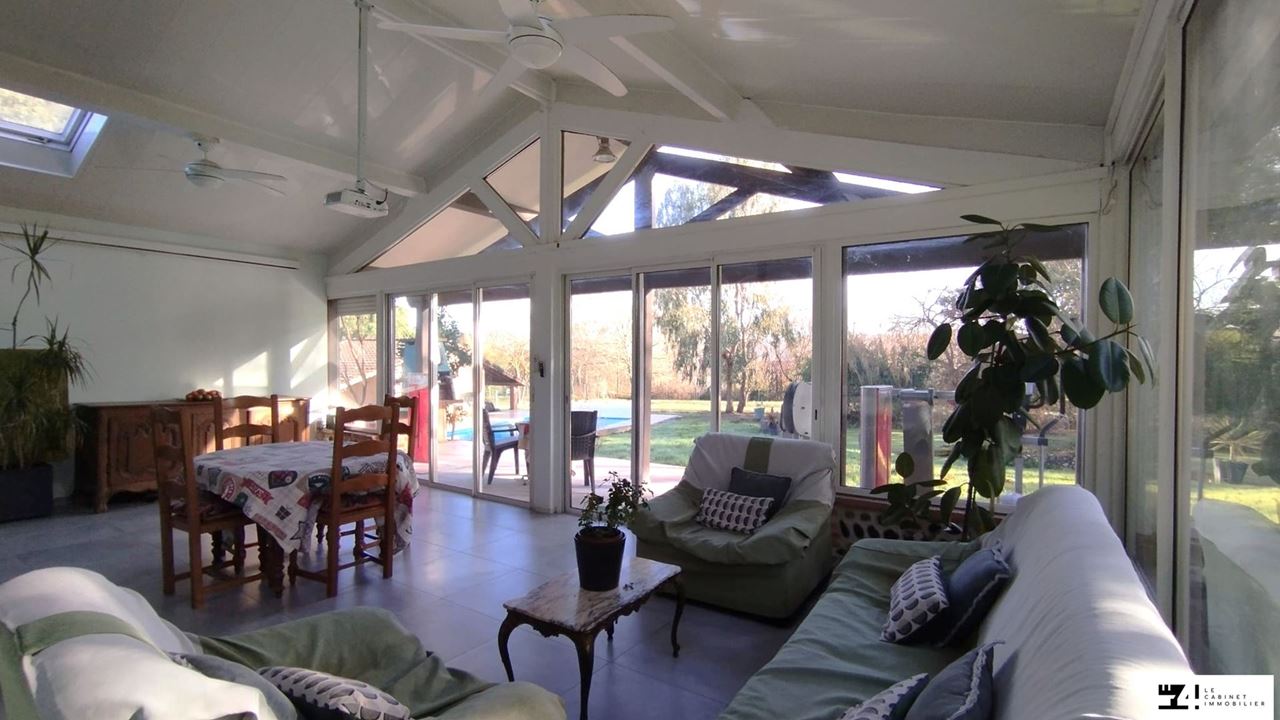 À lintérieur, la maison propose de beaux volumes lumineux. La pièce de vie de plus de 54 m², avec cuisine équipée et aménagée, est agrémentée dune cheminée. Elle se prolonge par une véranda chauffée, équipée dun poêle à pellets et dun vidéoprojecteur avec écran, ouverte sur le parc et offrant un espace de vie supplémentaire confortable en toutes saisons.