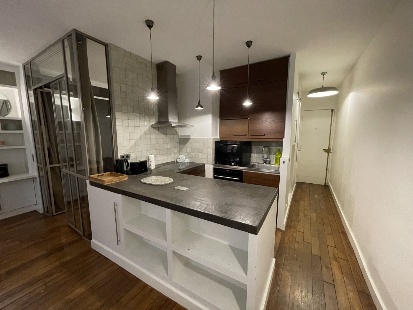 Il se compose d'une entrée, d'une grande pièce de vie avec cuisine américaine toute équipée, d'une chambre sur cour avec de nombreux rangements, d'une salle de bains intégrée dans une verrière et de WC séparés. Doté de fenêtres en double vitrage, de parquet au sol et de rangements sur mesure. L'eau chaude et le chauffage sont individuels électriques.