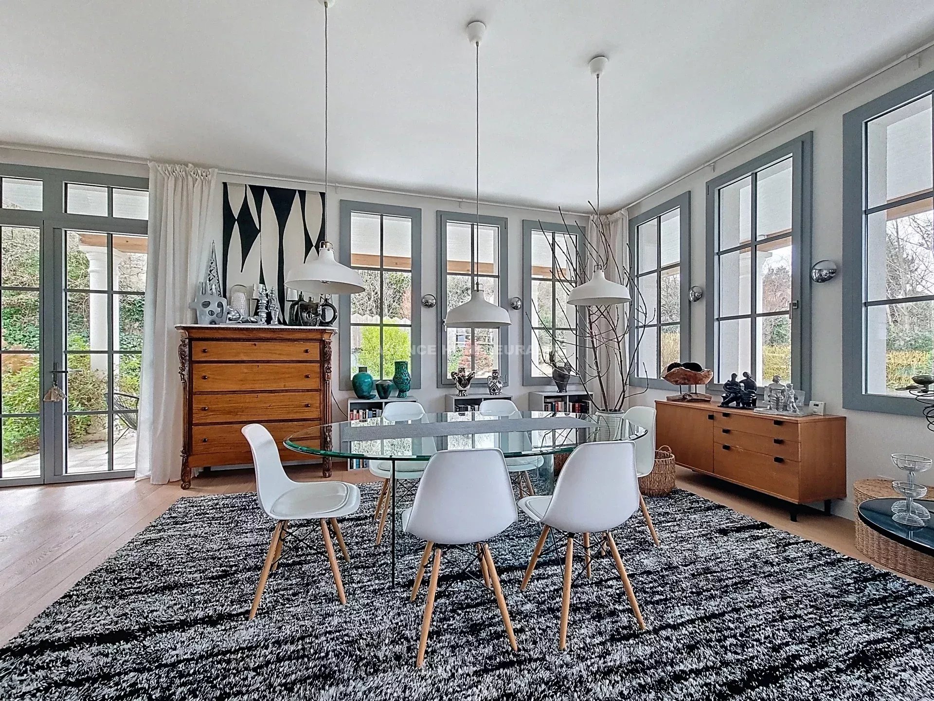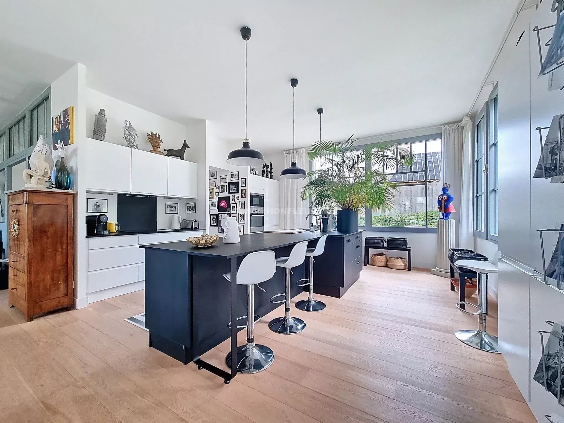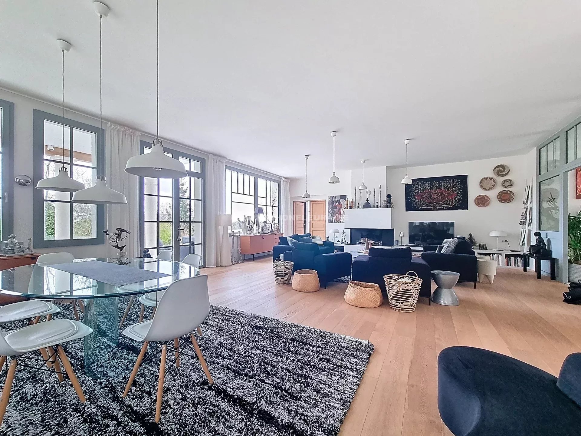 Vaste entrée, très grande pièce (98 m²) baignée de lumière avec hauteur sous-plafond de 3 m comprenant cuisine ouverte, salle à manger, salon avec cheminée ;