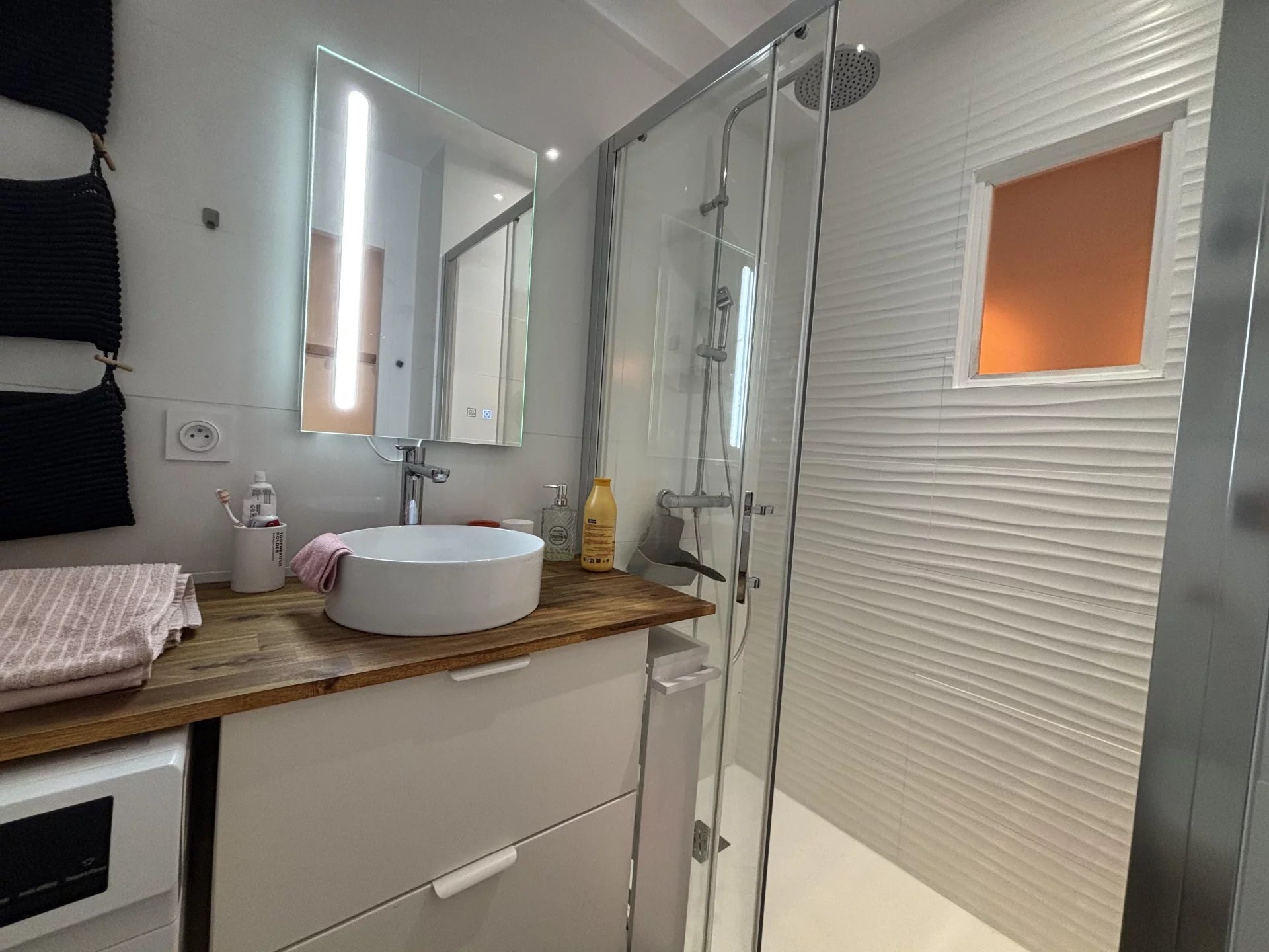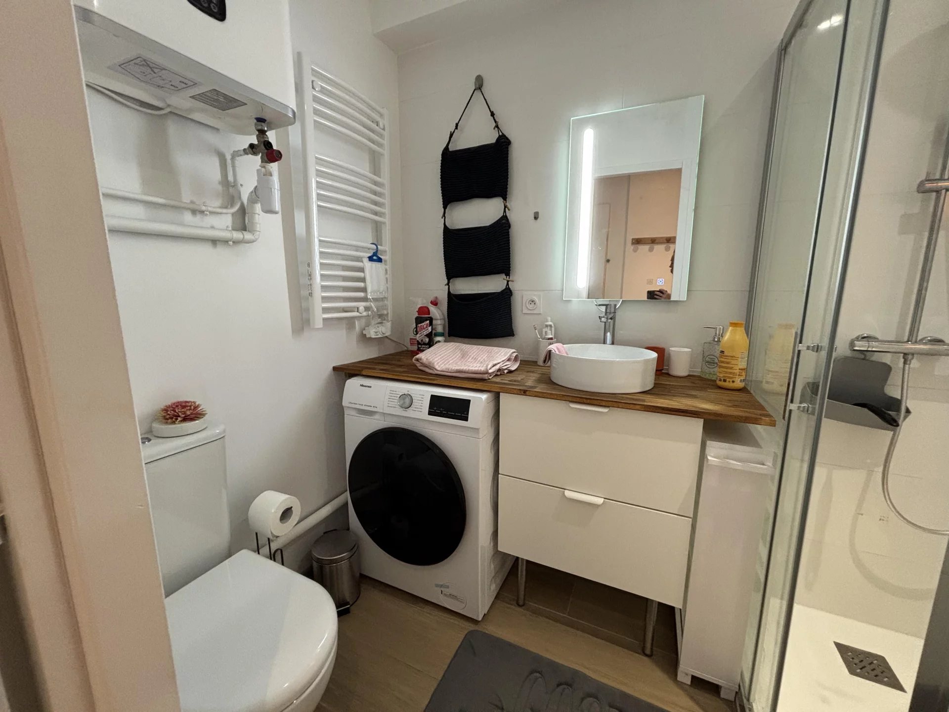 La pièce principale comprend un séjour avec coin bureau et kitchenette entièrement équipée et aménagée, un coin nuit (lit en 120cm). La salle d'eau comprend une vasque, lave-linge séchant, douche et WC.