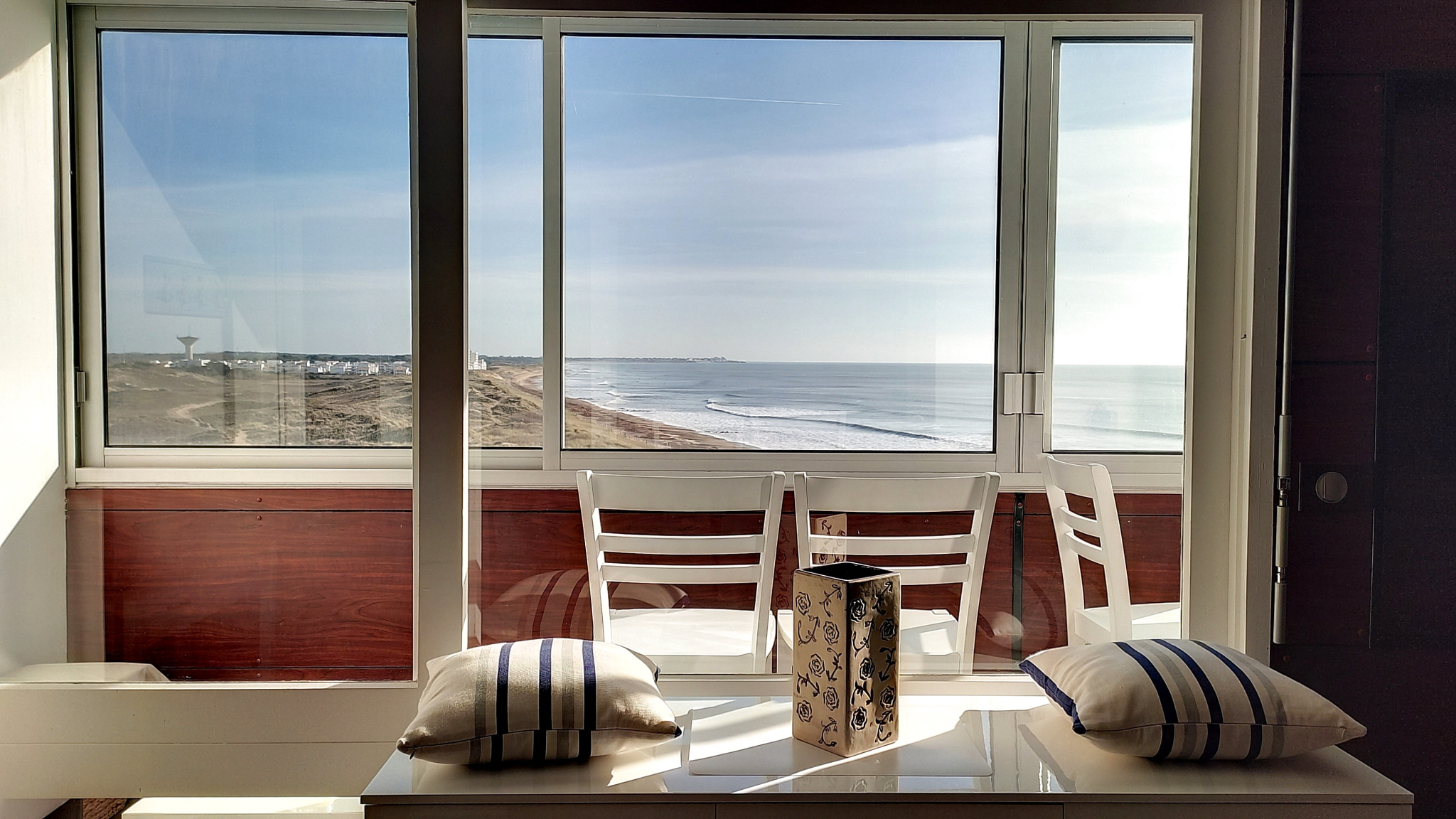 A Saint Hilaire de Riez, dans le village Les Becs, dans le prolongement de la grande plage de sable fin de Saint Jean de Monts, charmant studio offrant une vue imprenable sur l'océan, situé au 5ème étage avec ascenseur d'une résidence en front de mer, comprenant une entrée, un séjour avec couchage double(lits gigogne) une cuisine ouverte équipée et aménagée, une salle d'eau avec WC, un grand balcon loggia. Parking public gratuit en face de la résidence. Plage au pied de la résidence sans route à traverser, commerces d'été à 450 m, forêt et pistes cyclables à proximité.