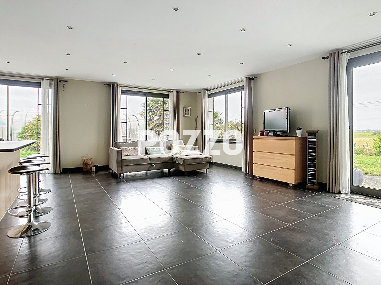 Maison contemporaine à Regnéville-sur-Mer 125 m² habitable Terrain 4 661 m² clos et arboré. Située au calme, cette maison de plain-pied offre de beaux volumes et des prestations complètes : Intérieur : Entrée, grand séjour avec cuisine ouverte équipée, 4 chambres, salle de bains (douche + baignoire), WC et chaufferie. Potentiel : Grenier aménageable sur toute la surface au-dessus. Extérieur : Très grand terrain de 4 661 m² avec portail électrique. Annexes : Deux garages avec grenier, piscine couverte (7x3m) avec sa propre salle d'eau et WC. Une propriété rare avec un grand jardin et tout le confort, à deux pas de la mer. Vue dégagée sur le havre.