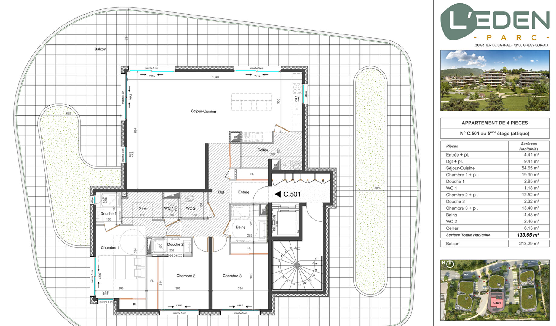 Aux portes d'Aix-les-Bains, découvrez L'Eden Parc, une résidence idéalement située au coeur de Grésy-sur-Aix, dans un quartier proche de tous commerces et en plein développement. Appartement attique de 133m2 et une terrasse privative de plus de 200m2 Ce programme à l'architecture contemporaine est répartis sur trois bâtiments à taille humaine, conçus dans le respect de l'environnement et de l'harmonie du site. Les volumes aérés et la densité maîtrisée offrent un cadre de vie agréable, alliant modernité et confort. Pensée pour le bien-être de ses occupants, la résidence bénéficie de prestations haut de gamme, avec notamment un chauffage par géothermie et plancher chauffant hydraulique. Sécurité et qualité sont également au rendez-vous : accès sécurisé par visiophone et système Vigik, volets roulants motorisés, carrelage grand format en grès cérame. Livraison prévue : 1er semestre 2028 Un programme idéal pour habiter ou investir, à proximité immédiate des commerces, services et axes reliant Aix-les-Bains et son bassin de vie. Renseignements tarifs et plans sur simple demande. Tarif pour un T4 dernier étage, parking et cave en option. Frais de notaire réduit François Picollier (EI) Agent Commercial - Numéro RSAC : 841 755 416 - Chambery.