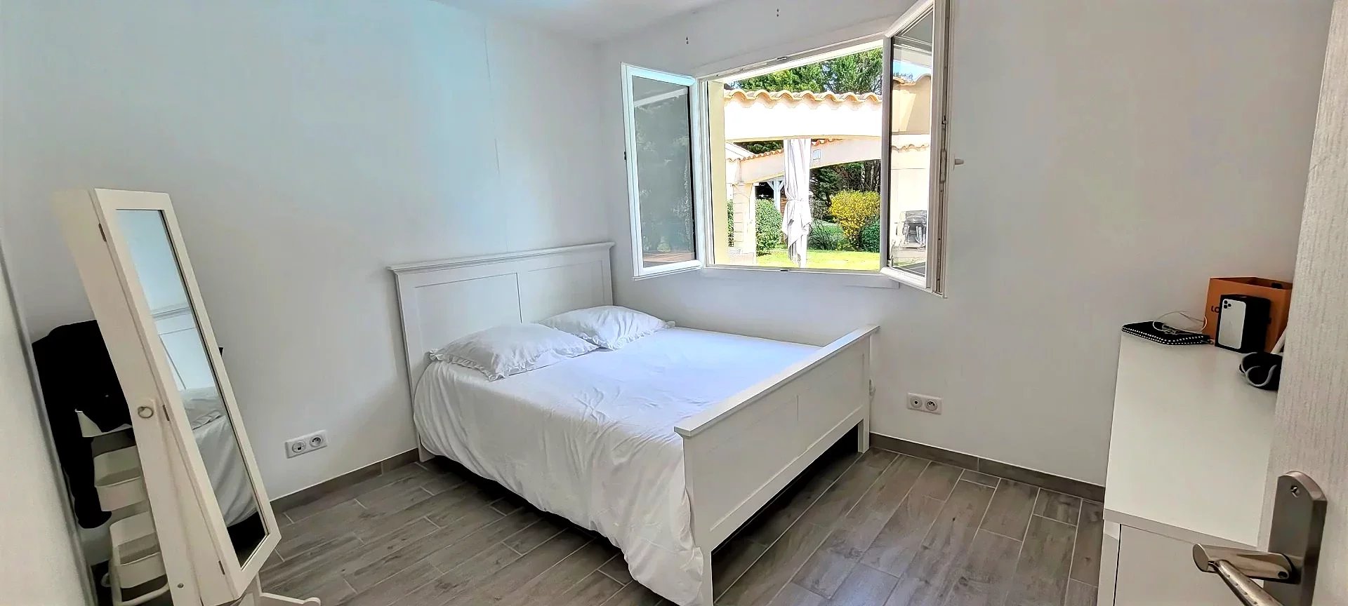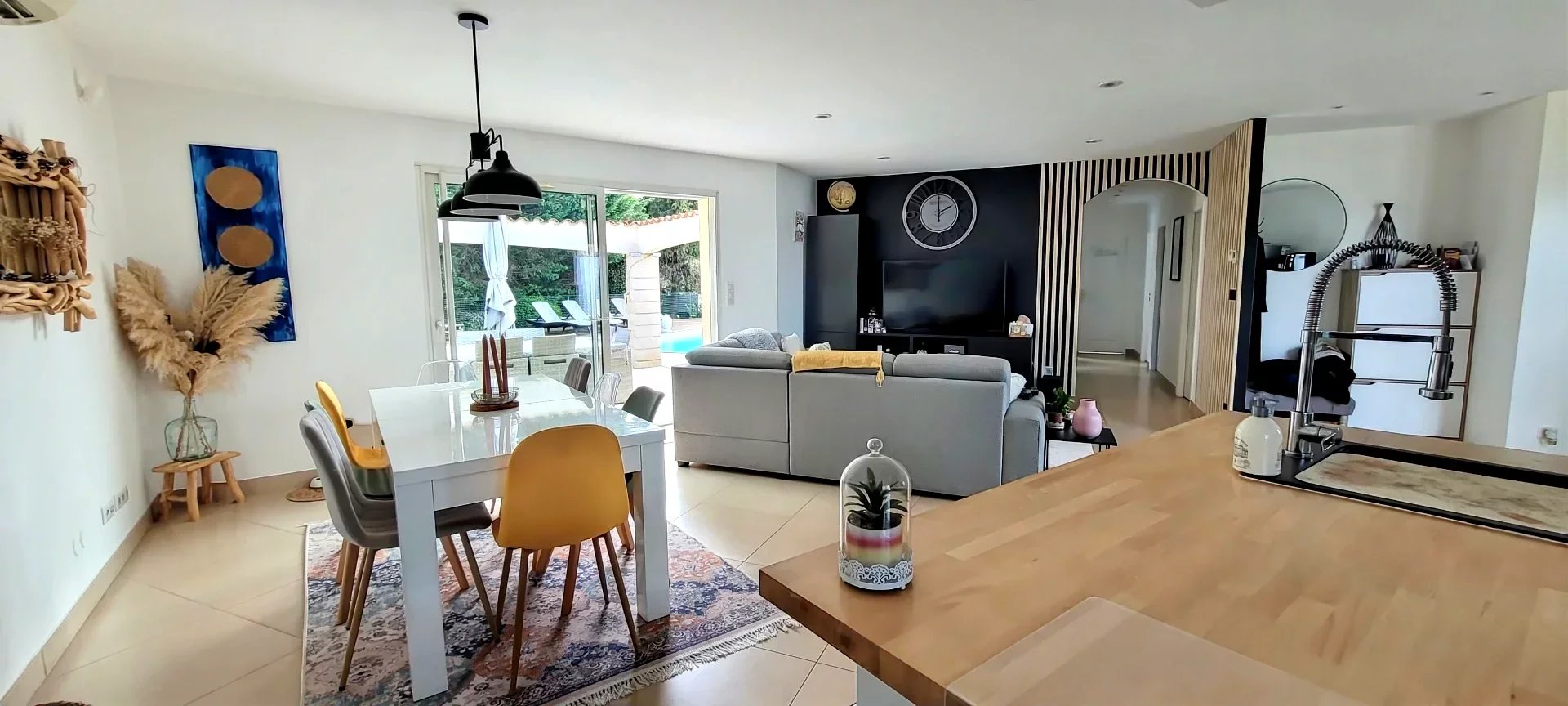 Dès l'entrée, l'opération séduction commence : décoration soignée, les volumes sont aérés, les espaces cuisine et séjour sont ouverts et donnent vue sur la piscine.