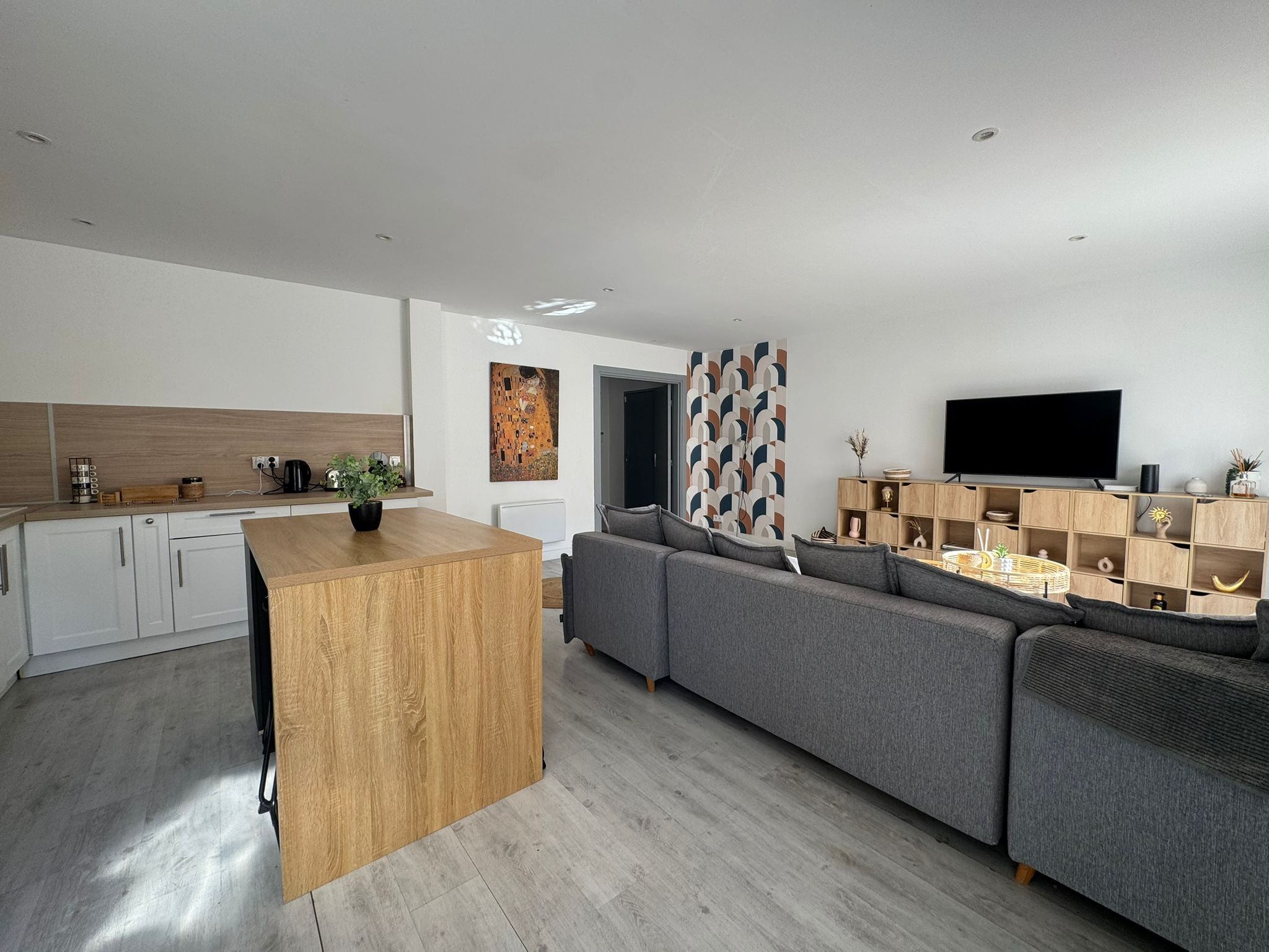 Une vaste pièce de vie lumineuse avec cuisine ouverte, Trois chambres, Une salle de bain avec WC, Un WC indépendant.