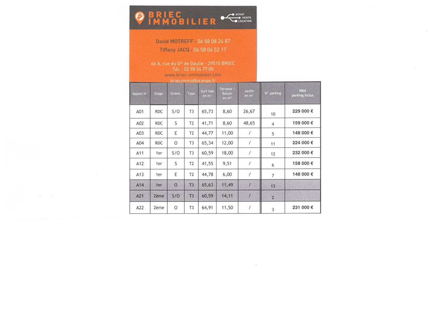 Au coeur du centre ville, pour habiter ou investir, 10 appartements T2 et T3 avec balcon ou jardin privatif. La résidence offre des prestations de qualité: hall avec controle d'accès, ascenseur, local vélos, stationnement privatif. A partir de 148 000€ exemple: appartement N° A03, surface habitable 44.77m², terrasse/bacon 11m² parking inclus. Livraison 2 ème semestre 2026 Renseignements et vente Votre agence BRIEC IMMOBILIER