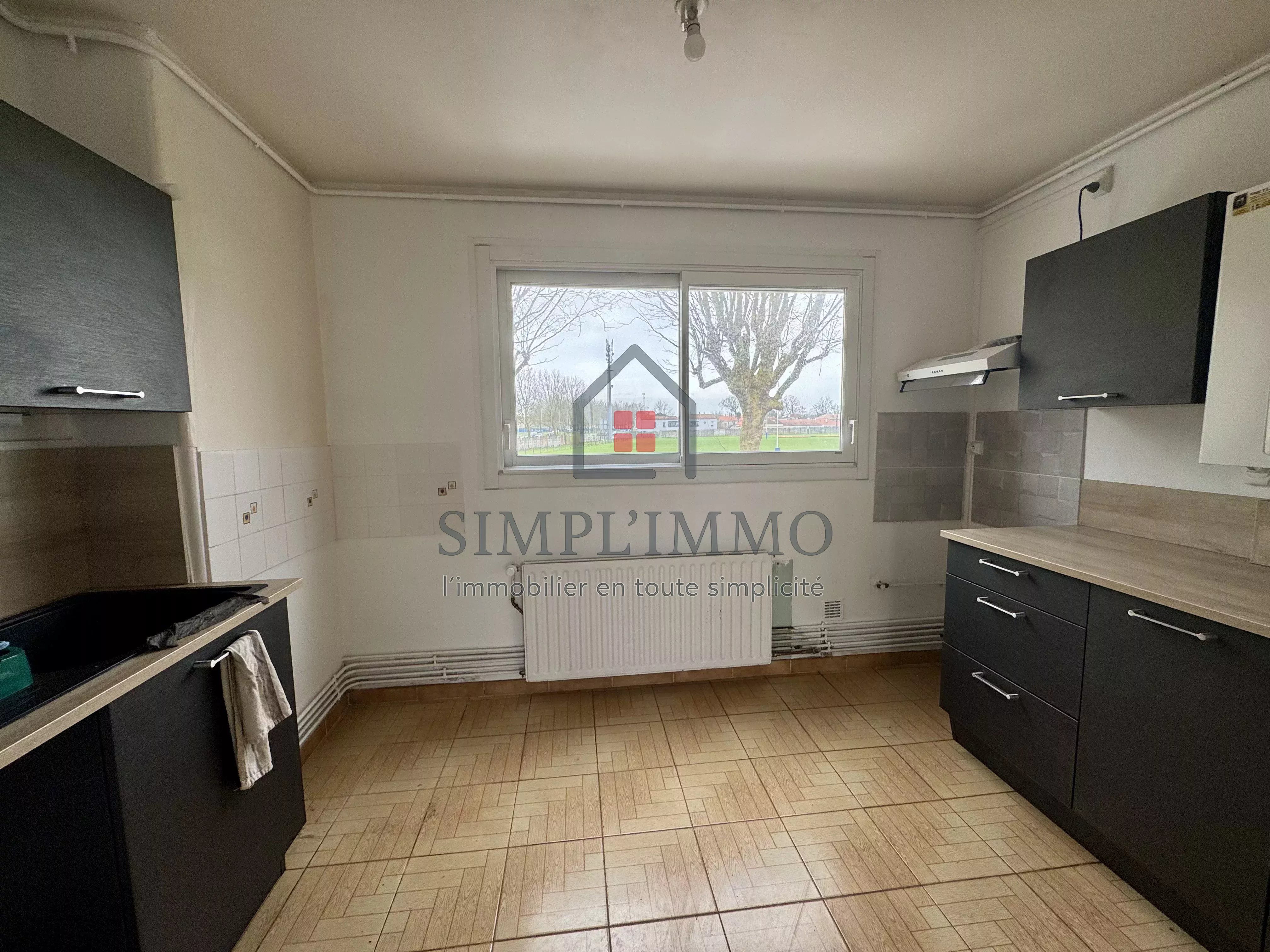 À louer : appartement T4 de 60 m², situé au premier étage d’une résidence sécurisée. Il se compose d’une entrée, d’une pièce de vie avec cuisine semi-ouverte aménagée. Trois chambres, une salle de douche, un espace buanderie et des toilettes séparées. Garage privatif de 22 m².