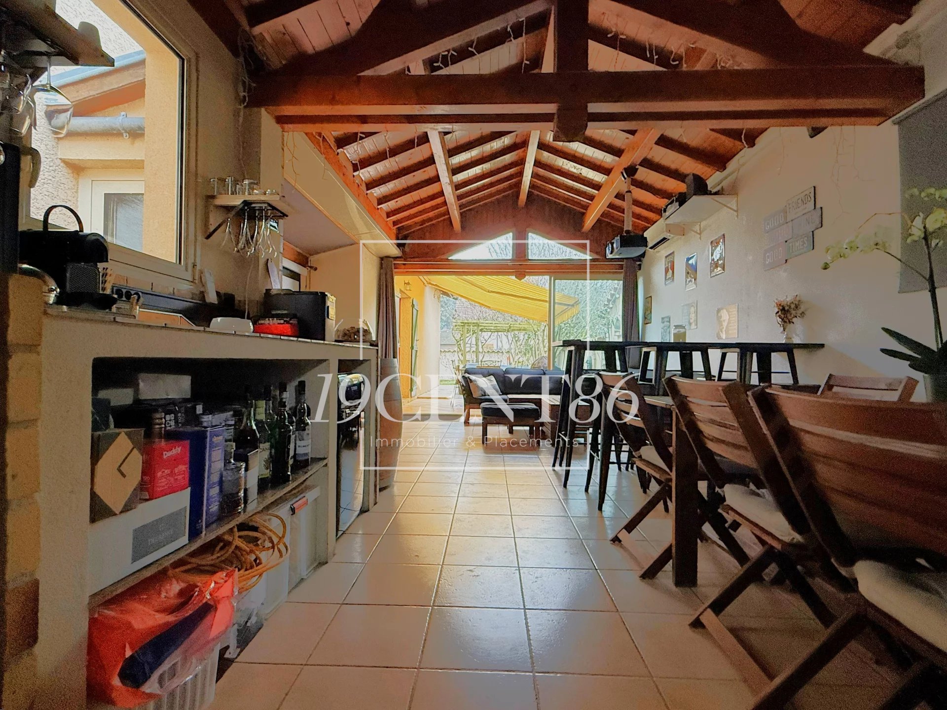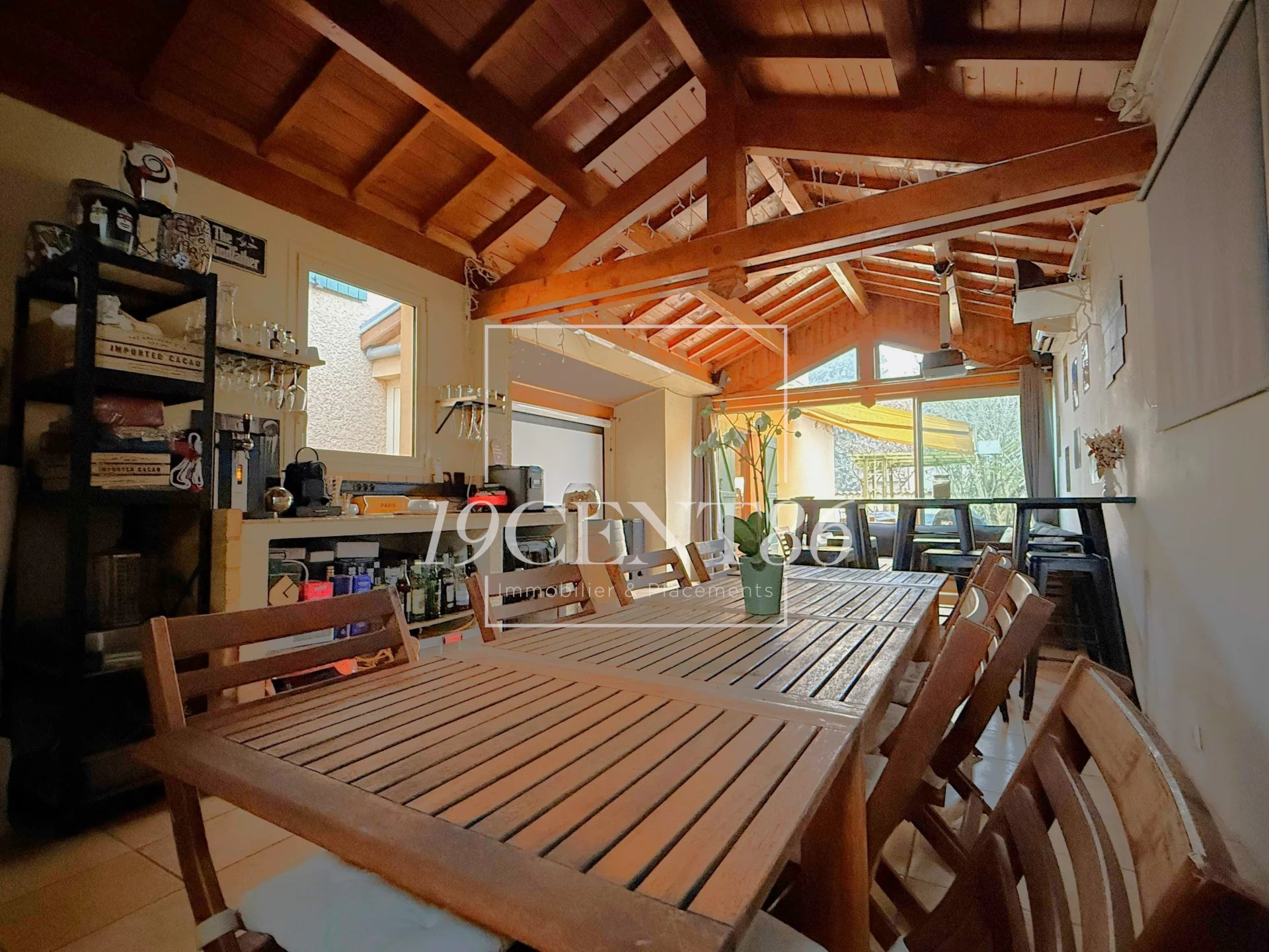 La véranda de 38,3 m², équipée d’une climatisation réversible, complète les espaces de vie avec un espace salon, salle à manger et cuisine d’été.