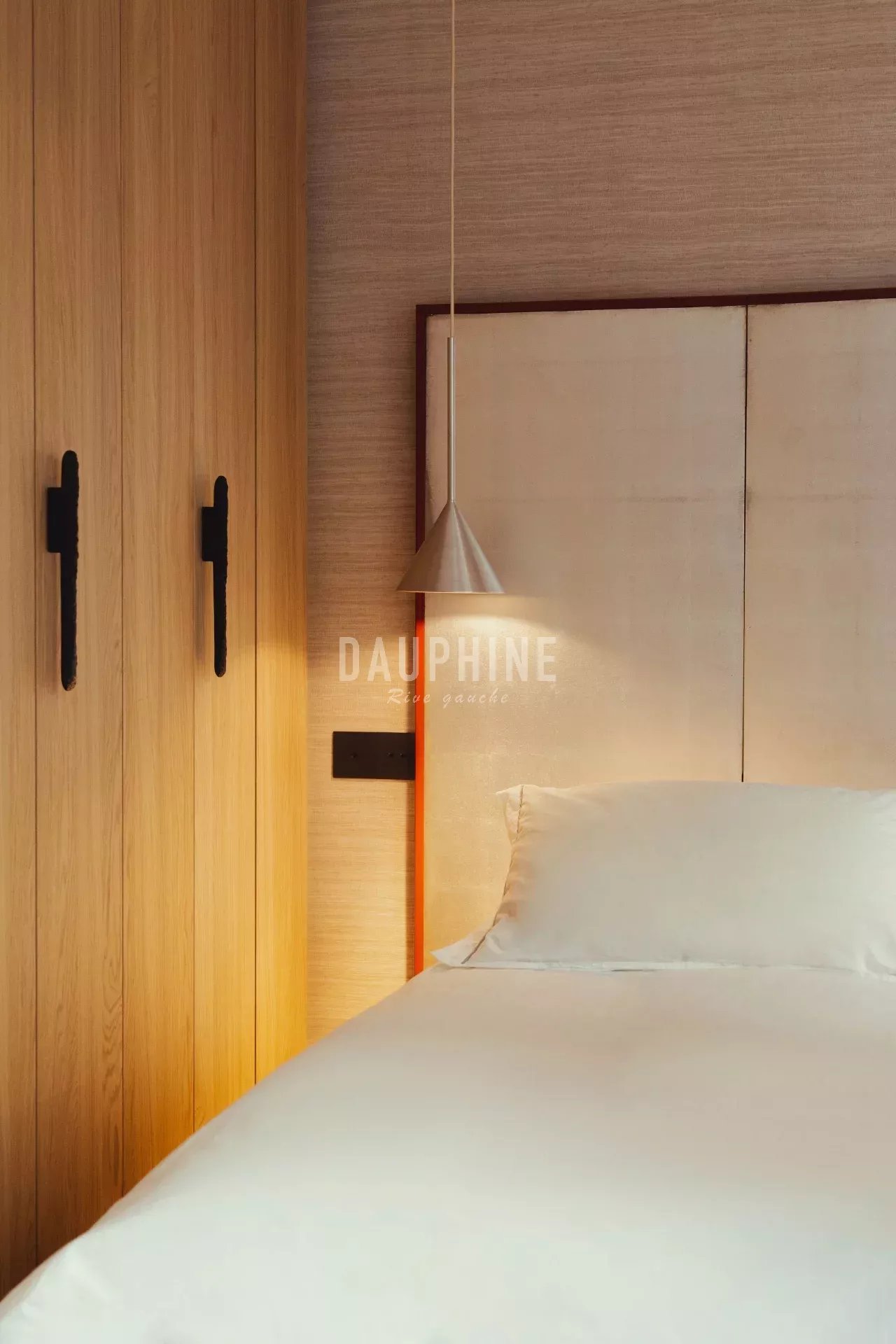La chambre, intime et apaisante, privilégie les textures naturelles et les tonalités neutres. Elle donne sur une cour arborée, calme et lumineuse, et dispose de rangements intégrés sur mesure ainsi que d’une climatisation, assurant un confort optimal en toute saison.