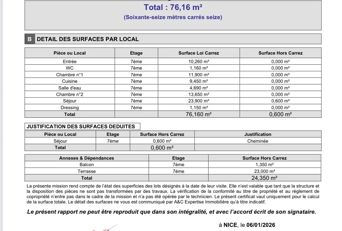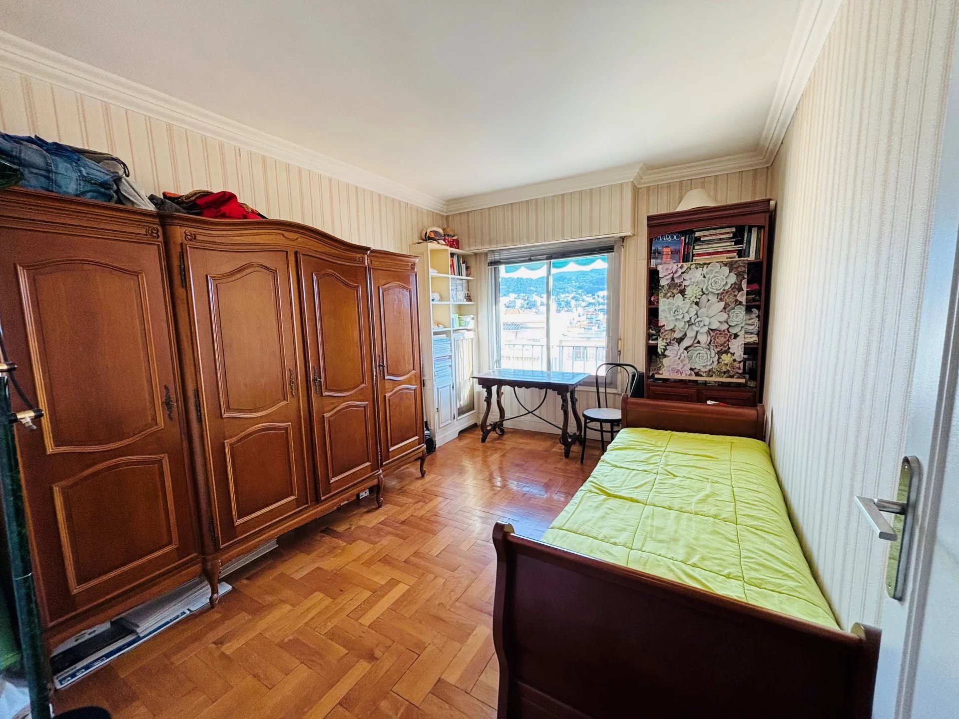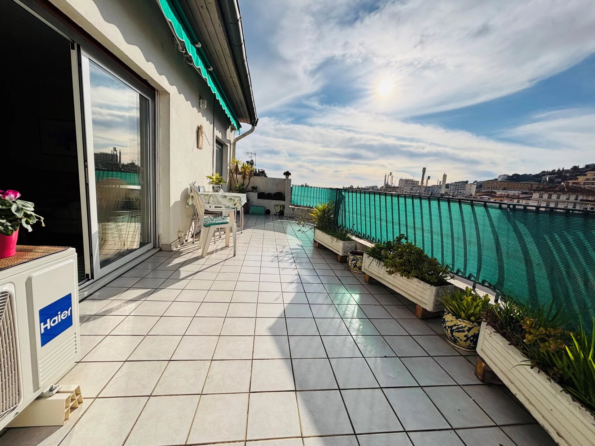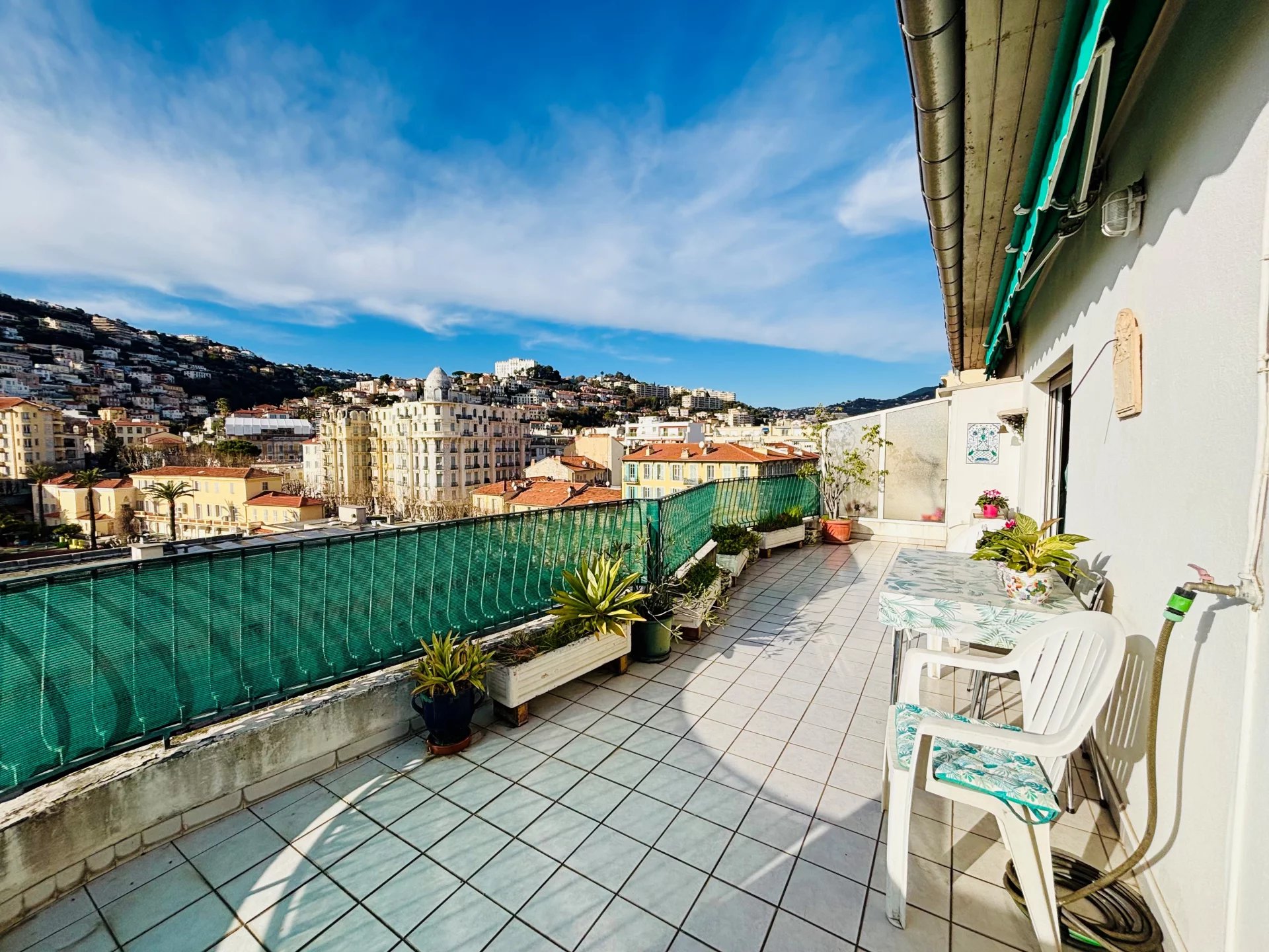 NICE CENTRE/HAUT GAMBETTA : Au DERNIER ETAGE d'un immeuble Art-Déco avec Ascenseur, 3 pièces Traversant (Est/Ouest) de 76.5m². L’appartement se compose d’une Entrée desservant les espaces, à droite, un Séjour et une spacieuse Chambre ouvrent sur une Terrasse profonde exposée OUEST 23m2 (Vue dégagée Ville Mer Collines), une Salle d’eau avec douche à l’Italienne et rangements, côté EST, une Cuisine indépendante, meublée et équipée, qui ouvre sur balcon (Vue dégagée cour intérieure et Ville), la seconde Chambre, puis des WC individuels avec lave-mains et un Dressing aménagé - Charges annuelles : 3030 euros (chauffage collectif et eau froide inclus) - Taxe Foncière : 1200 euros - Commerces, Marché de la Libération, Bus, Tramway, Ecoles et Lycées à proximité immédiate de l'Immeuble - Honoraires charge vendeur inclus (6%TTC) - Exclusivité C&B -