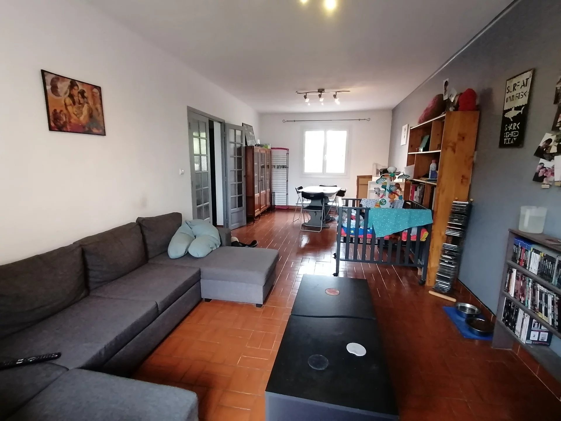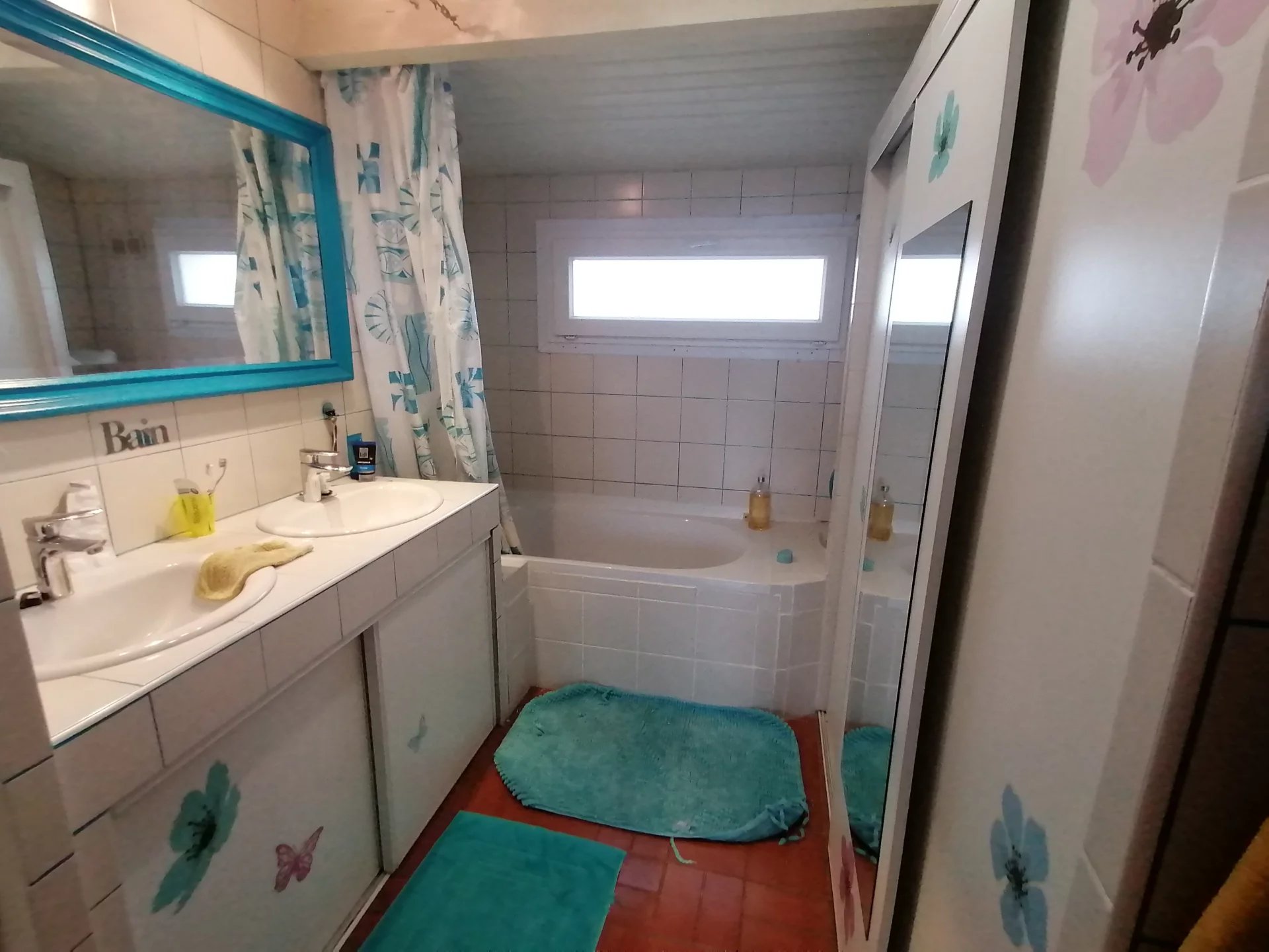 Il se compose au rez de chaussée d'un hall d'entrée avec placard, une grande pièce à vivre, cuisine et l'accès au garage et au cellier. Au première étage deux chambres avec des rangements, wc. pour finir au dernière étage salle de bain avec placard et une 3ème chambre.