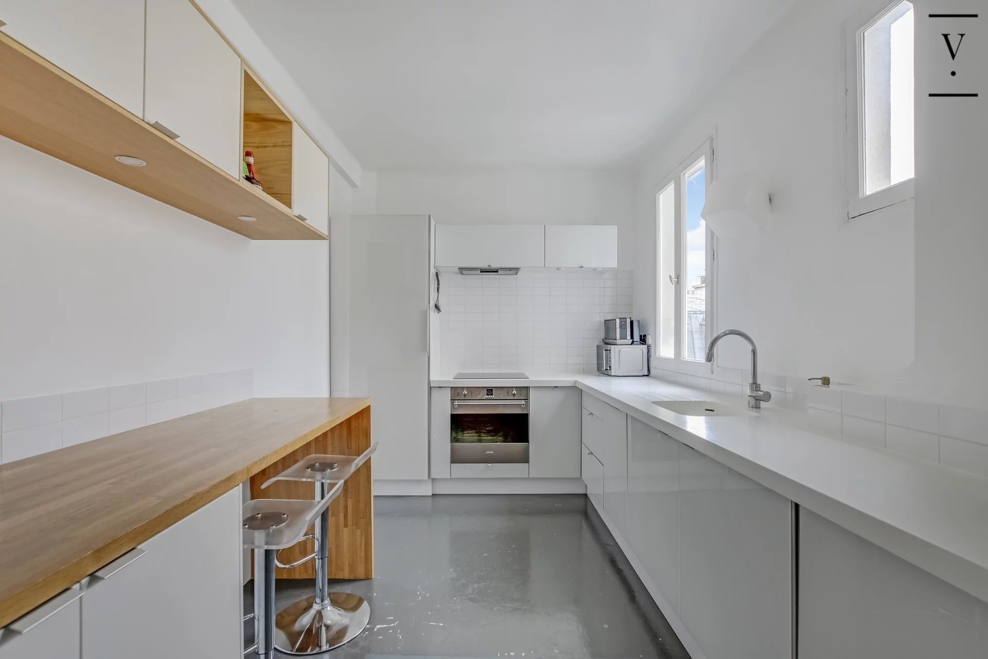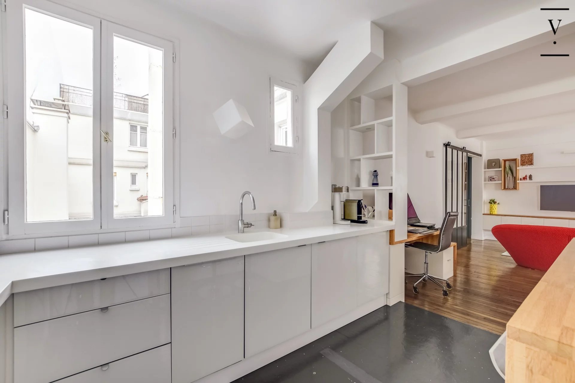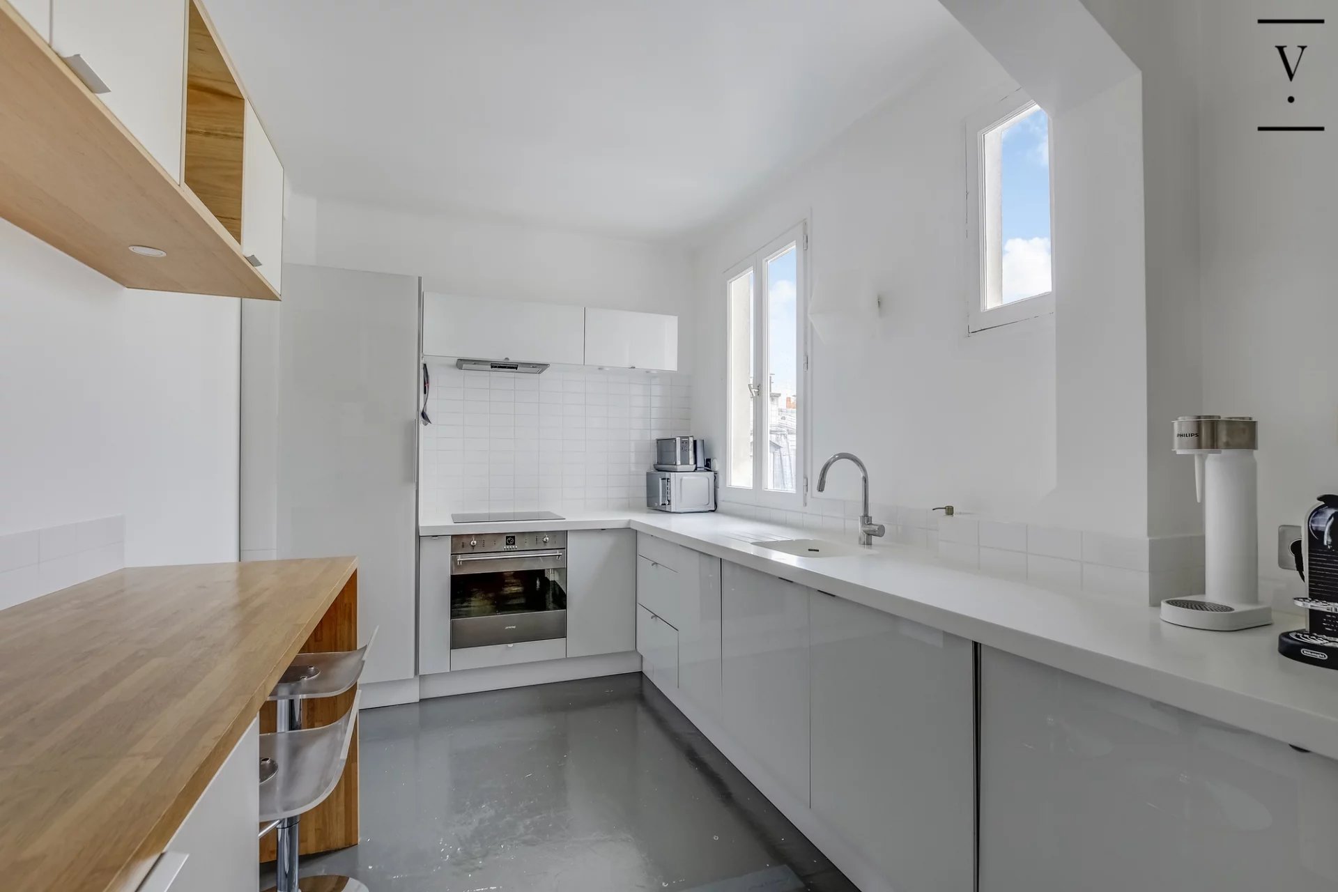 Rue Lamarck proche Metro Guy Moquet. Dans un magnifique immeuble 30, en parfait état avec gardienne. Nous vous proposons au 6ème étage par ascenseur, un très bel appartement de plus de 62m2. Il se compose d'une entrée disposant d'une bibliothèque réalisée sur mesure, ainsi qu'un large espace de rangement. Une vaste pièce de réception ayant une hauteur sous plafond de 2.80M, donnant accès à une cuisine équipée haut de gamme . Une chambre avec rangements intégrés et une salle de bains avec WC et fenêtre. Ce lieu est en parfait état, d'un calme absolu, il est également baigné de lumière. Une cave complète cet ensemble.