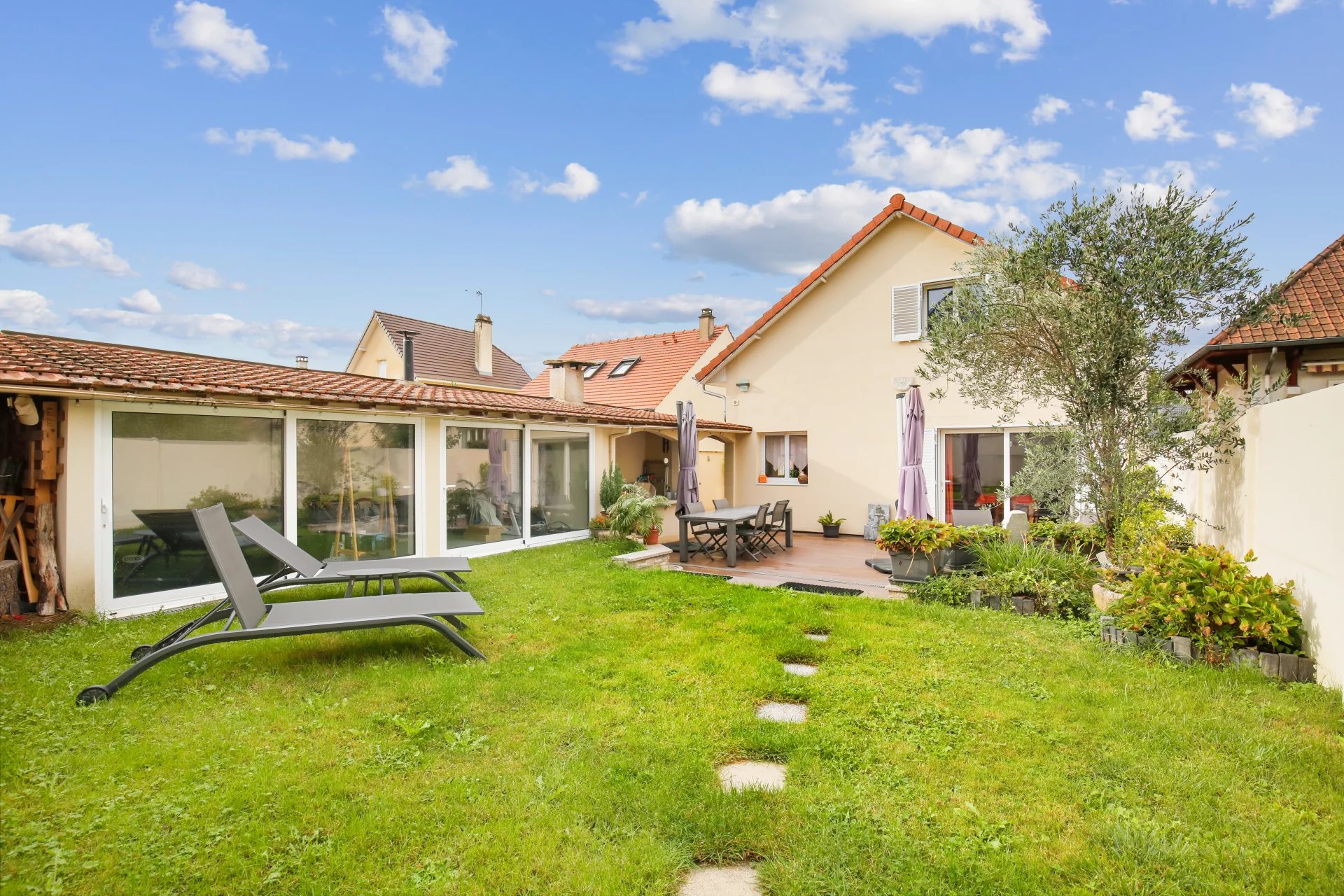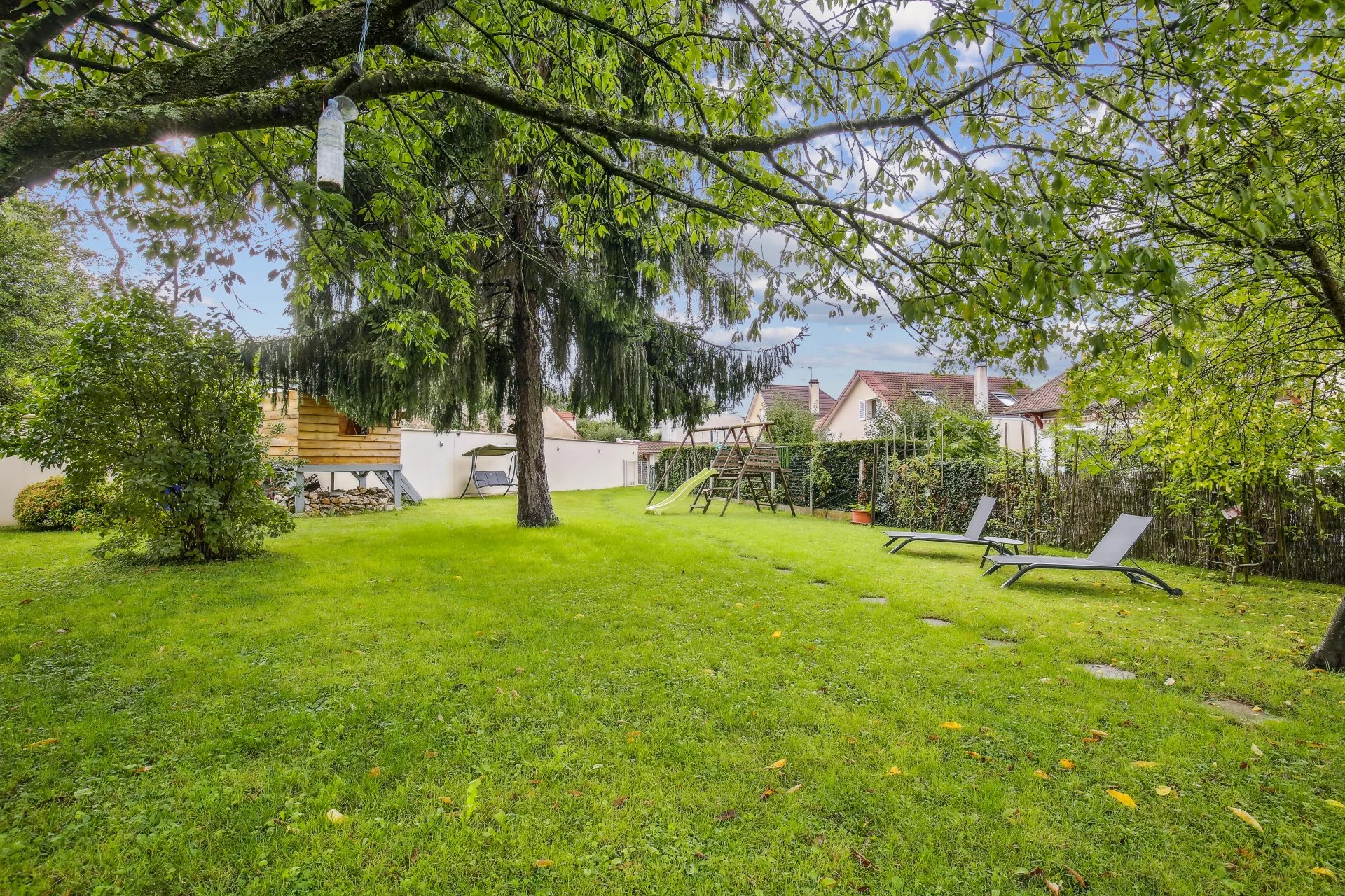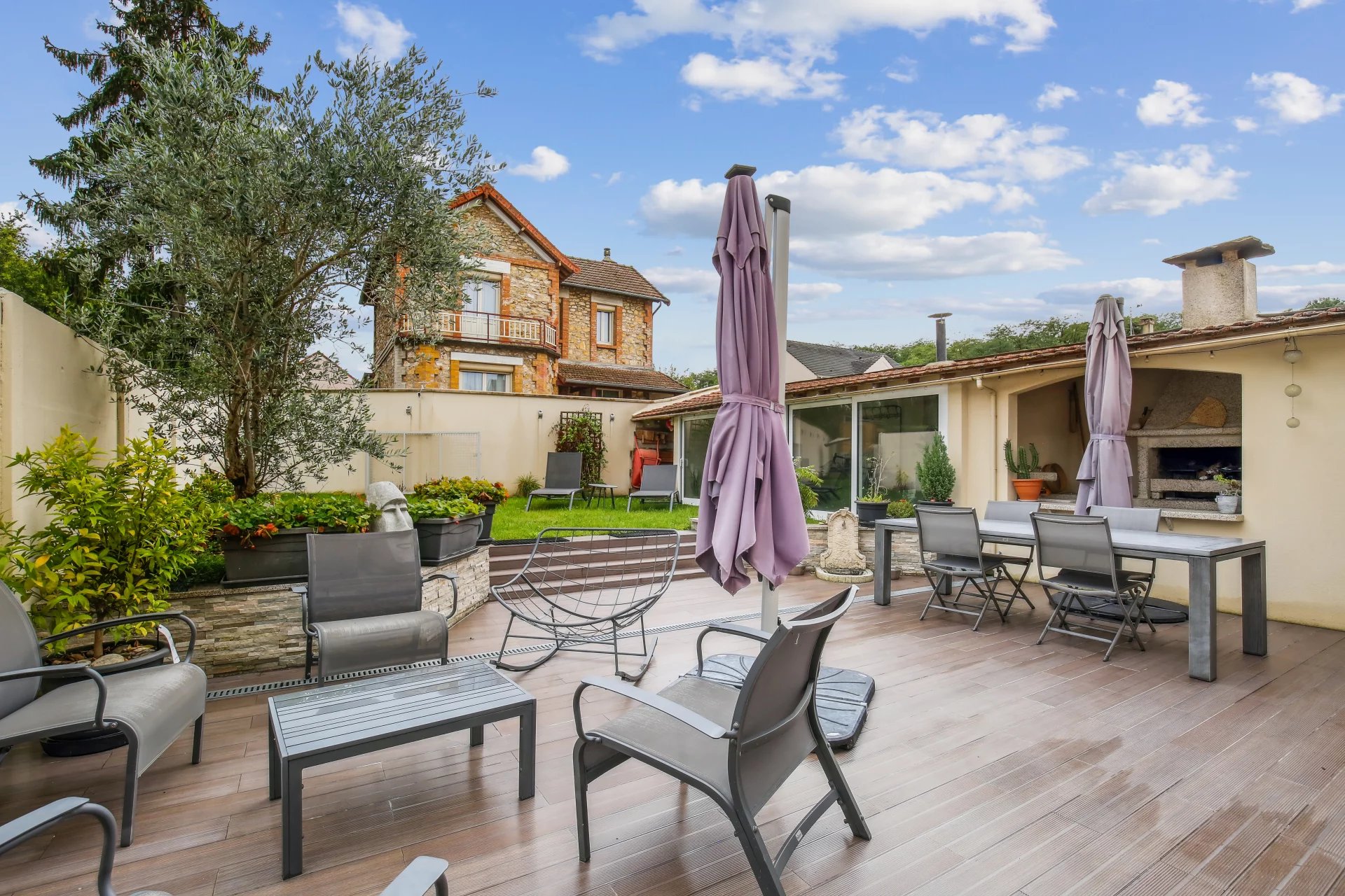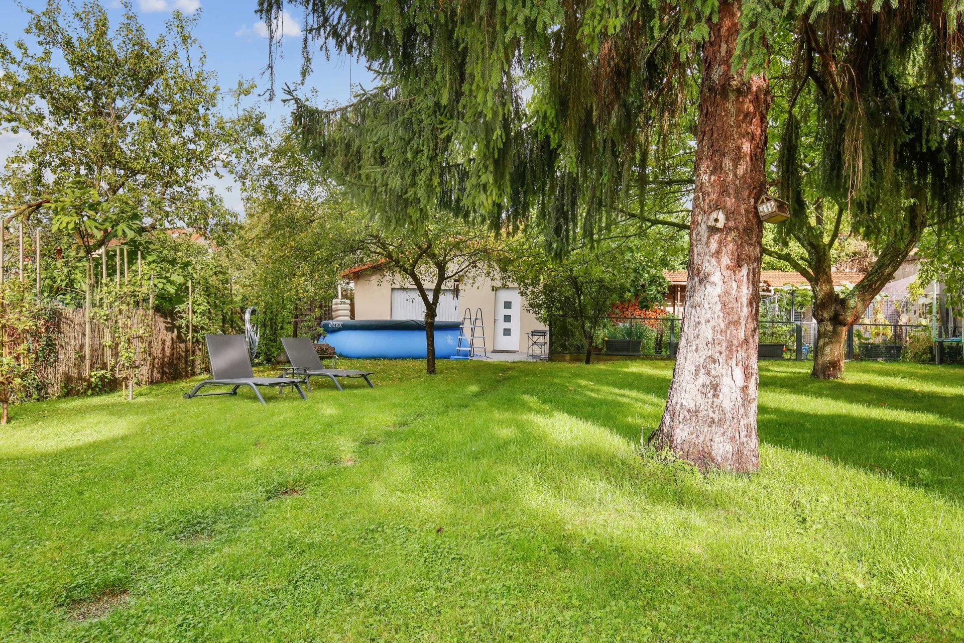 La maison est édifiée sur un terrain arboré de 1 000 m² avec deux dépendances, dont une avec spa aménageable en studio, l’autre utilisée comme atelier. Terrain piscinable et stationnement possible pour deux véhicules dans la cour.