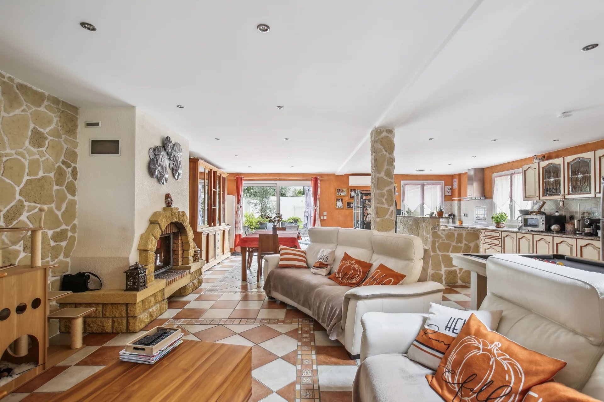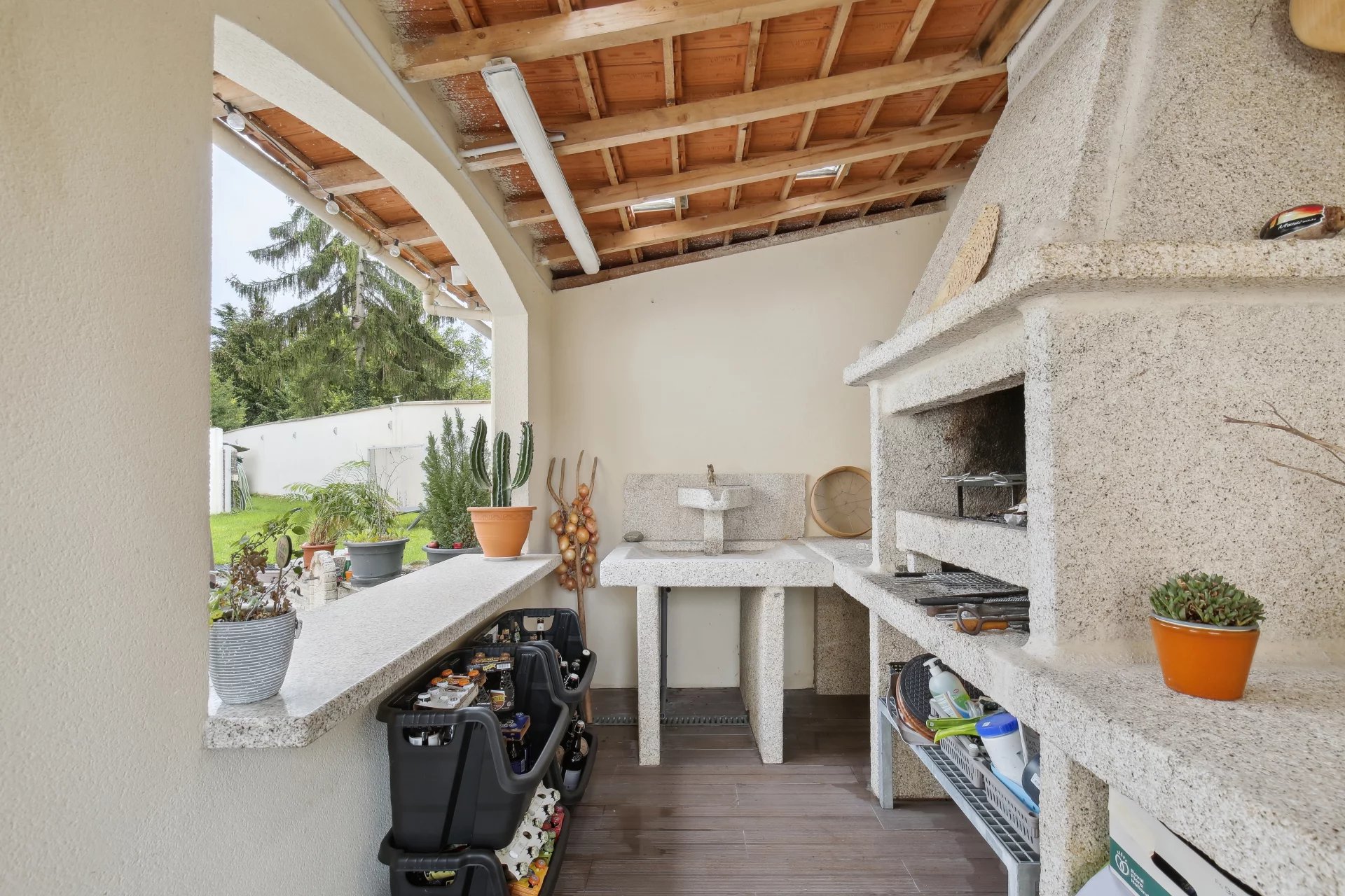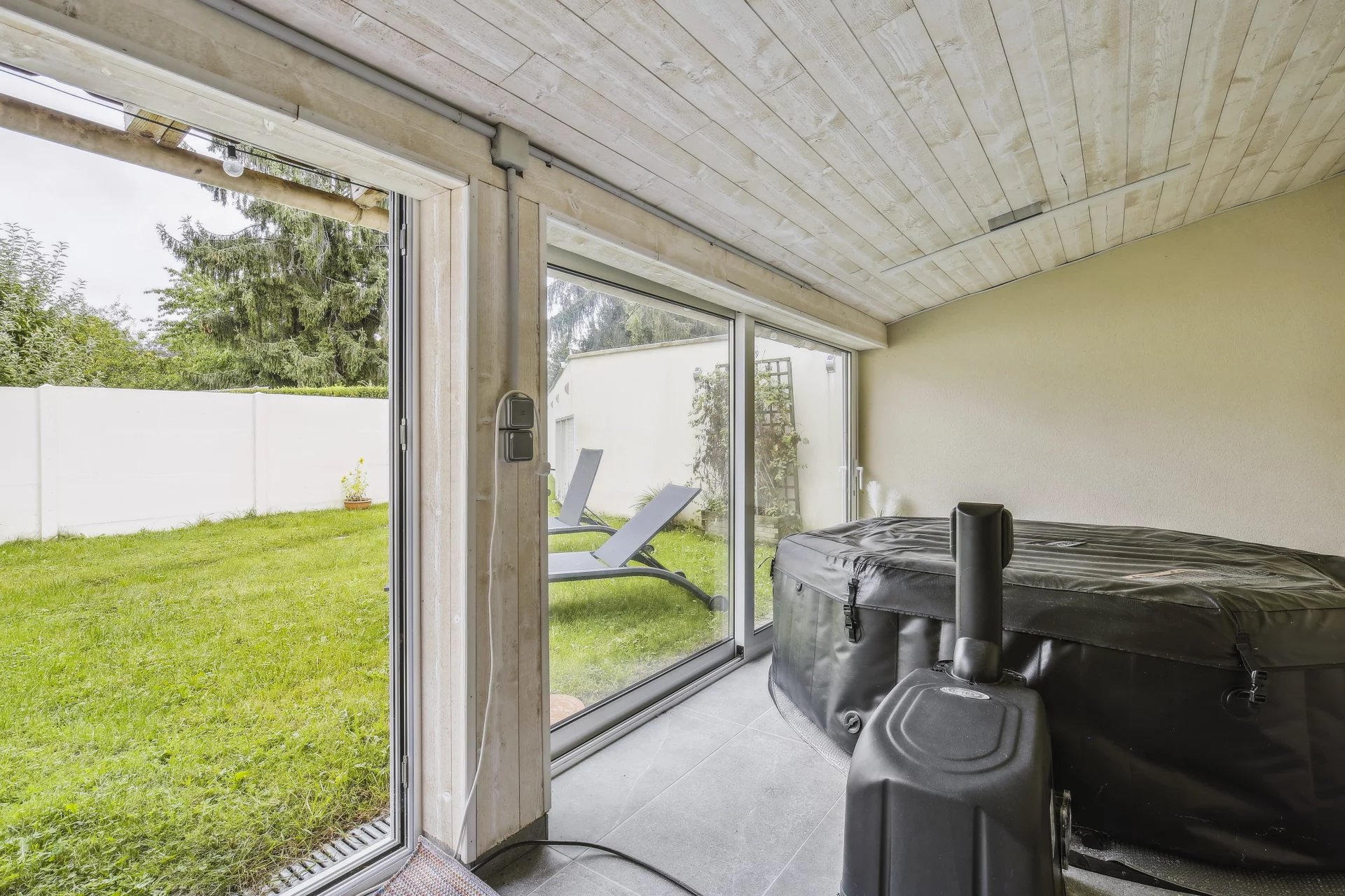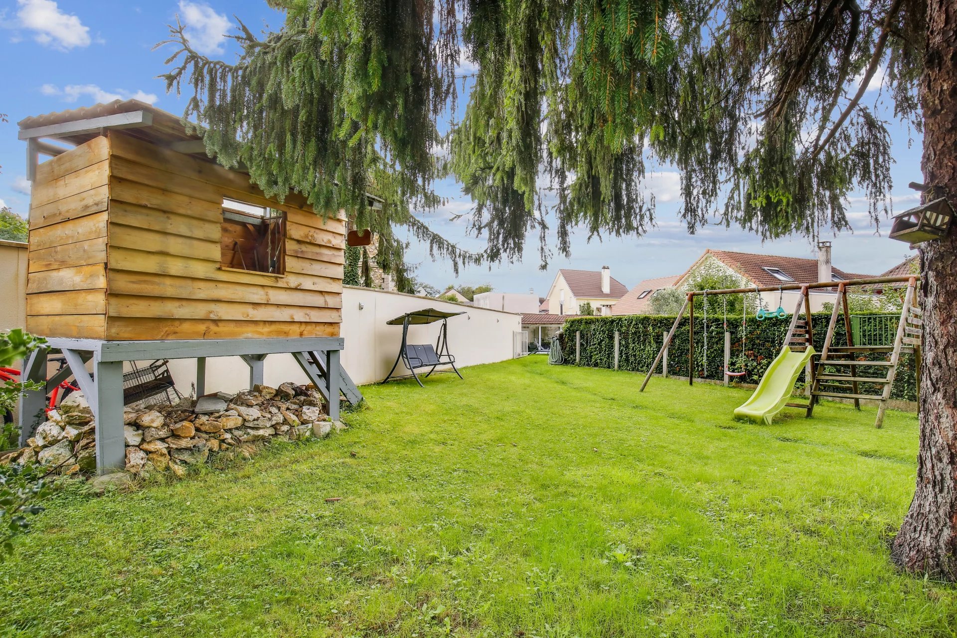 La maison est édifiée sur un terrain arboré de 1 000 m² avec deux dépendances, dont une avec spa aménageable en studio, l’autre utilisée comme atelier. Terrain piscinable et stationnement possible pour deux véhicules dans la cour.