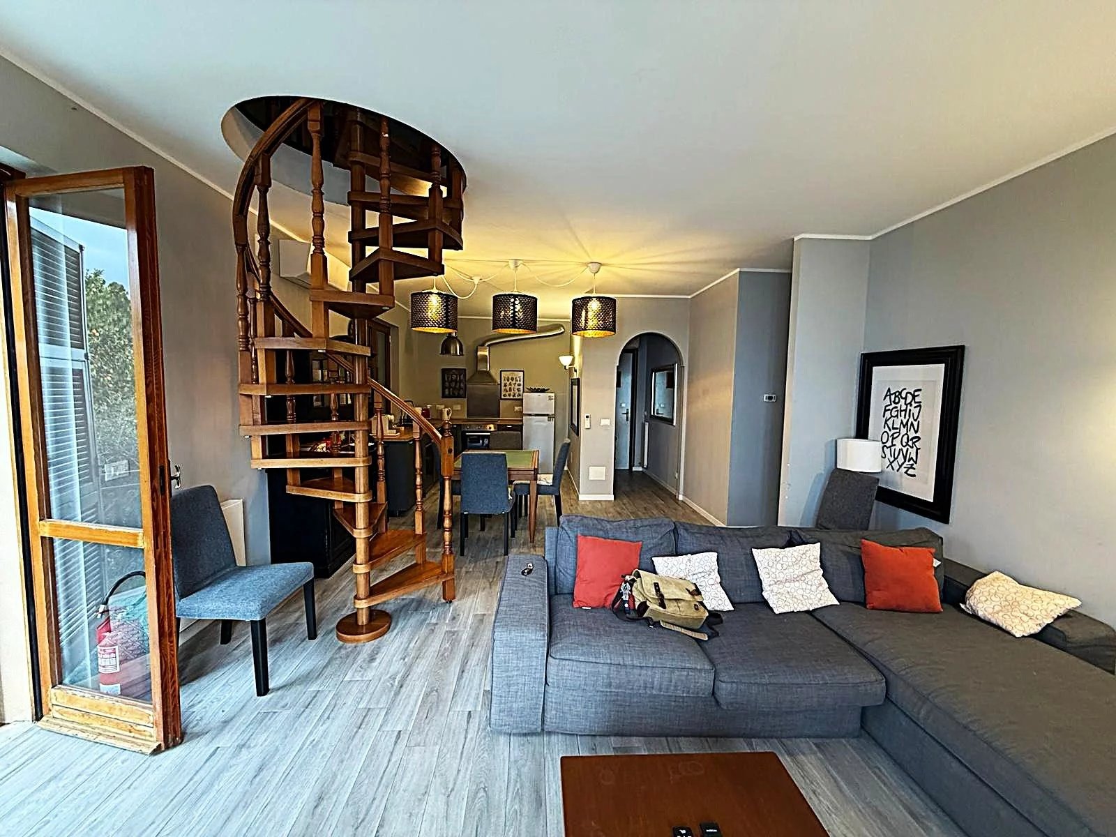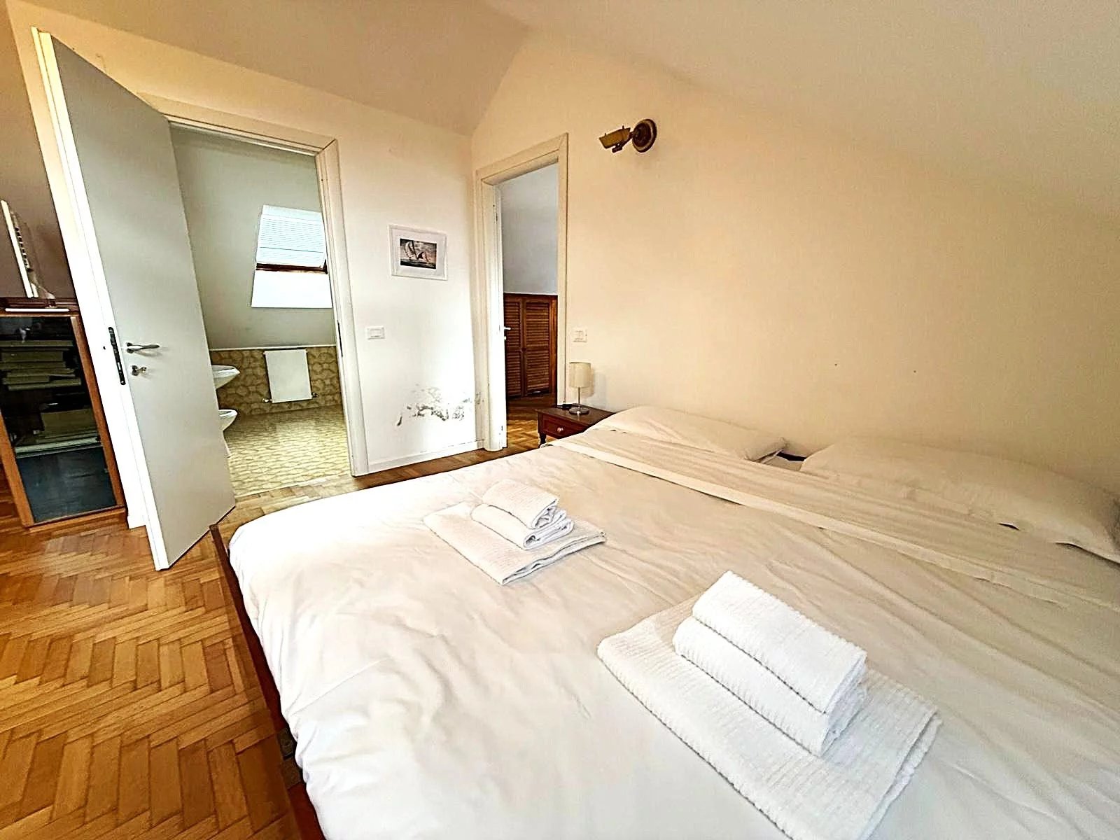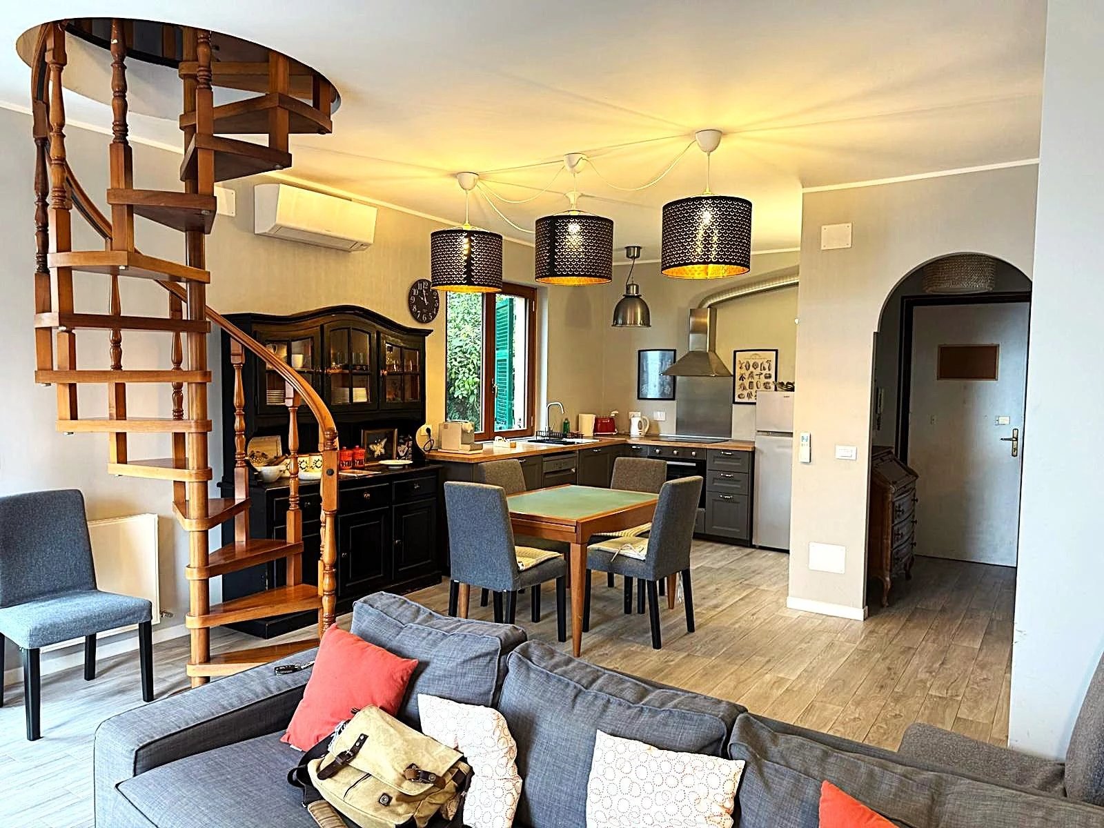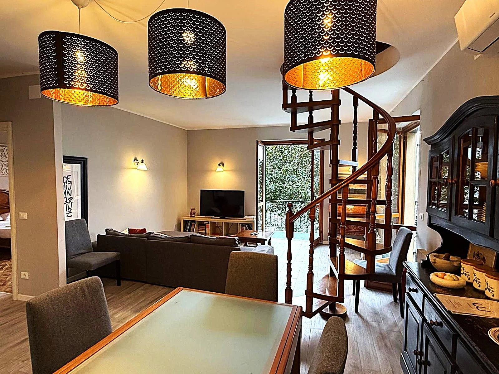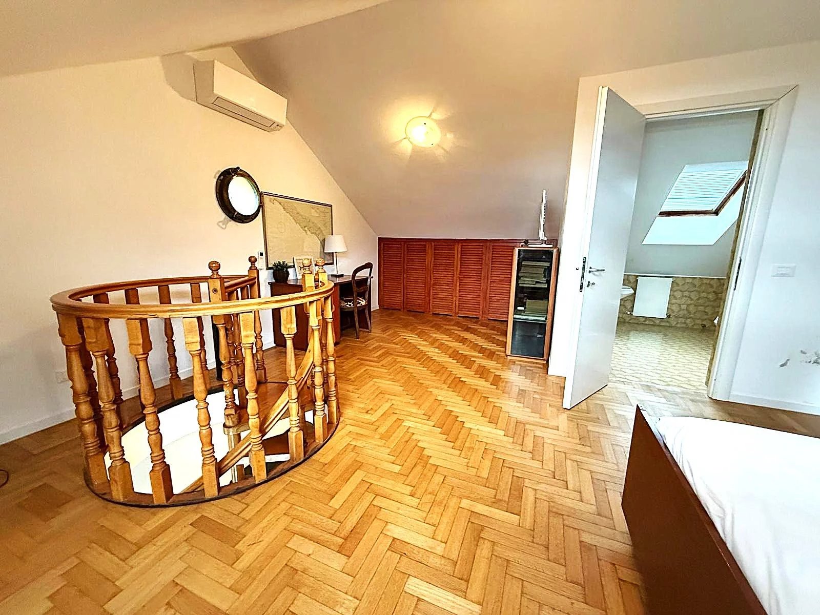 L'appartamento, di circa 150 m² commerciali, è composto da un ampio ingresso che conduce a un luminoso salone, una cucina attrezzata e un balcone angolare perfetto per godere delle serate estive. Le due camere da letto offrono spazio e comfort, mentre il bagno con doccia è funzionale e ben posizionato. Al piano superiore, una mansarda accogliente ospita una grande camera e un secondo bagno, ideale per gli ospiti o come studio.