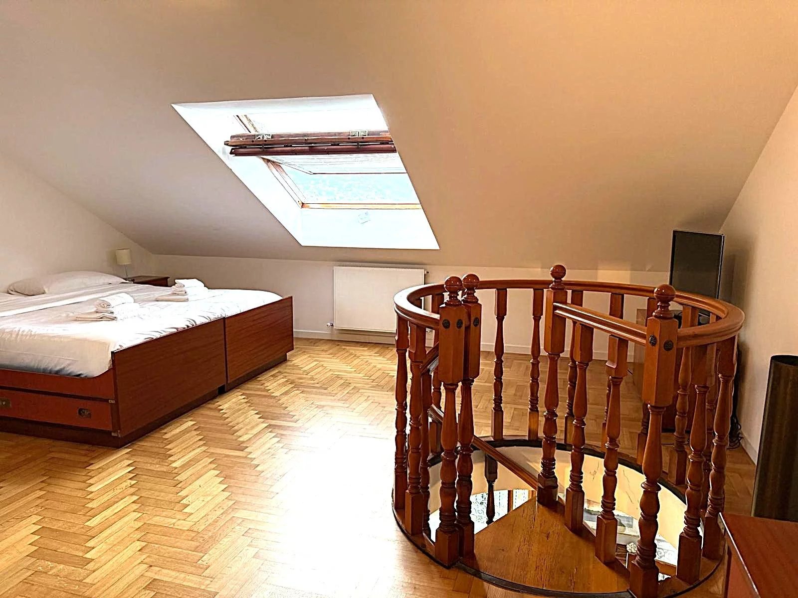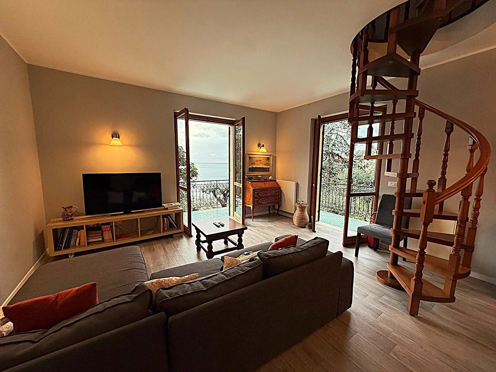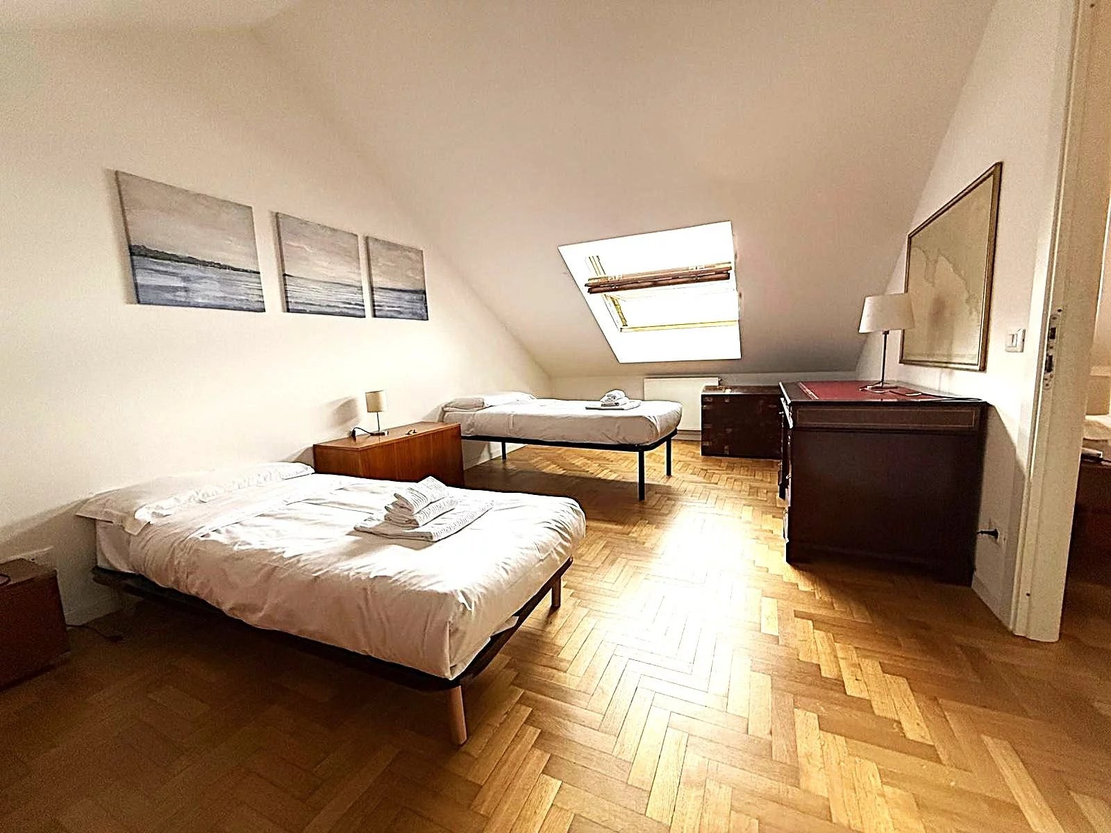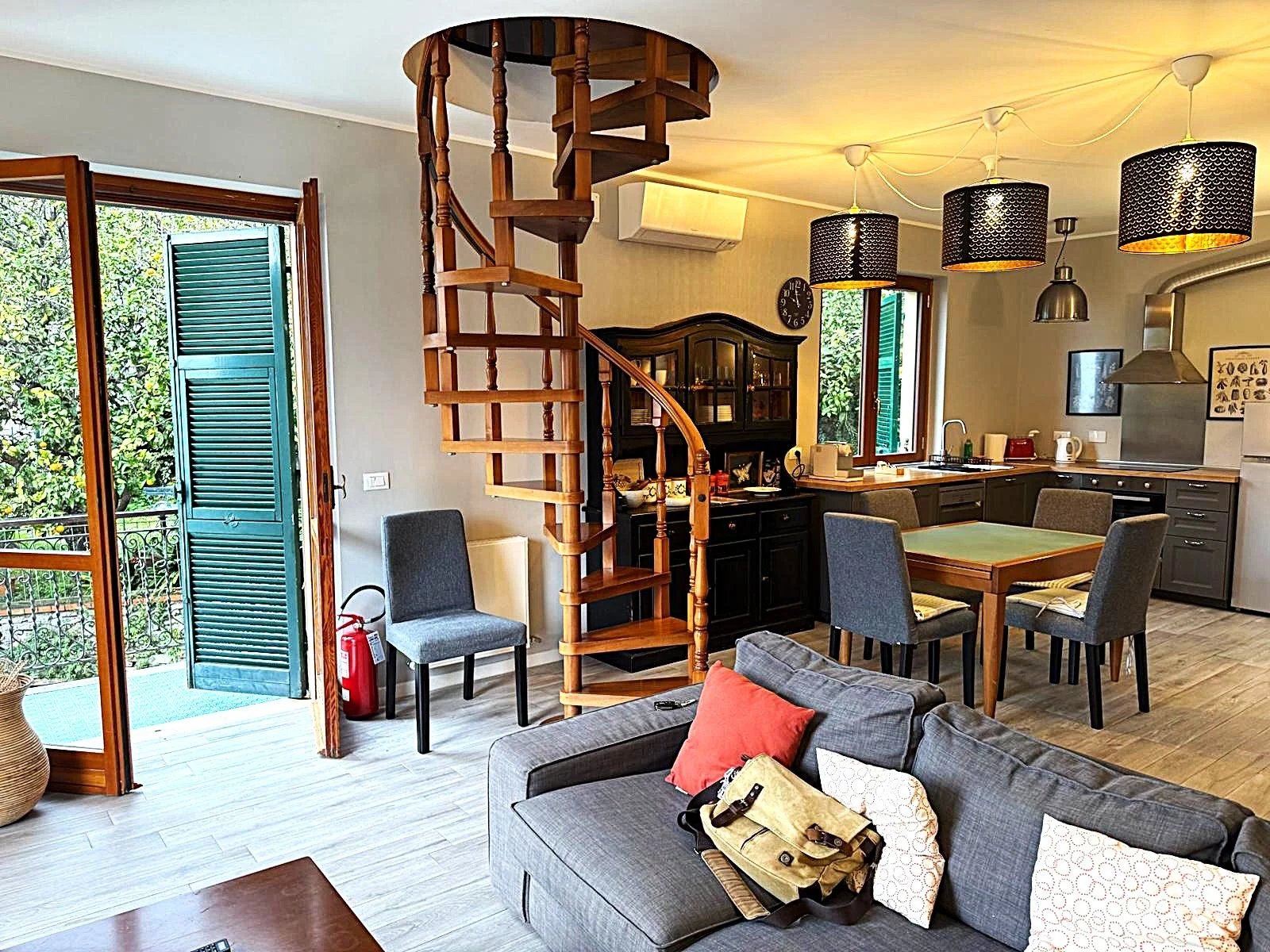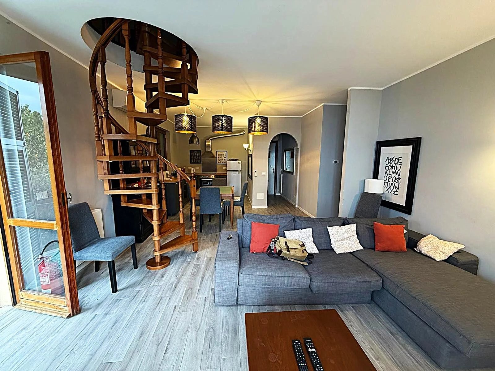 L'appartamento, di circa 150 m² commerciali, è composto da un ampio ingresso che conduce a un luminoso salone, una cucina attrezzata e un balcone angolare perfetto per godere delle serate estive. Le due camere da letto offrono spazio e comfort, mentre il bagno con doccia è funzionale e ben posizionato. Al piano superiore, una mansarda accogliente ospita una grande camera e un secondo bagno, ideale per gli ospiti o come studio.