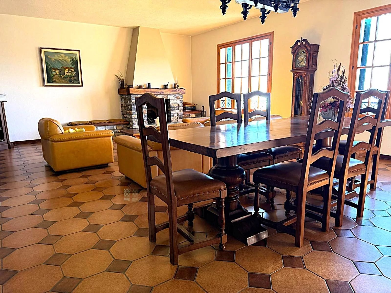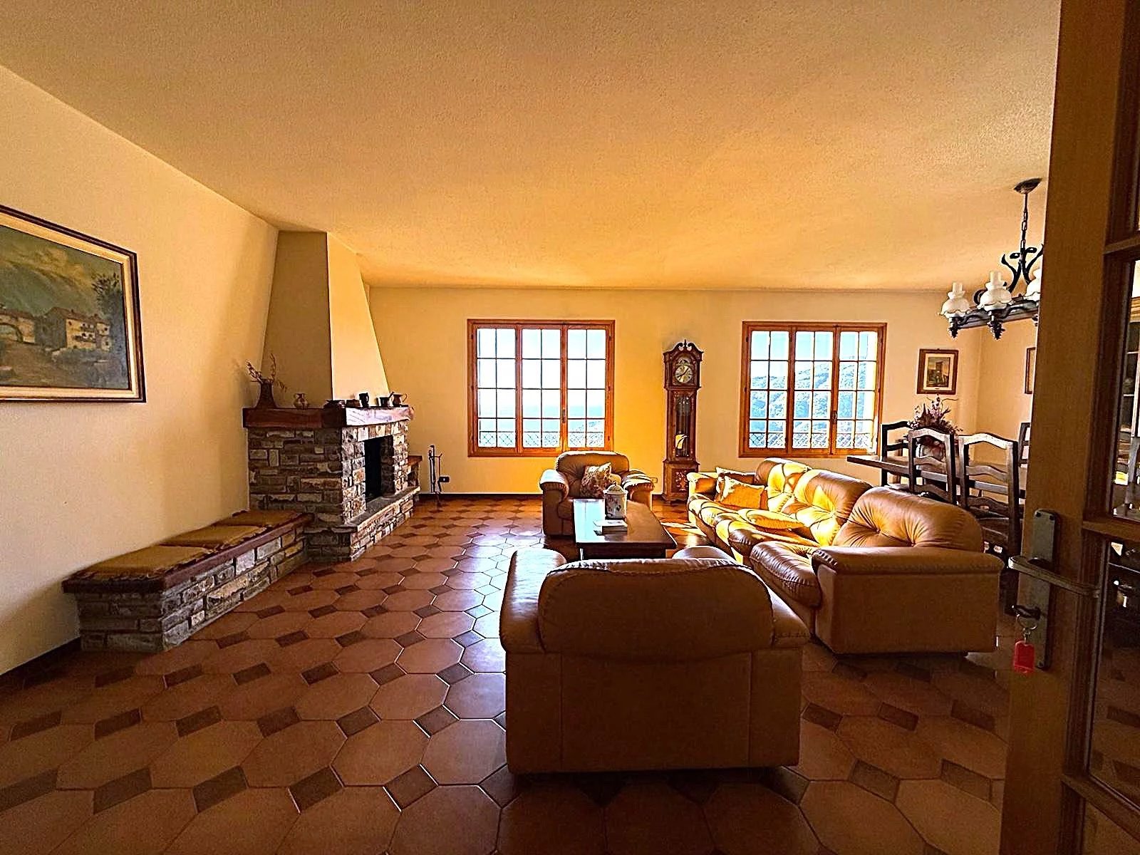 Al piano terra, troverai vari locali utilizzabili come box e magazzini, insieme a bagni funzionali. Salendo al primo piano, l'entrata principale ti accoglie con un grande terrazzo e una balconata che circonda l'intero perimetro. Qui si trovano anche due camere da letto e un salone doppio con camino, perfetto per momenti di relax e convivialità. Un bagno e un ripostiglio completano questo livello.