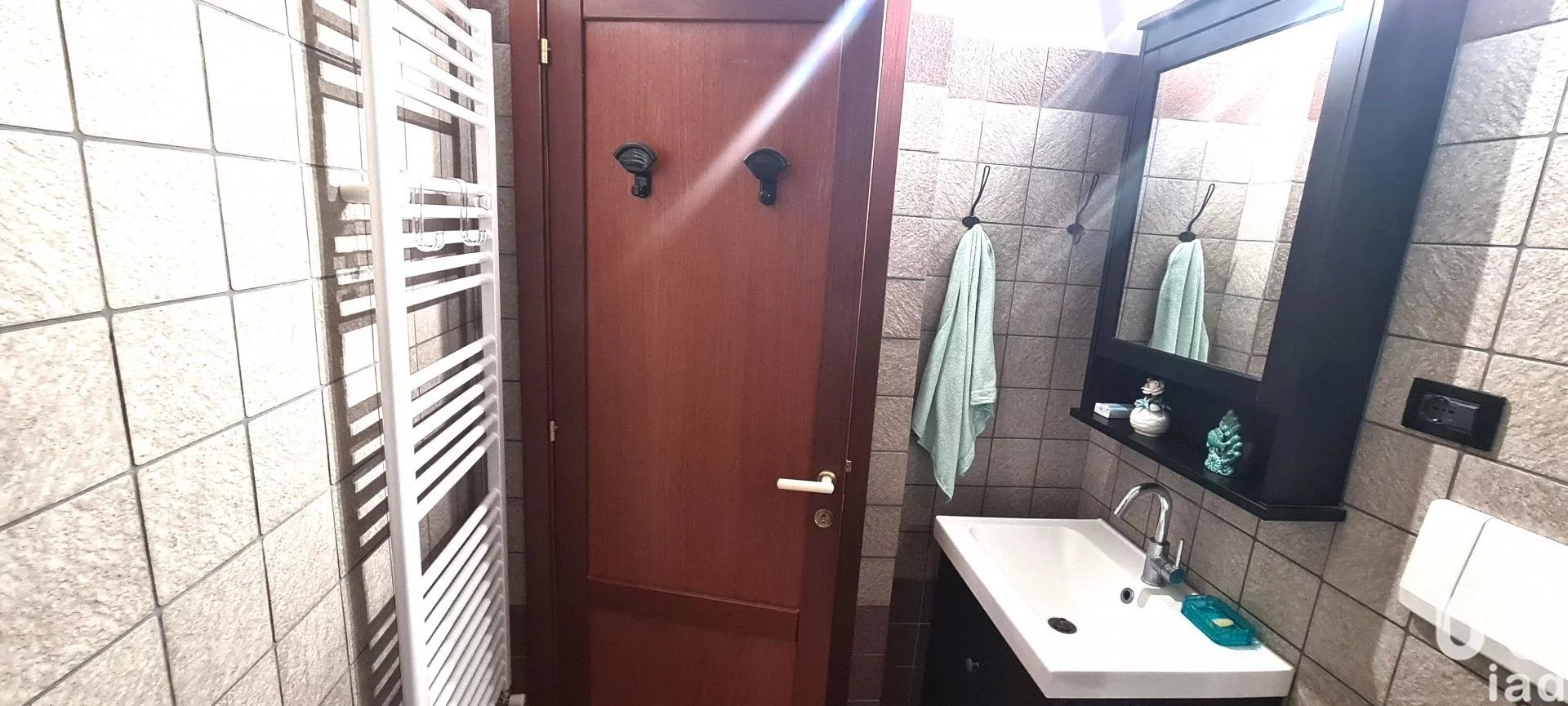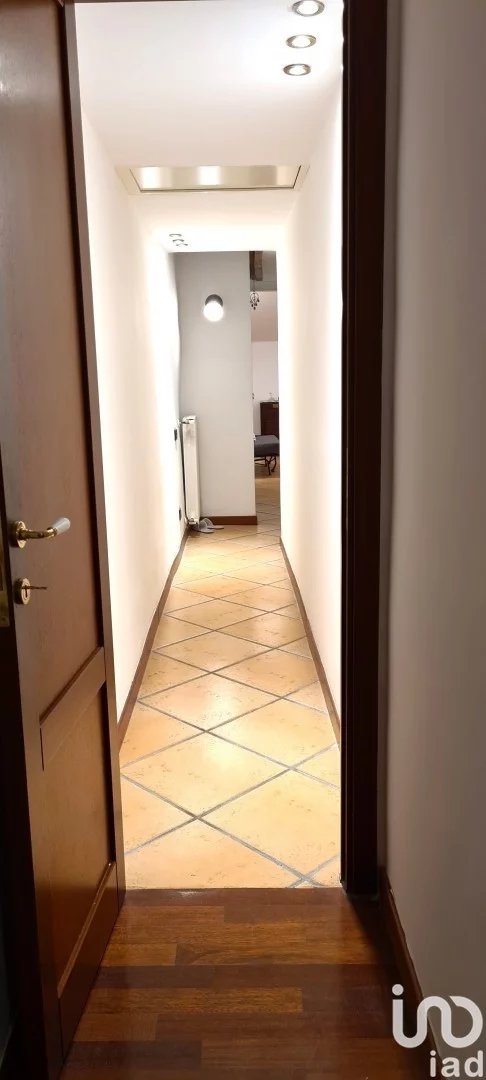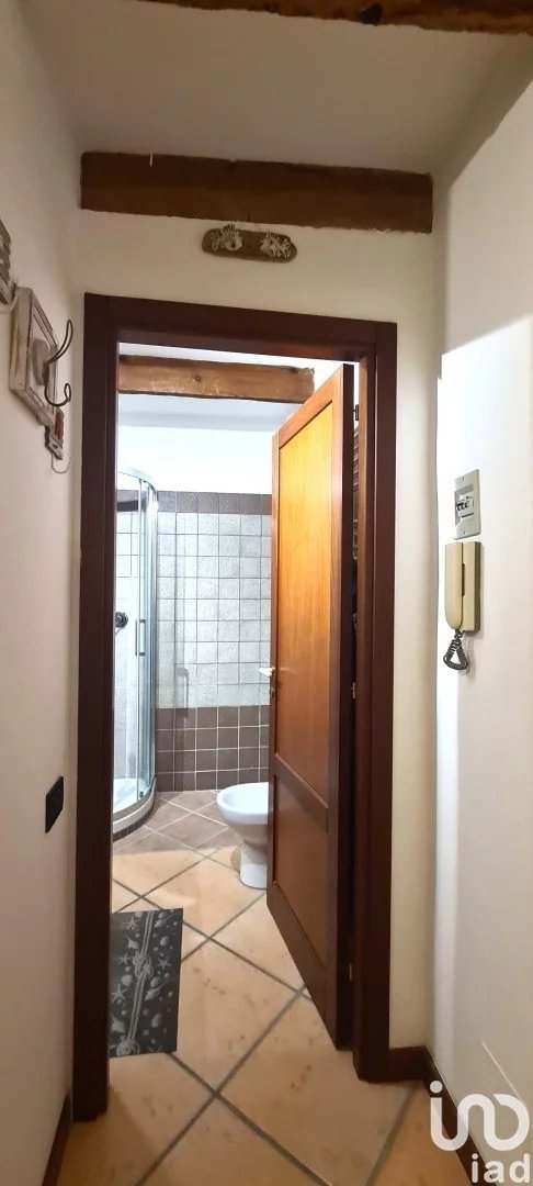 Il bagno con doccia e scalda salviette, un corridoio che ci porta alla camera da letto matrimoniale esposta su pz. Sciesa.