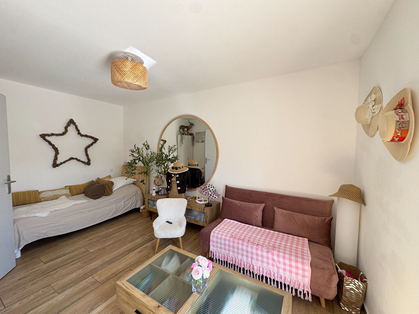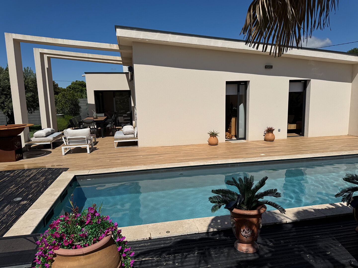 MAZAN-CARPENTRAS VILLA HYPER-CONTEMPORAINE T4 130M² AVEC PISCINE SUR TERRAIN DE 548M² Proche du village de Mazan, dans un environnement résidentiel paisible. Cette belle villa contemporaine de plain-pied de 130m² environ sur un terrain de 548m² séduit par ses lignes épurées et son style architectural résolument moderne. Construite en 2018, elle s'offre une façade qui s'harmonise avec une structure originale. Le jeu de volumes et la pergola apportent caractère et légèreté à l'ensemble. L'espace extérieur est pensé et orienté vers la détente et le confort. Une piscine rectangulaire s'intègre dans une grande terrasse en bois naturel prolongée par un coin salon, encadrée par un jardin paysagé et arboré offrant un cadre de vie cosy. Des grandes baies coulissantes ou à galandages permettent un accès fluide à toutes les pièces de la maison au Sud et à l'Est favorisant la luminosité. Les ouvertures verticales renforcent l'aspect moderne et actuel. La pièce de vie offre un espace convivial et raffiné : un joli salon prolongé par une salle à manger à l'atmosphère chaleureuse s'ouvre vers le jardin. La cuisine ouverte, fonctionnelle et accueillante, intègre un coin repas avec un ilôt centras. Trois chambres ouvertes vers le jardin. Une salle d'eau et des toilettes. Un dressing séparé avec salle d'eau et toilettes. Une grande buanderie. Côté jardin, une belle terrasse sous pergola permet de recevoir dans un cadre naturel. Climatisation réversible. Autonome en électricité. Un carrelage, uniforme intérieur/extérieur "effet bois" allie le charme naturel du parquet avec la praticité du grès cérame. Des menuiseries alu double vitrage. Un garage pour recevoir des vélos ou du stockage. "Un coup de coeur pour une villa avec son jardin et sa piscine soignés dans les moindres détails". TF. : 1500 euros PERNES LES FONTAINES, SAINT DIDIER, VENASQUE, BEDOIN