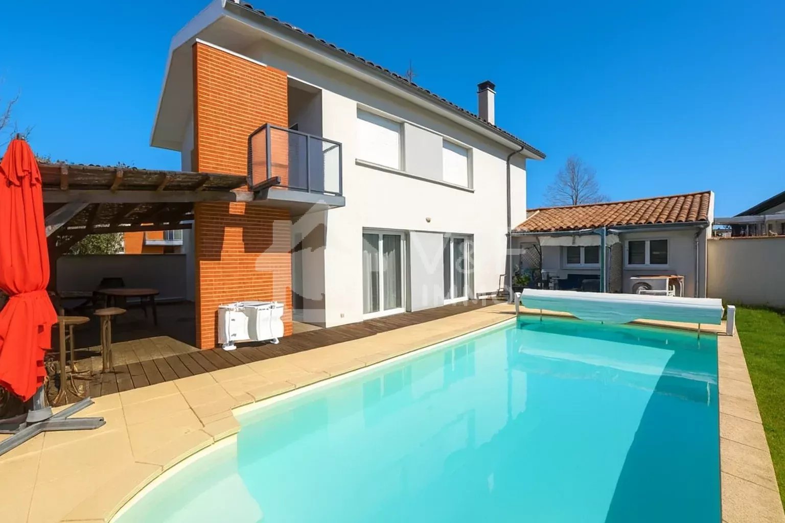 Je vous invite à venir vous prélasser sur la magnifique terrasse de 19m² ombragée par une tonnelle en bois réalisée par un artisan local puis à plonger dans la très belle piscine chauffée et profiter des belles pièces à vivre du rdc et de l'étage.
