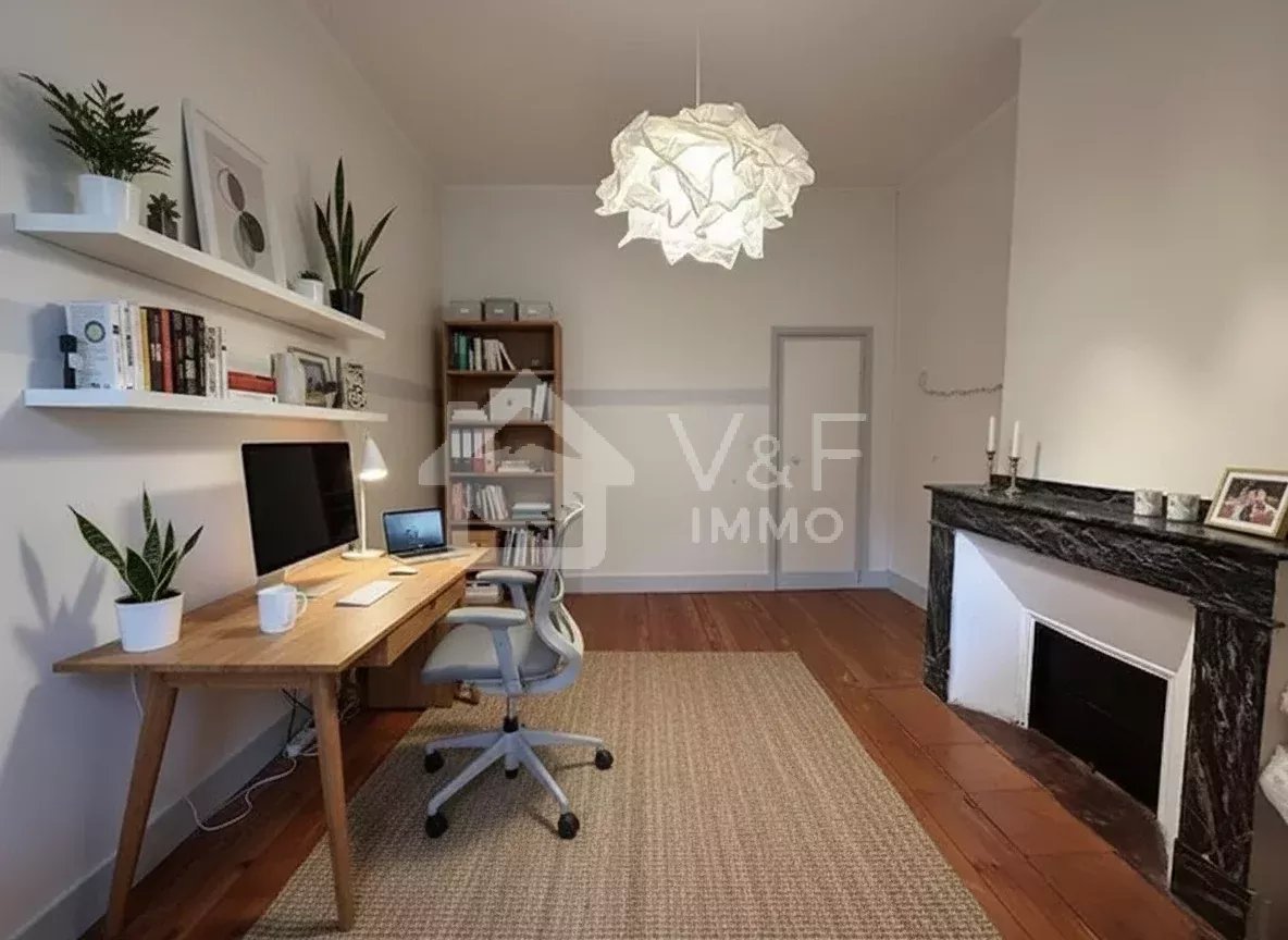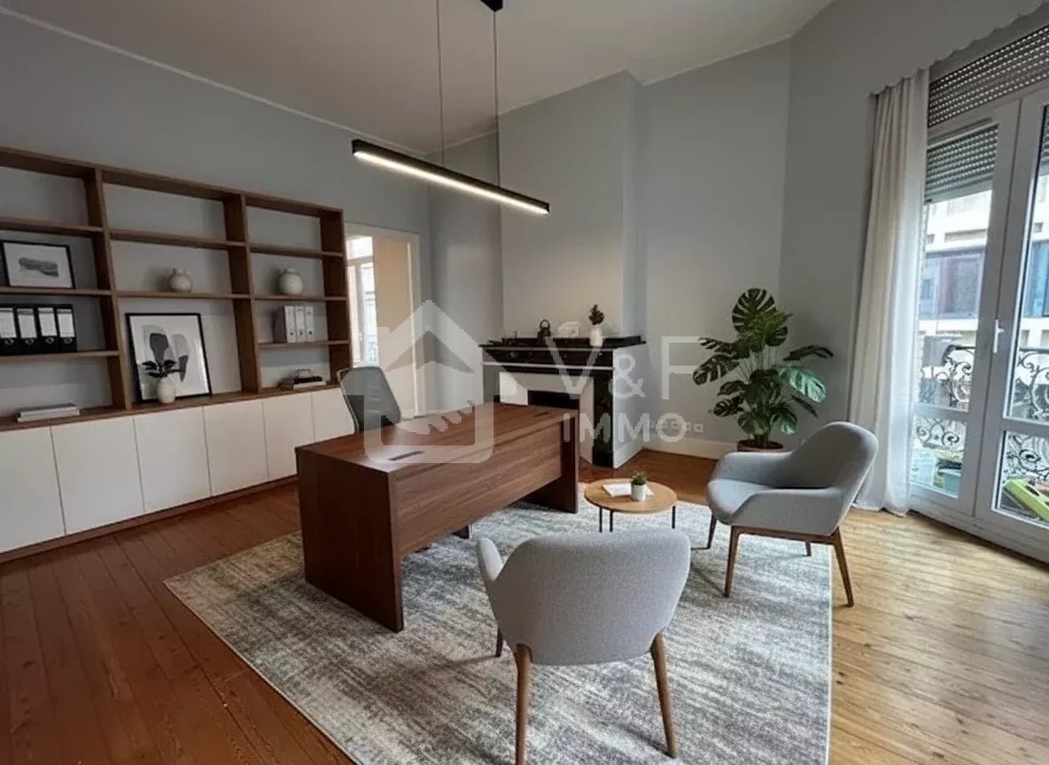 idéalement situé dans une petite copropriété de 7 logements, je vous propose à la vente ce magnifique bien d'une superficie de 107m² situé au 1er étage d'un immeuble de 1900. Cet appartement a la particularité de posséder 2 portes d'entrée ce qui en fait un bien idéal pour créer des bureaux ou toute activité pour une profession libérale. Il fut autrefois la résidence principale d'un médecin ainsi que son cabinet médical, il peut donc être pensé pour une seule destination ou combiner vie professionnelle et habitation principale. L'alliance des matériaux anciens (briques, parquet bois,cheminées en marbre, moulures) et le confort des prestations récentes ( climatisation réversible, chaudière gaz à condensation, menuiseries en aluminium, volets électriques), la hauteur sous-plafond (3m20) et son emplacement confèrent à cet appartement tout le charme et le cachet tant recherché. Des celliers d'une superficie de 13m² environ vous offriront du rangement supplémentaire. Je serai ravie d'organiser avec vous votre prochaine visite.