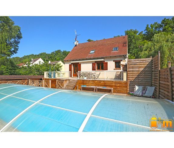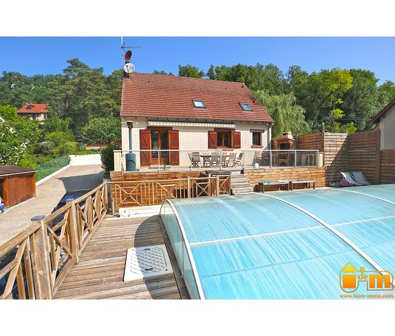 Attenant à la partie dhabitation, une terrasse carrelée avec barbecue maçonnée avec pool house aménagé en dessous (12 m² comprenant vestiaire, et salle deau avec W-C de type sanibroyeur). Piscine couverte (motorisée) avec pompe à chaleur.