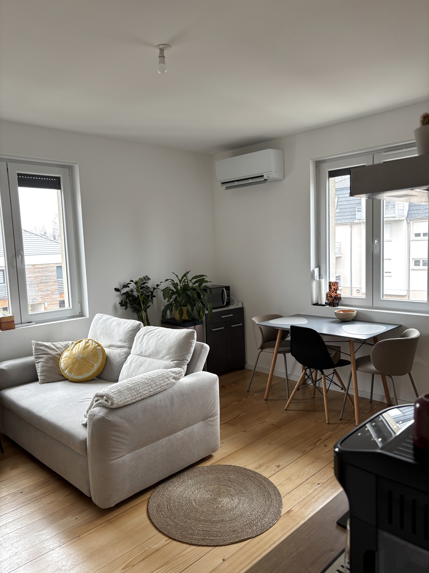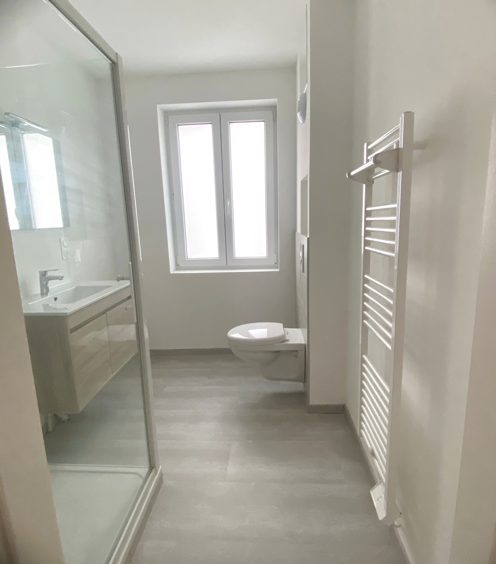 Appartement 2 pièces de 41,62m2 situé au 1er étage sans ascenseur. Il se compose d'une entrée, d'une belle chambre de 14,98m2, d'une salle d'eau avec wc de 5,04m2 (meuble évier avec luminaire, emplacement machine à laver et sèche serviette) et d'une pièce de vie avec cuisine équipée de 18,05m2 (meuble haut et bas, emplacement lave-vaiselle, four, plaque de cuisson (induction) et hotte). Une cave et deux places de stationnement exterieures complètent la location.