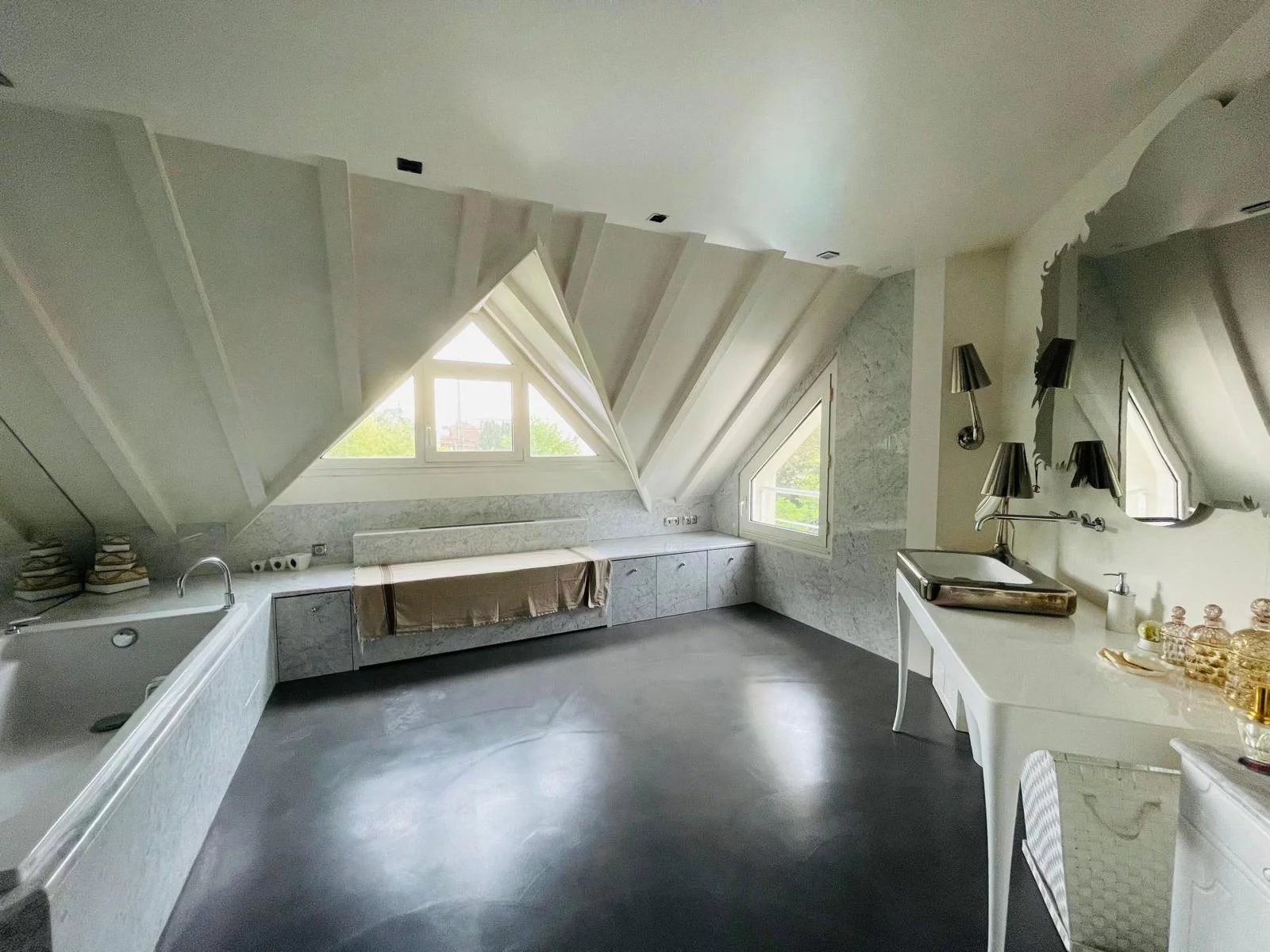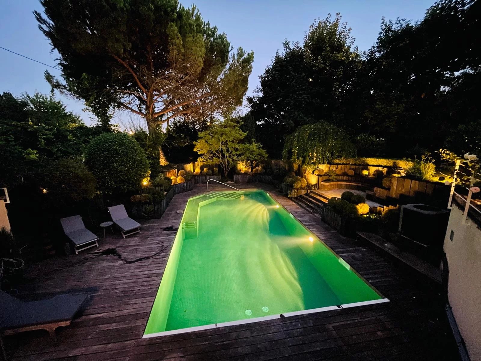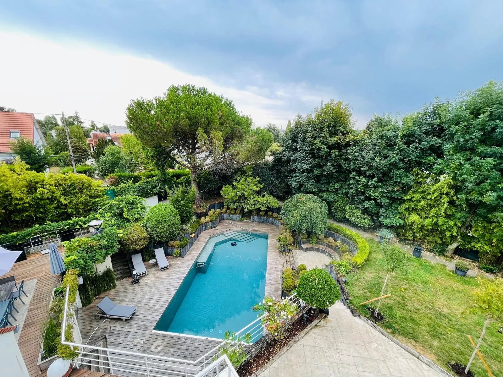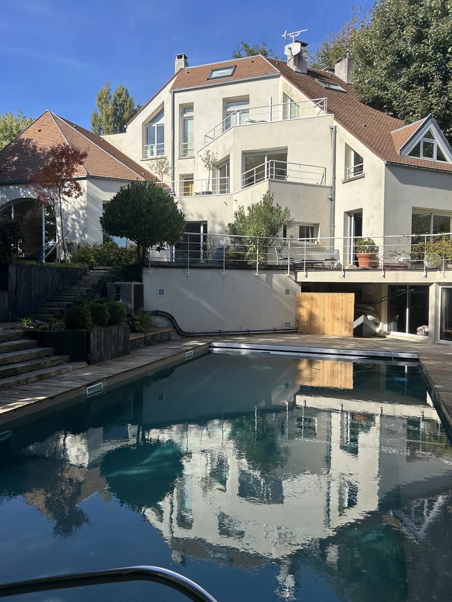 Magnifique propriété paysagée sur les hauteurs de Garches à proximité du golf de Saint Cloud, avec piscine. En poussant la porte de ce bien d'exception niché au cœur d'un quartier résidentiel recherché, vous pénétrez dans un écrin de verdure de 1100 m2, parfaitement isolé du monde et totalement refait par des paysagistes. Une piscine chauffée entourée d'une plage en bois et d'une verdure luxuriante en fait un havre de paix inédit. Ce bien aux volumes rares baigné de soleil et de lumière est composée d'une villa contemporaine d'architecte sur 2 étages de 507m2 pleine de charme et de cachet et en parfait état et d'un studio indépendant refait à neuf. Au rez-de-chaussée, Une galerie d'entrée permet d'accéder à un salon de 63 m2 avec cheminée, au majestueux plafond cathédrale, ouvert sur l'une des terrasses du jardin par deux grandes baies vitrées, sans aucun vis-à-vis. Une belle cuisine dînatoire ouvre sur une seconde terrasse où il fait bon prendre ses repas en toutes saisons. Un petit salon / boudoir avec cheminée ouvert sur le jardin Une chambre avec sa salle d'eau Des toilettes invités Deux magnifiques escaliers permettant d'accéder aux étages supérieurs Un ascenseur dessert chaque niveau Au 1er étage Deux suites avec terrasses indépendantes dont une avec un immense dressing, une salle de bains et des toilettes privatives et la seconde avec une salle d'eau et des toilettes. Au 2ème étage Deux chambres avec mezzanines, terrasses indépendantes, salle d'eau, salle de bain et toilettes Au niveau inférieur Un salon de cinéma entièrement équipé et ouvert sur la piscine et le jardin. Un hammam, des toilettes De nombreux espaces de rangement, une buanderie, des locaux techniques et deux caves. Un garage pouvant accueillir jusqu'à 5 voitures et 2 motos A proximité de la piscine Un studio de service indépendant entièrement refait, accessible par le jardin