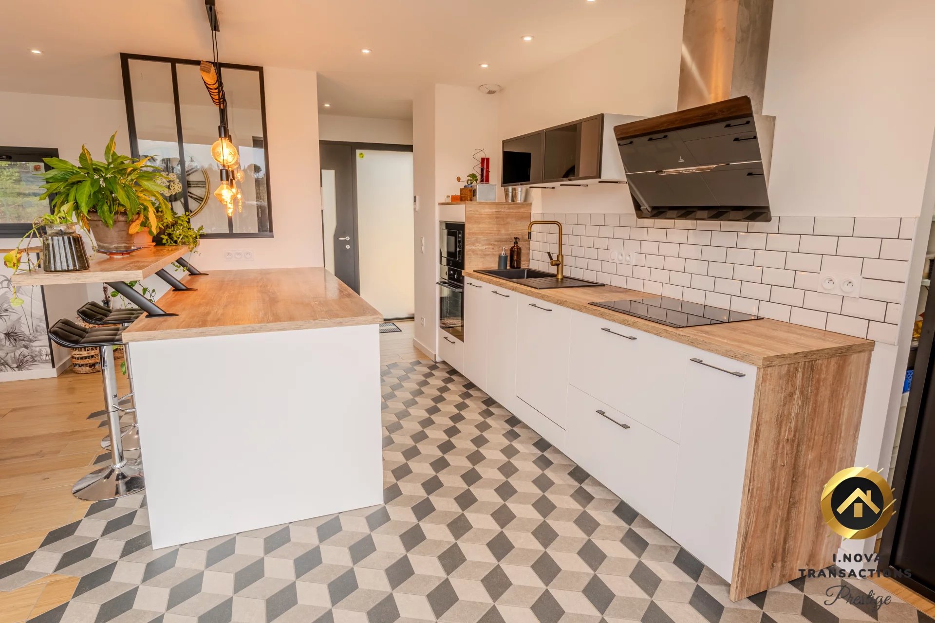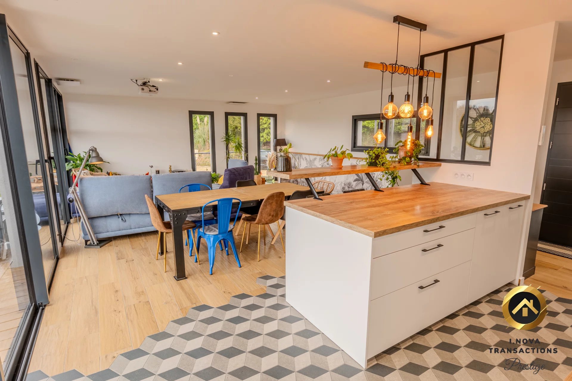 La cuisine, entièrement équipée, s’intègre harmonieusement à la salle à manger et au salon, formant un ensemble convivial et fonctionnel.