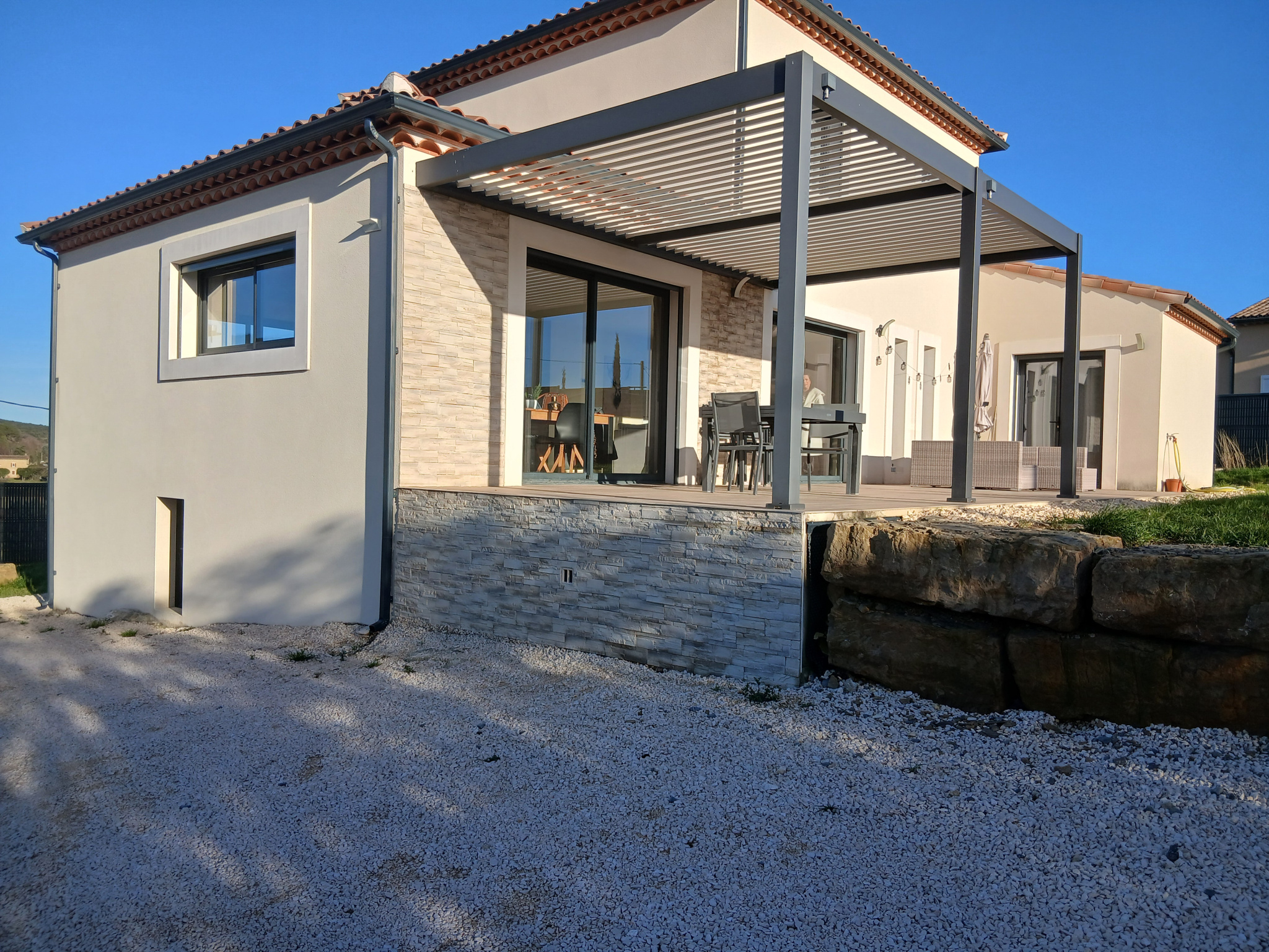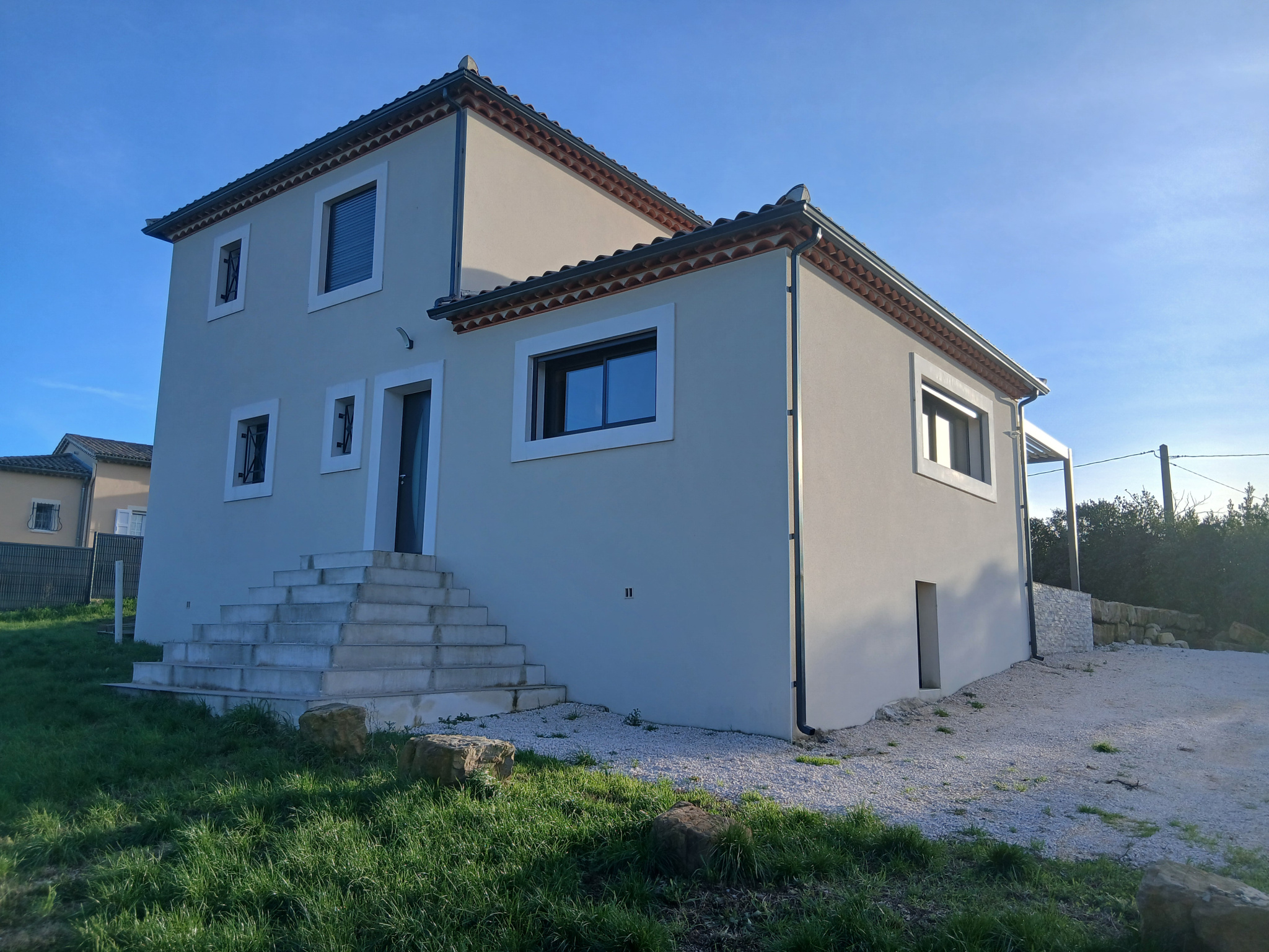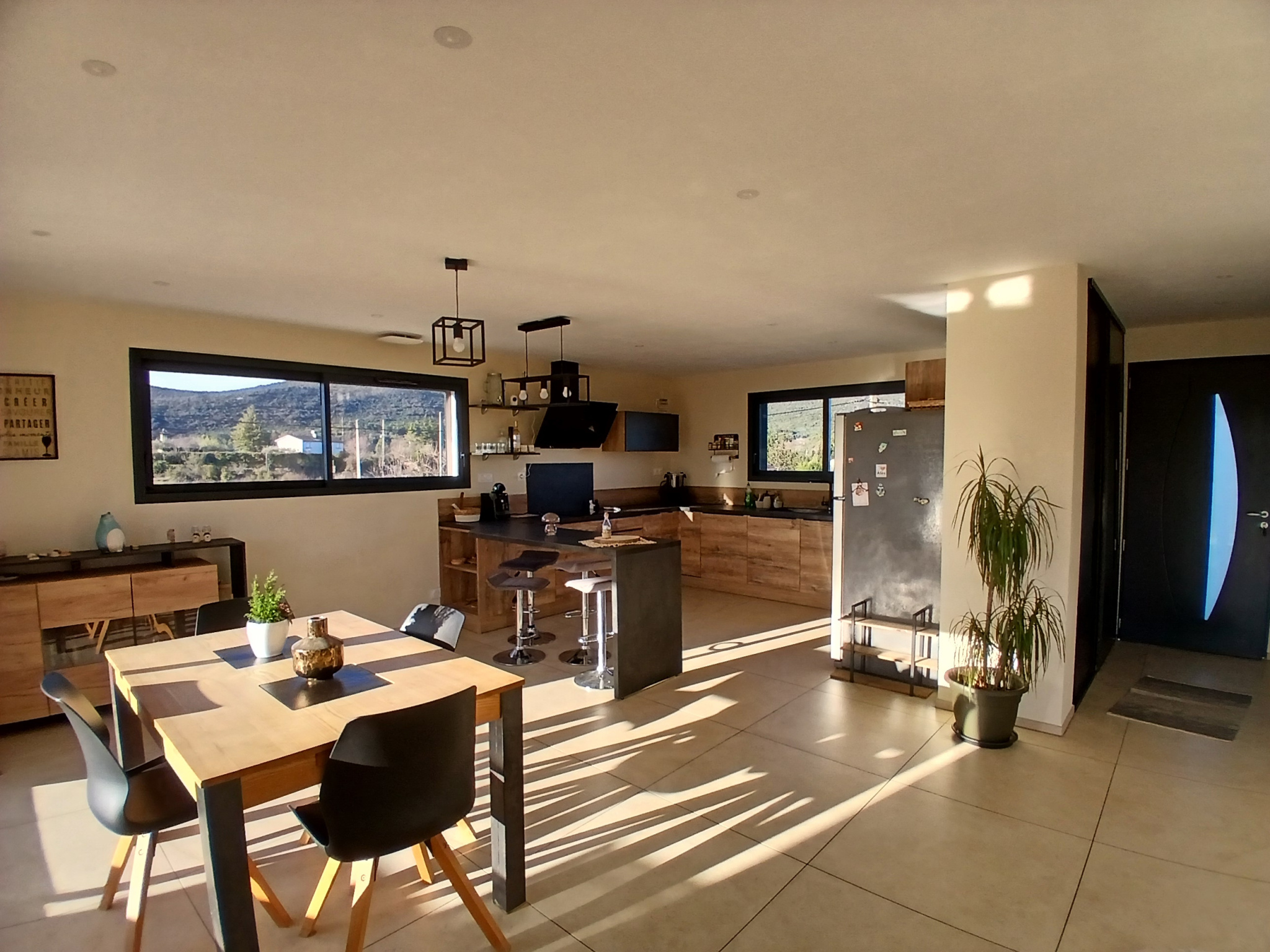 Villa récente de 130 m2 habitables sur 1650 m2 de terrain entièrement clôturé avec portail électrique. Comprenant au rez de chaussée : hall d'entrée avec rangement, pièce de vie de 55 m2 avec baies vitrées ouvrant sur une terrasse disposant d'une pergola bioclimatique, cuisine équipée moderne, cellier/buanderie, bureau, suite parentale ( dressing et salle d'eau ) donnant également sur la terrasse et au 1er : deux chambres de 13 m2 et 14.50 m2, salle d'eau. Climatisation gainable. Construction RT 2012, garantie décennale, prestations de qualité.