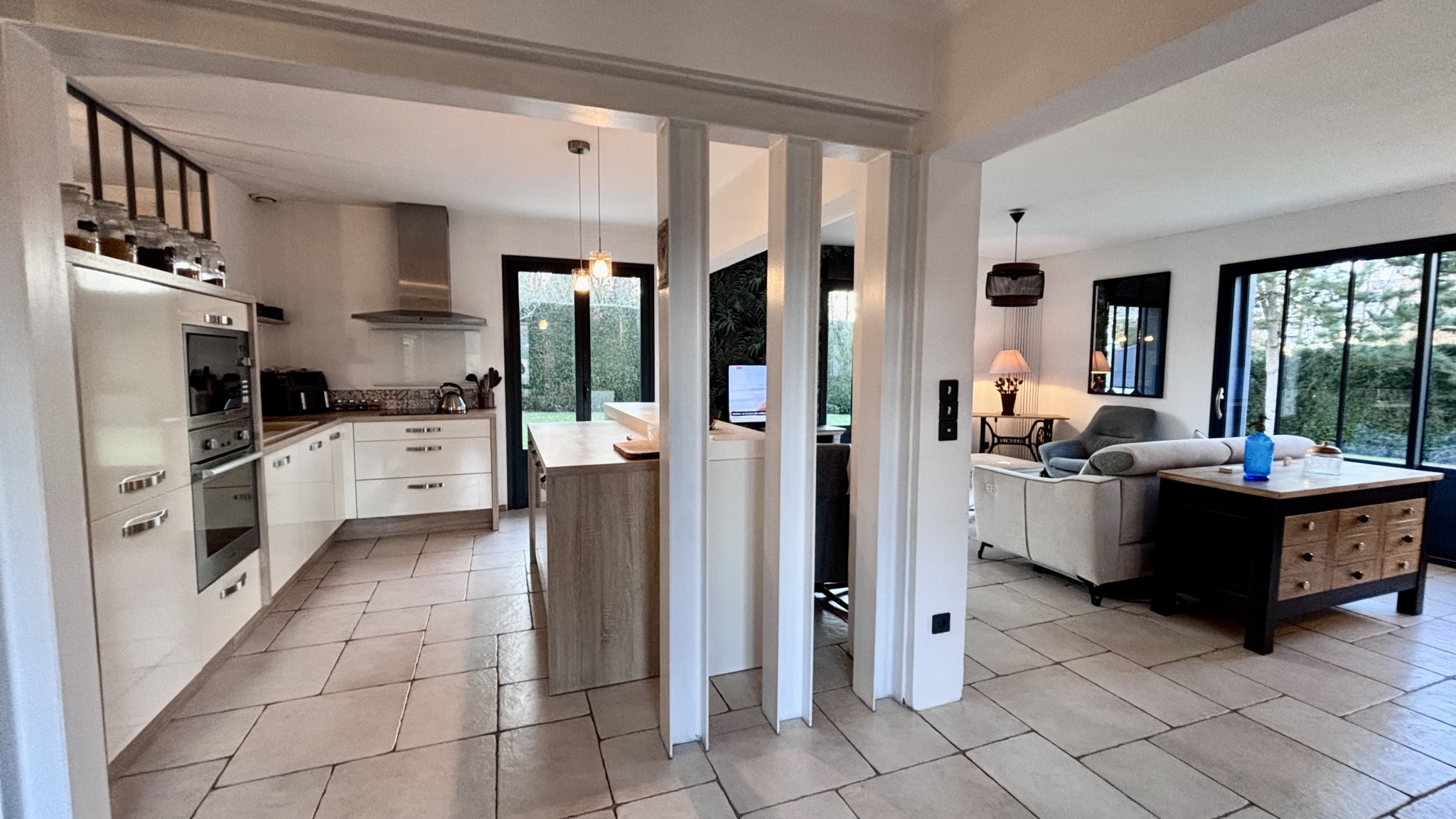 COUP DE COEUR, POSEZ-VOS VALISES! SOISSONS: idéalement située à seulement 15 minutes à pied du centre-ville, et à 15 minutes à pied de la gare dans un environnement calme et à proximité de toutes les commodités, cette propriété habitable de plain-pied de 173m2 se compose d'une entrée accueillante et spacieuse avec placards, un espace de vie ouvert de plus 60 m2 avec un poêle à bois orientable, une cuisine ouverte totalement équipée, un espace nuit comprenant: wc, 3 chambres (dont une qui est actuellement utilisé comme dressing, et une autre comme bureau disposant d'un accès indépendant: idéal pour les professions libérales), salle de bains avec double vasques, et une partie buanderie chaufferie, à l'étage: une vaste pièce palière baignée de lumière de plus de 40m2, 2 chambres (une de plus de 18m2 et une de d'environ 9m2), une salle d'eau avec wc. Vous serez séduit par ses volumes généreux, son agencement parfaitement étudié, et ses nombreuses ouvertures qui la rendent extrémement lumineuse et agréable à vivre. Côté extérieur: double terrasse (total d'environ 50m2) un car-port 2 véhicules, un garage servant de stockage, et un appentis pour le bois, Terrain entièrement clos et sans vis-à-vis de 1345m2.