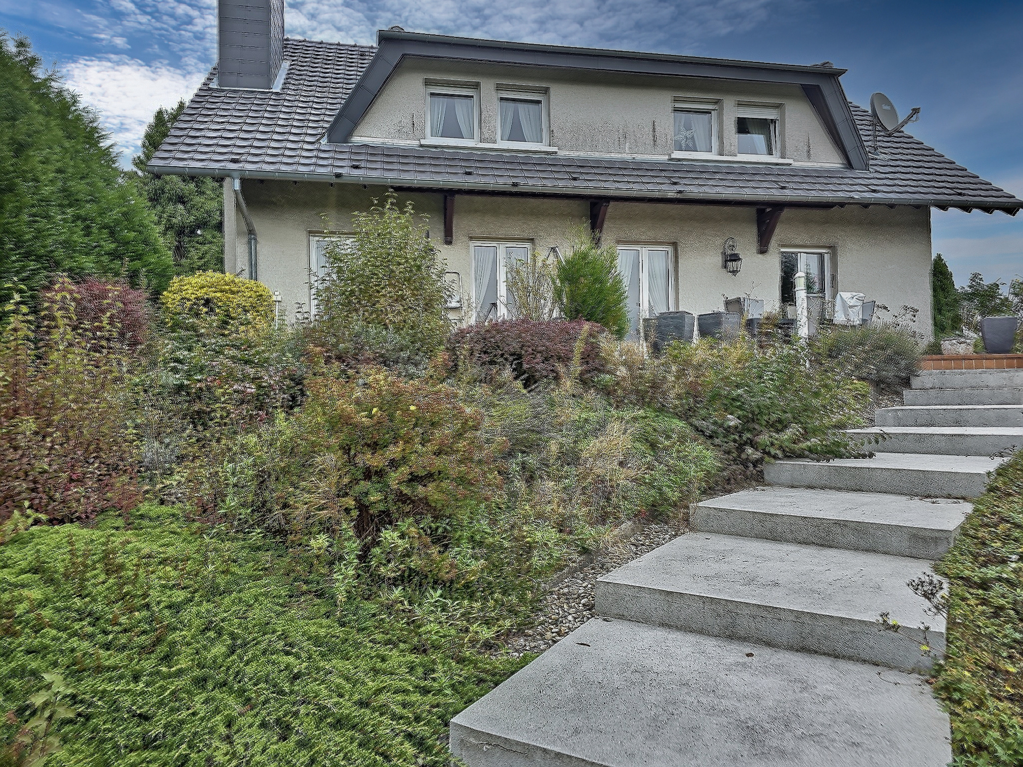 Das 1423 Qm große, gepflegte Grundstück bietet eine ruhige, grüne Umgebung ideal, um die schönen Tage im Freien zu genießen.