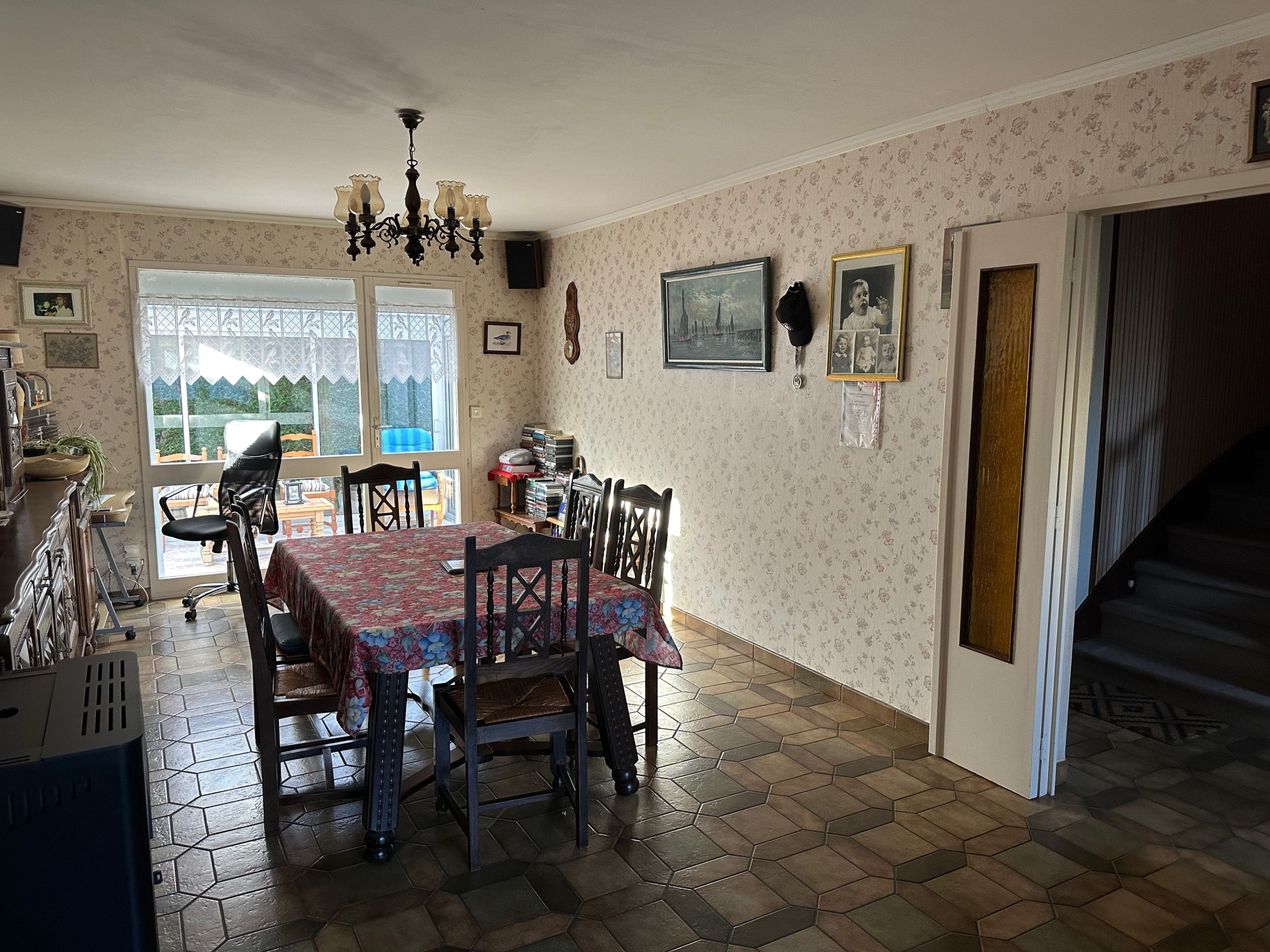 D'une surface habitable d'environ 92m2, cette maison en bon état général maison offrant au rez-de-chaussée: entrée, salon séjour avec poêle, véranda, cuisine aménagée et équipée indépendante, wc, cellier