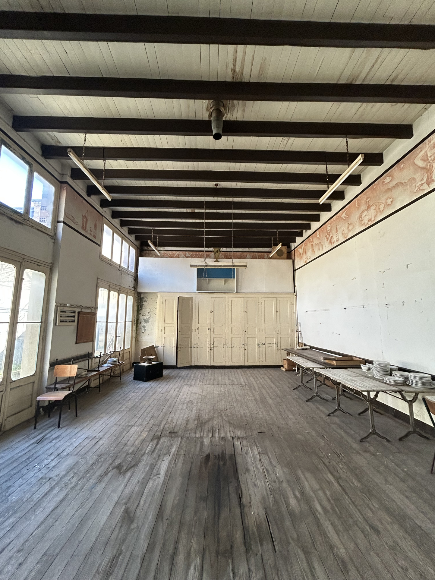 Immeuble traversant avec garage, 450 m2 à aménager. Idéal pour un projet touristique ou de restauration, ou atelier d'artiste (imposante hauteur sous plafond). Grande salle de réception. Situation idéale au coeur du village.